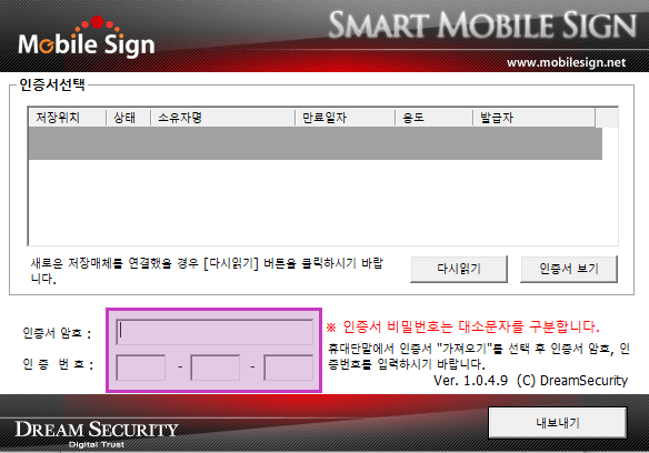 설치를 마치고 나면 아래와 같은 인증서 내보내기 안내 팝업창이 뜬다. 스마트폰으로 인증서 내보내기 버튼을 다시 클릭하면 인증서 암호와 인증번호를 입력하는 새로운 창을 볼 수 있다.