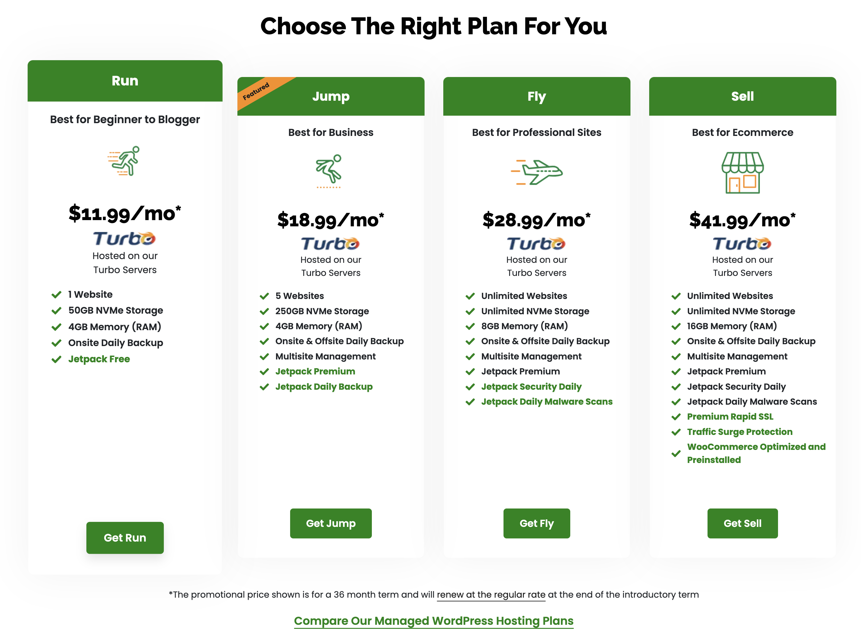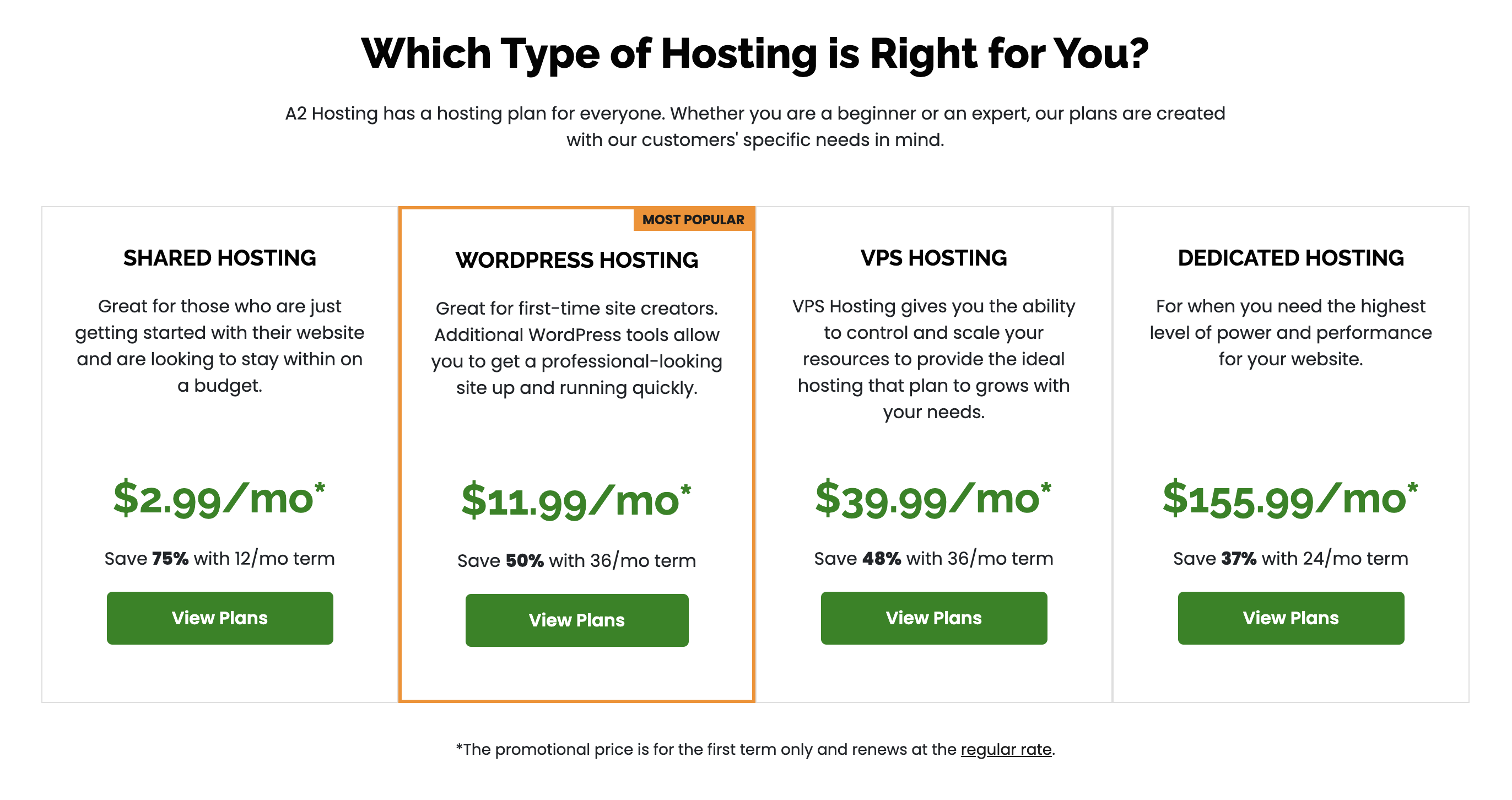 스크롤을 내리다 보면 어떤 타입의 호스팅이 당신에게 적합하냐는 메세지와 함께 여러가지 호스팅 종류가 안내되어 있다. 나는 워드프레스 블로그를 운영할 것이므로 Wordpress hosting 아래에 있는 View Plans 버튼을 클릭했다.