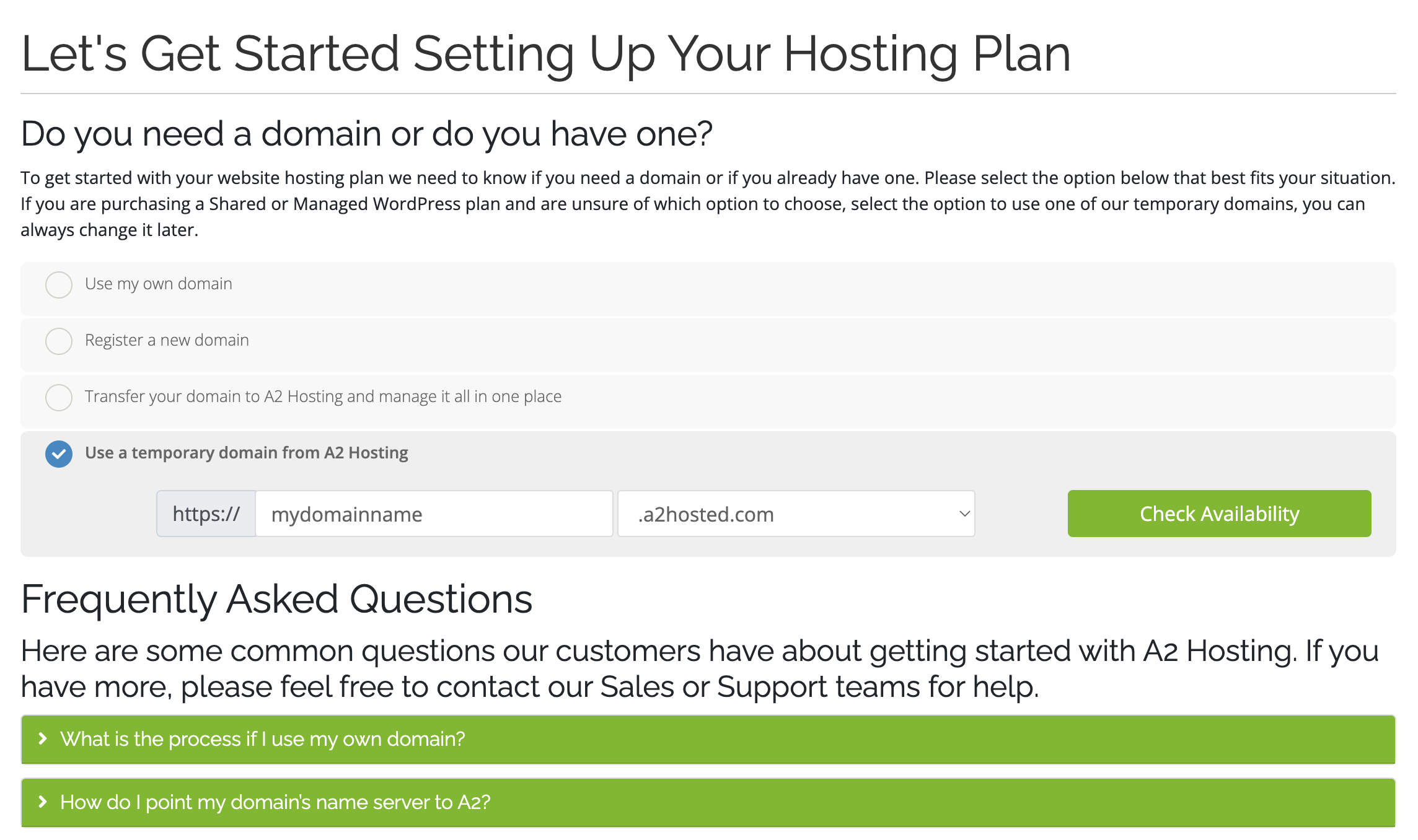 4번째 항목 Use a temporary domain from A2 Hosting을 선택하고 도메인 이름을 결정한 후에 Check Availability 버튼을 클릭하면 된다.