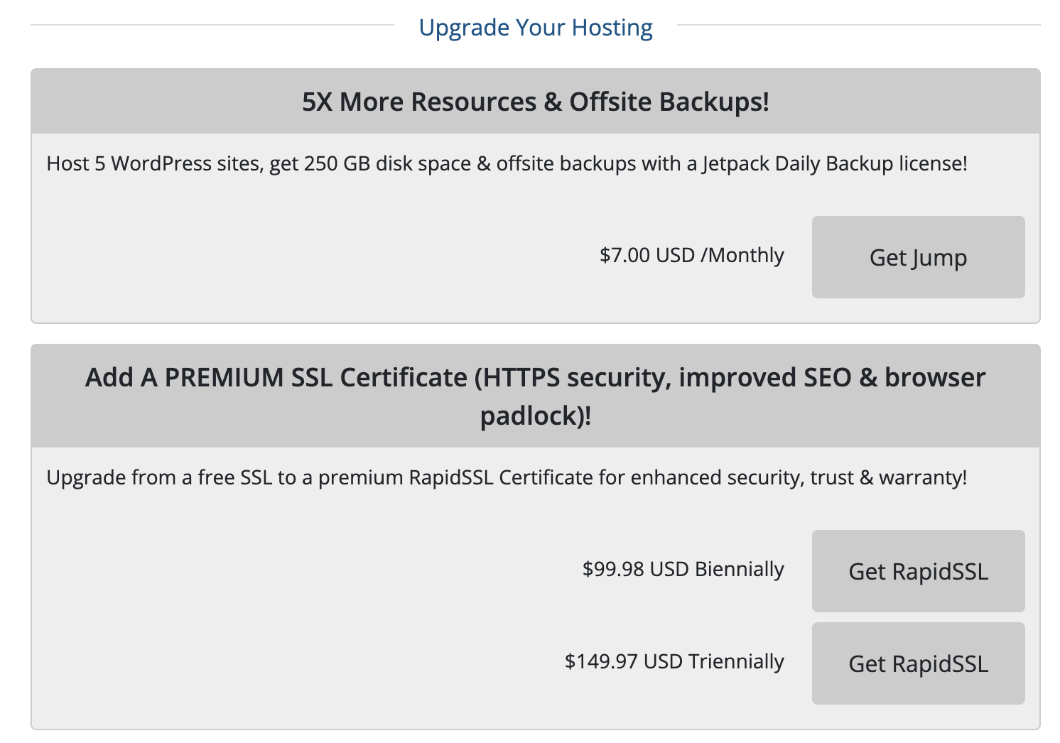 그 다음은 현재 선택한 호스팅을 업그레이드 하겠냐는 내용이다. 나는 현재 더 큰 용량의 호스팅이 필요하지 않고, 프리미엄 SSL 인증서도 사용할 의향이 없다. 패스!