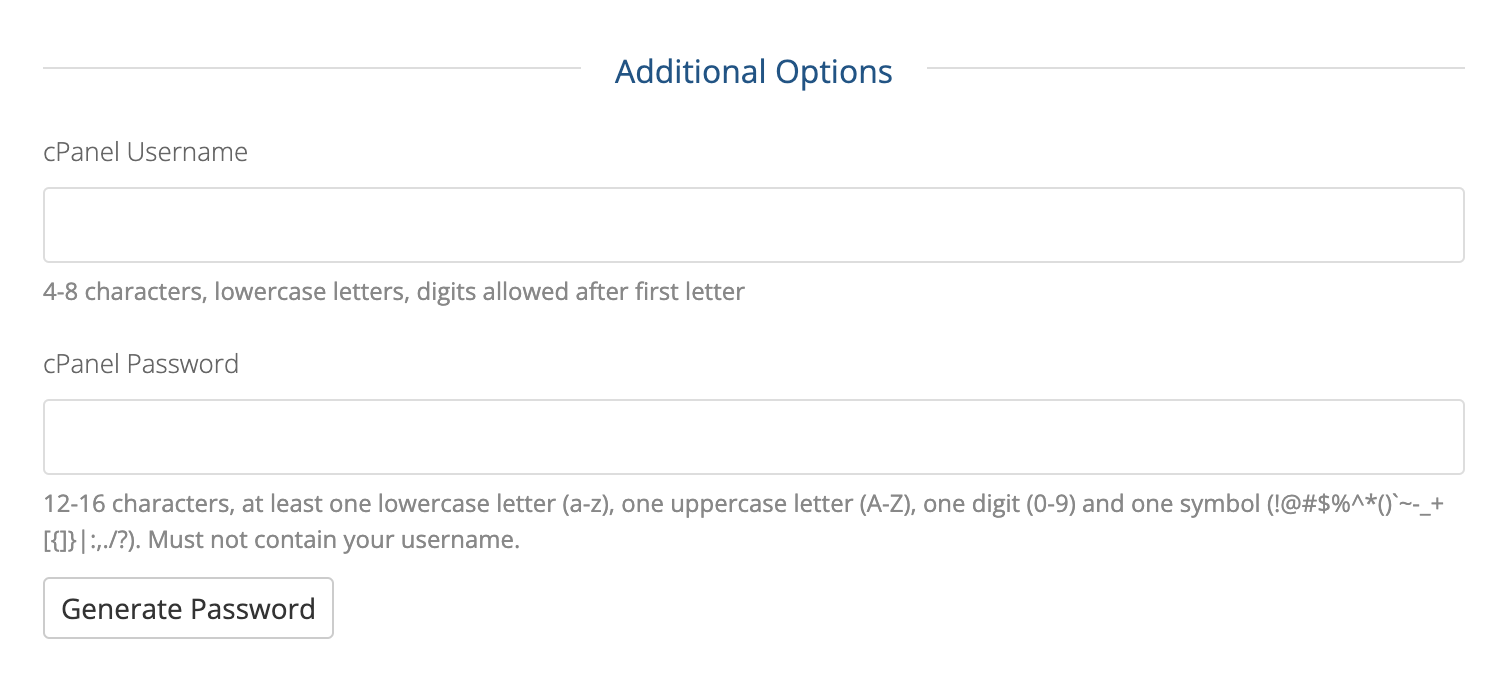 옵션 선택을 마지막으로 cPanal 계정을 생성해야 한다. Username과 Password를 입력한다.