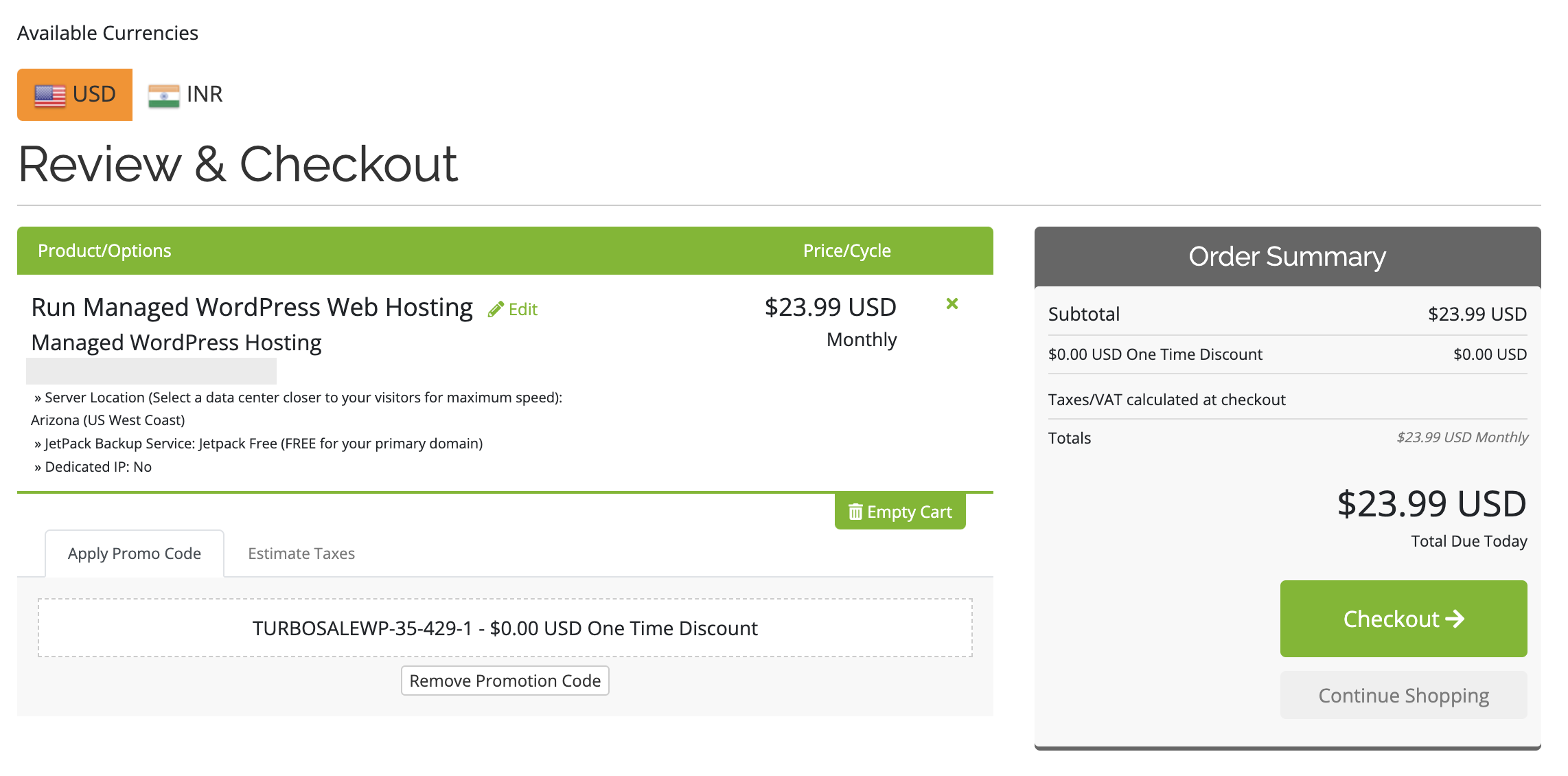 백업 서비스는 기본 도메인의 경우 무료로 제공되는 Jetpack Free를 선택하였고, 전용 IP도 사용하지 않을 예정이므로 체크박스를 그대로 비워 두었다.