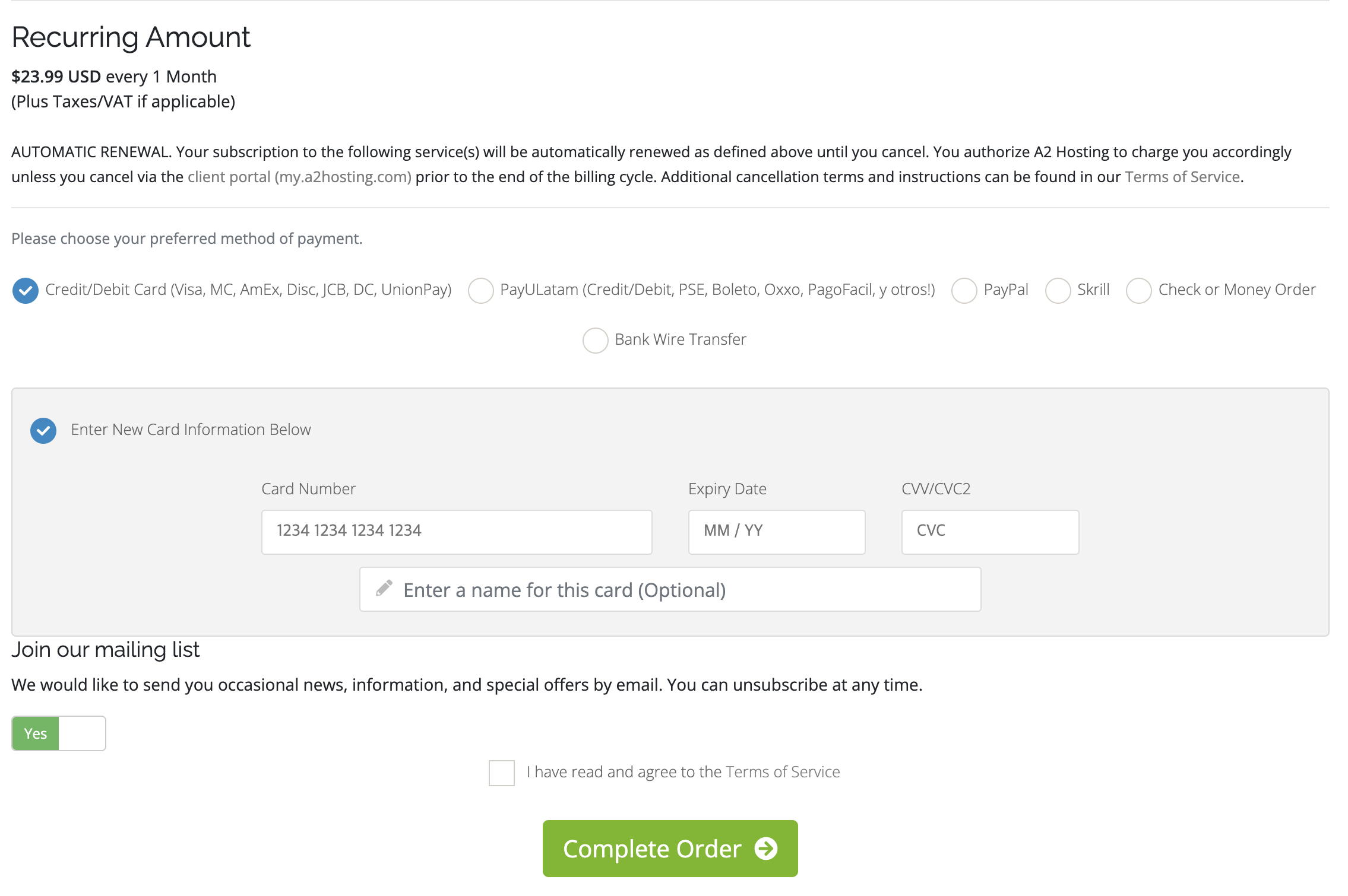 나는 신용카드 결제를 이용할 예정이라서 Credit/Debit Card(Visa, MC, AmEx, Disc, JCB, DC, UnionPay)를 선택하고 아래에 카드 정보를 입력했다. 입력 후에 Complete Order 버튼을 누르면 입력한 카드로 결제된다.