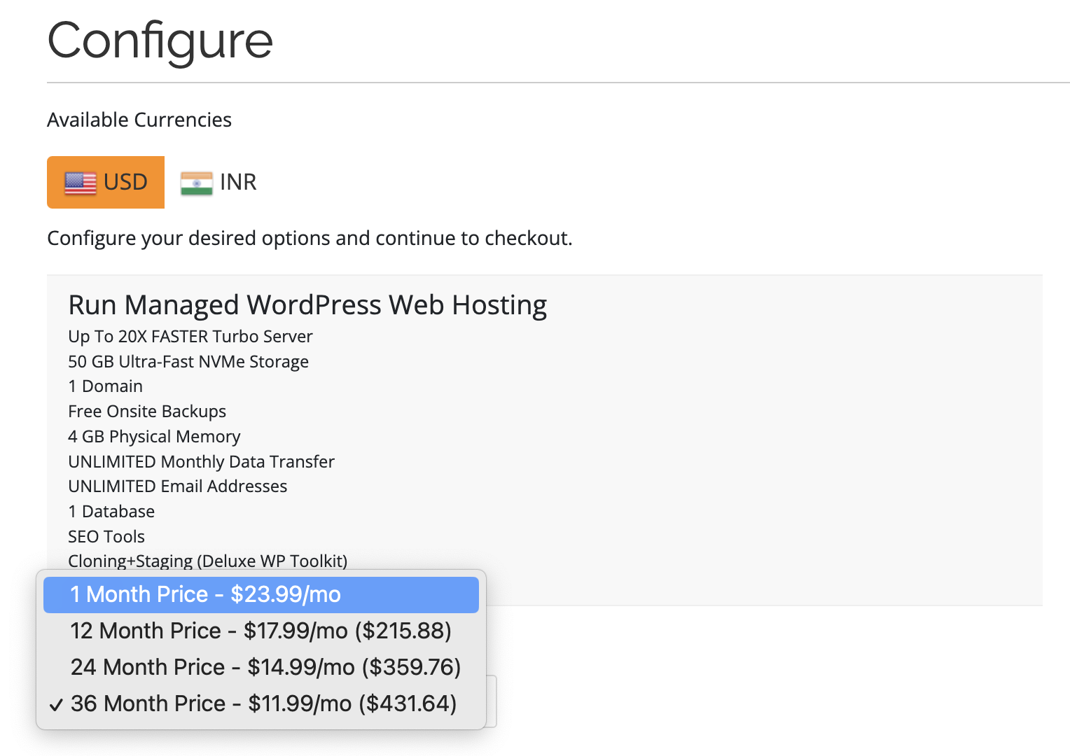 그 다음은 Configure 화면이다. 선택 옵션들이 있는데 하나씩 살펴보도록 하겠다. 가장 먼저 선택해야 하는 것은 결제 주기인데 많은 서비스가 그렇듯 한꺼번에 결제를 하면 할인을 해준다. 36개월을 한꺼번에 결제하면 할인율이 크지만 나는 초보이므로 최대한 리스크를 적게 가지고 가기를 희망한다. 두 배의 금액이 들더라도 일단은 한 달 단위의 결제를 선택했다.