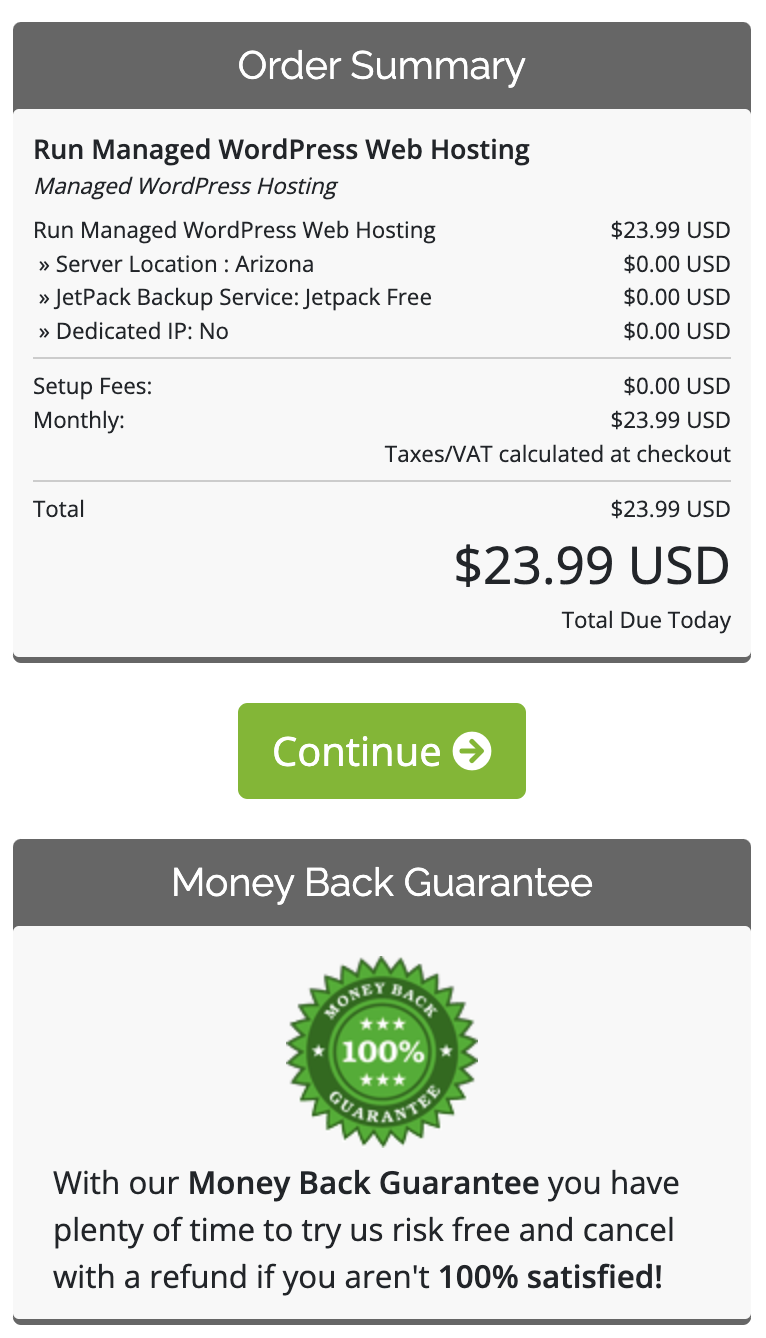 백업 서비스는 기본 도메인의 경우 무료로 제공되는 Jetpack Free를 선택하였고, 전용 IP도 사용하지 않을 예정이므로 체크박스를 그대로 비워 두었다.