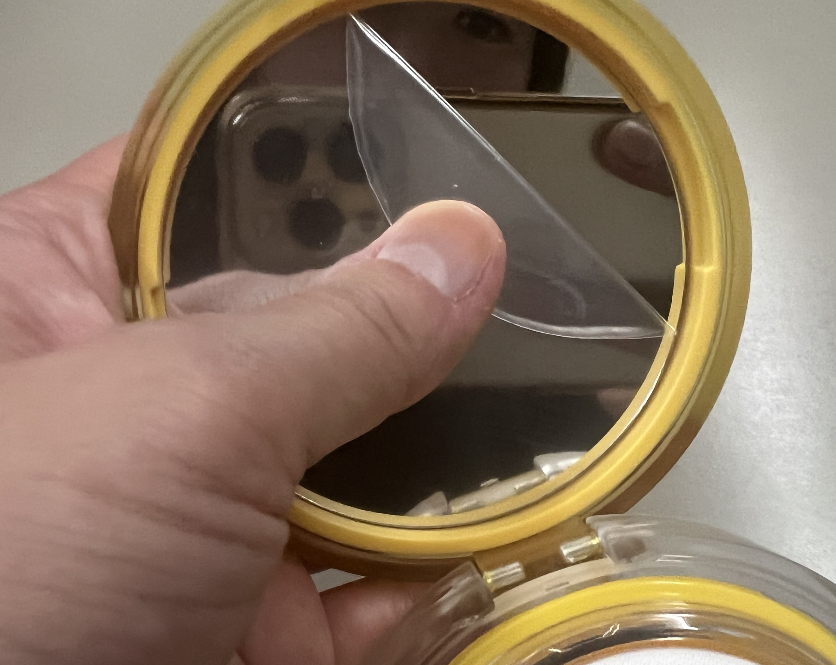 거울과 내용물이 있는 부분에 각각 비닐, 종이로 한번 감싸져 있어 떼어내고 사용하면 된다.