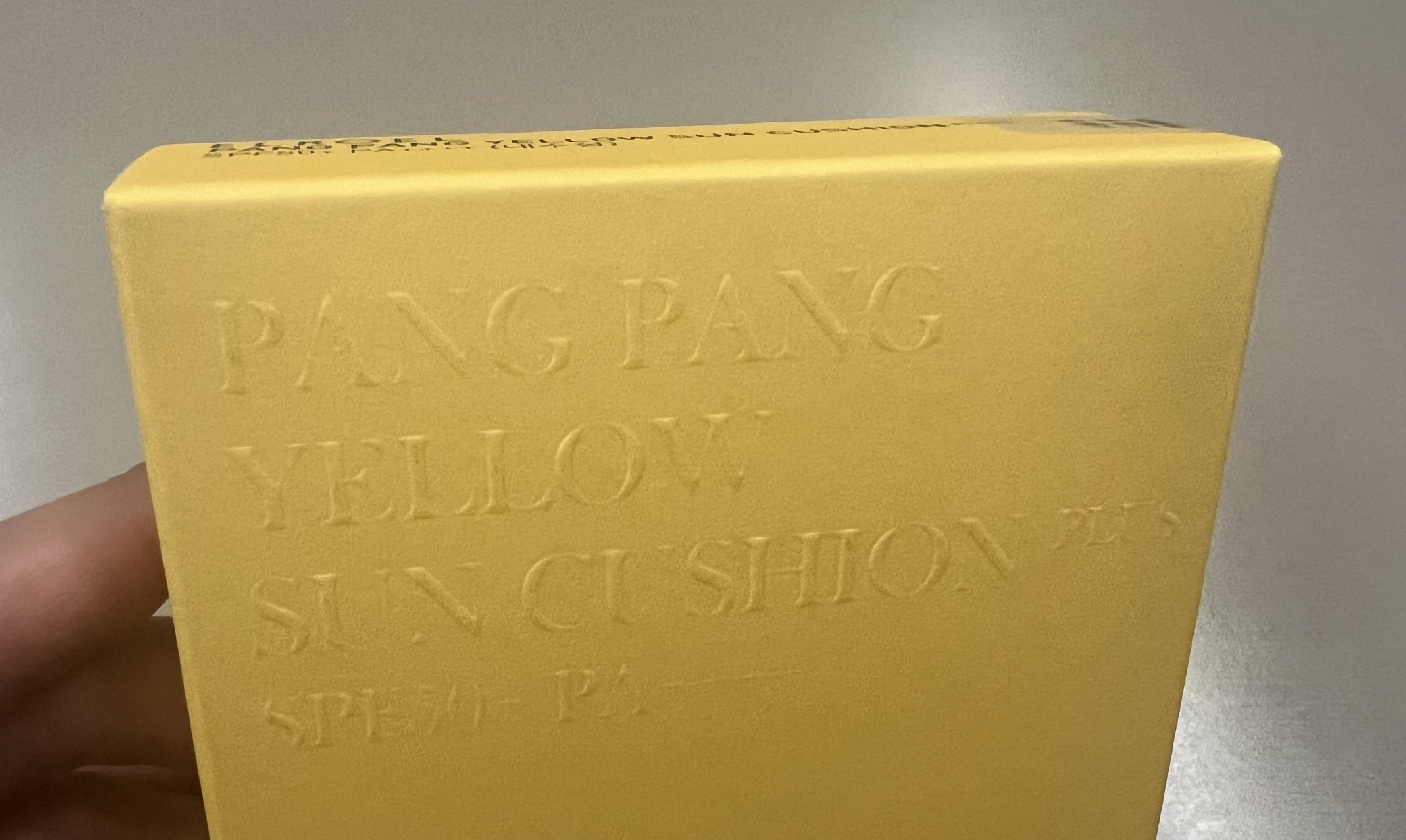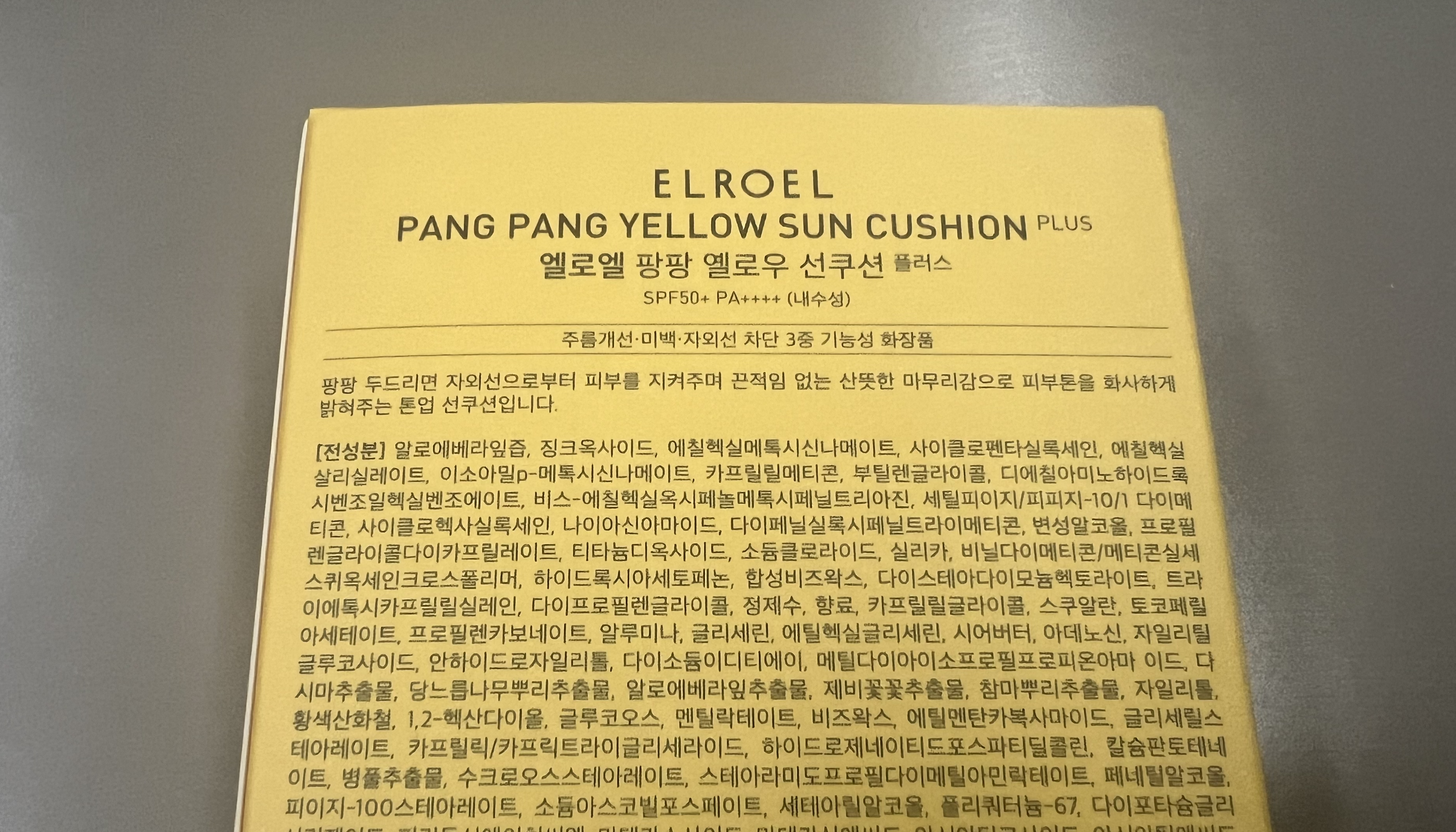 엘로엘 선쿠션은 노란색 박스에 담겨 있다. 자세히 보면 종이에 PANG PANG YELLOW SUN CUSHION 이라고 각인(?)되어 있다. 스펙을 간단하게 살펴 보자면 SPF50+PA++++ 내수성이다.