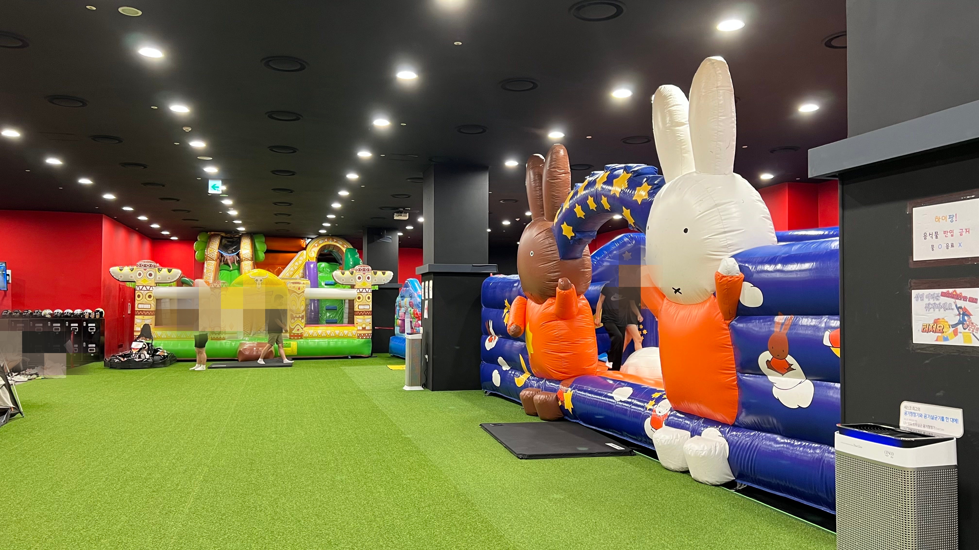 그 다음으로 이용한 것은 에어바운스존이었다. 넓은 공간에 다양한 사이즈, 테마의 대형 에어바운스들이 설치되어 있었다. 여기도 돌아다니면서 놀다보면 한시간 순삭! 공간이 넓어서 평소에 바깥놀이가 자유롭지 않은 아이들이 마음껏 신나게 뛰어다니는 모습을 보았다. 바닥이 푹신하여 넘어져도 다칠 염려가 없고... 이곳은 천국인가?