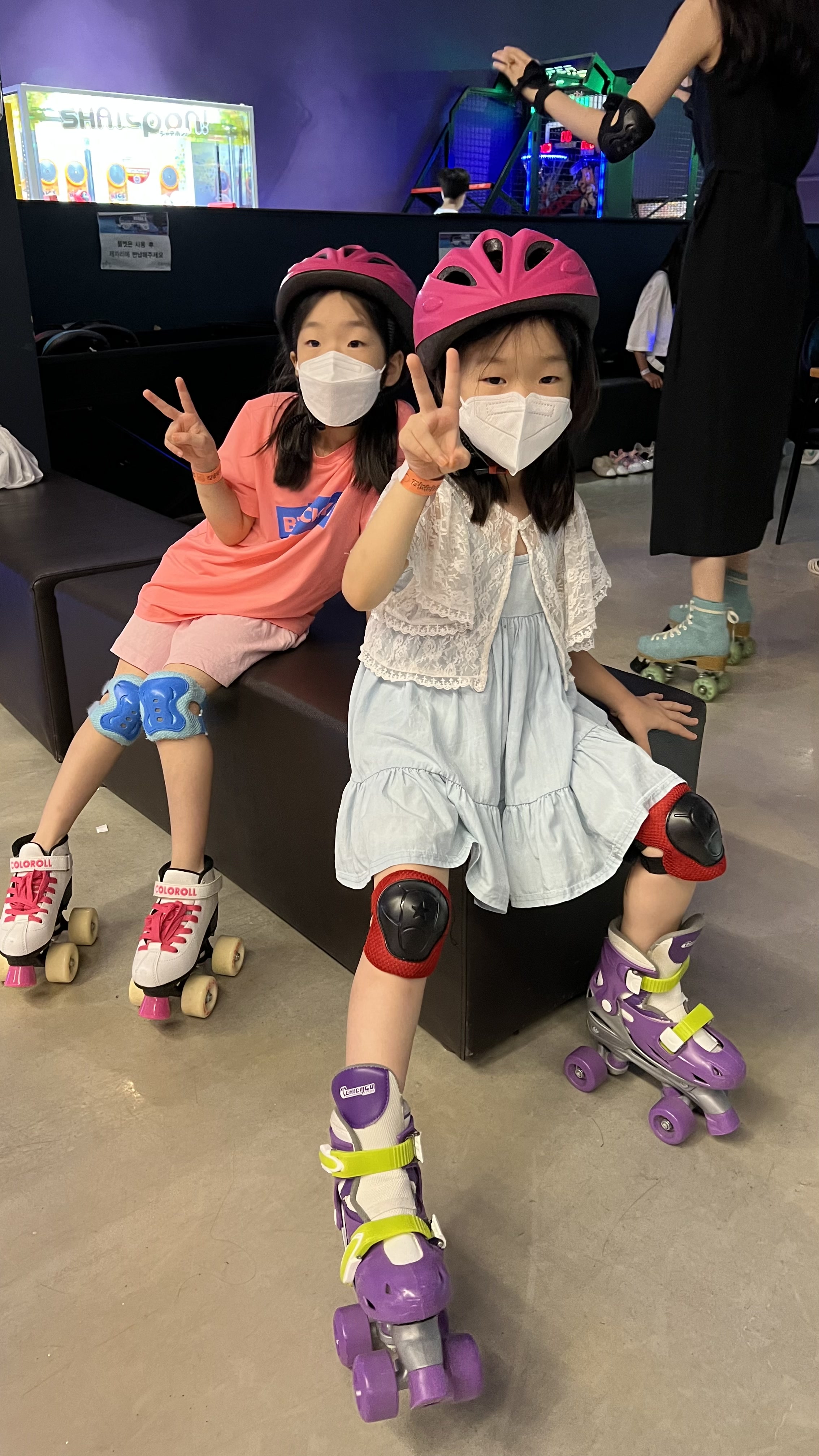 하이주에서 동물 구경을 하고 트렘폴린도 뛰고~ 그 다음으로 방문한 곳은 하이롤이라는 롤러스케이트장이었다. 아이들은 겨울에 얼음 위에서 스케이트를 타 본 적은 있지만 롤러 스케이트는 한 번도 타본 적이 없어서 사실 나는 하이롤을 이용할 생각이 없었다. 그런데 하이롤 공간을 본 첫째가 자기도 롤러스케이트를 타보고 싶다고 주장했다. 나도 롤러스케이트를 탈 줄 모르기 때문에 가르쳐 줄 수 있을까 싶었다. 그런데 데스크에 문의를 하니 가운데 검은 선 안에서는 보호자가 일반 신발을 신고도 이용할 수 있다고 한다. 그래, 너희들의 모든 경험은 소중하니까! 용기를 내어 입장해보기로 했다.
