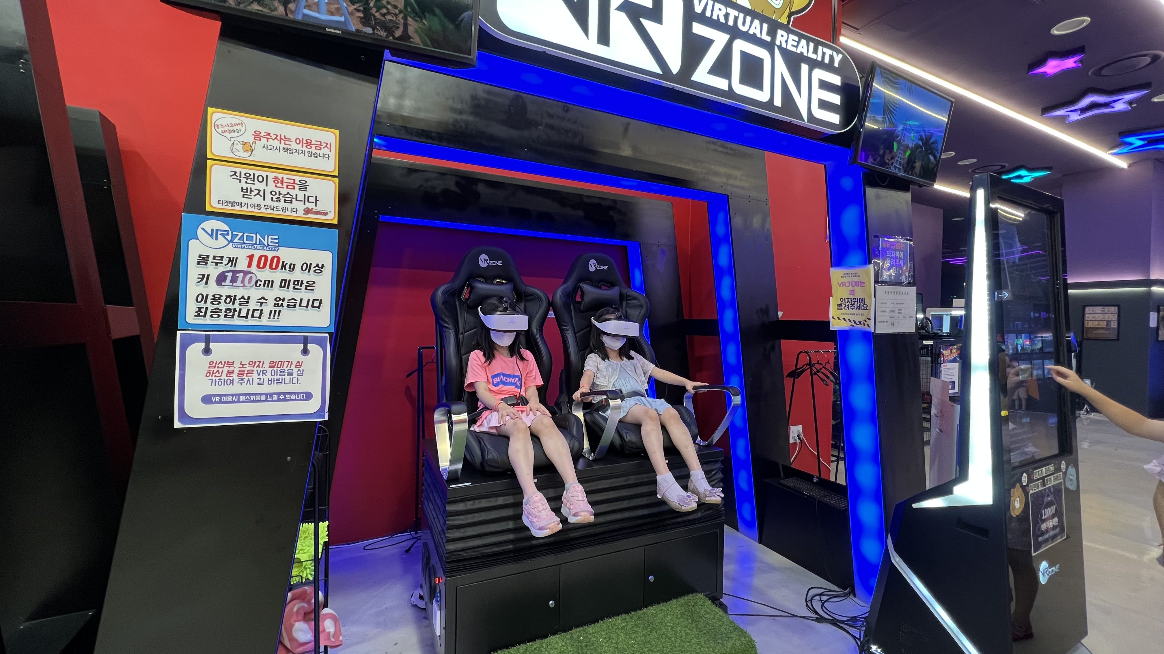 한시간 정도 롤러 스케이트를 타고 나서 바로 옆에 있는 VR존으로 이동했다. 우리 아이들은 놀이공원의 바이킹, 롤러코스터 등 스릴 있는 놀이기구들을 정말 좋아하는데 아직은 키가 작아서 모든 놀이기구를 이용할 수 없다. 항상 롤러코스터를 궁금해 하는 아이들을 위해 가상으로 롤러코스터 체험을 했다.