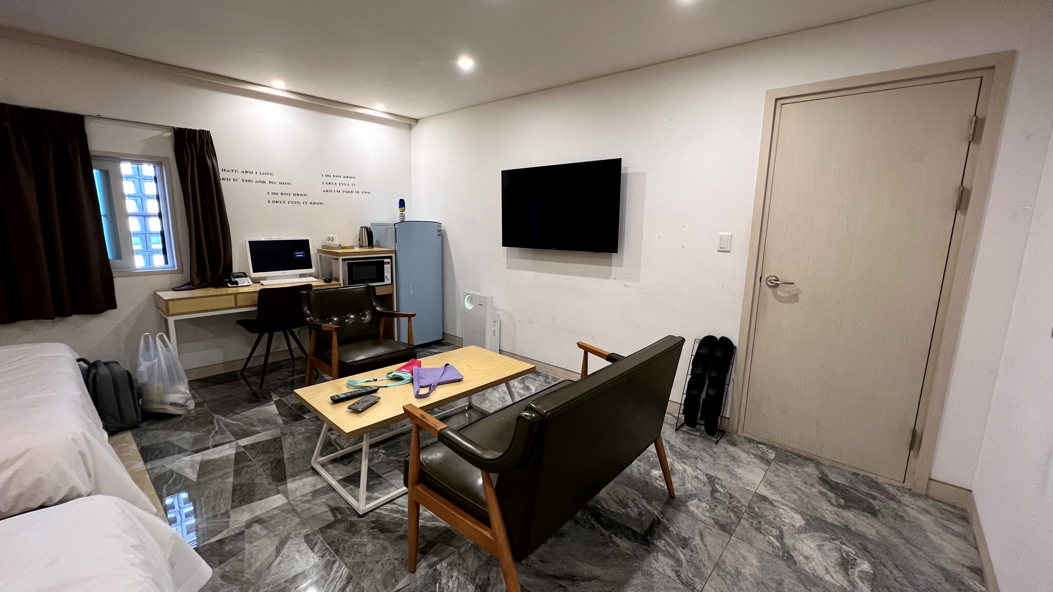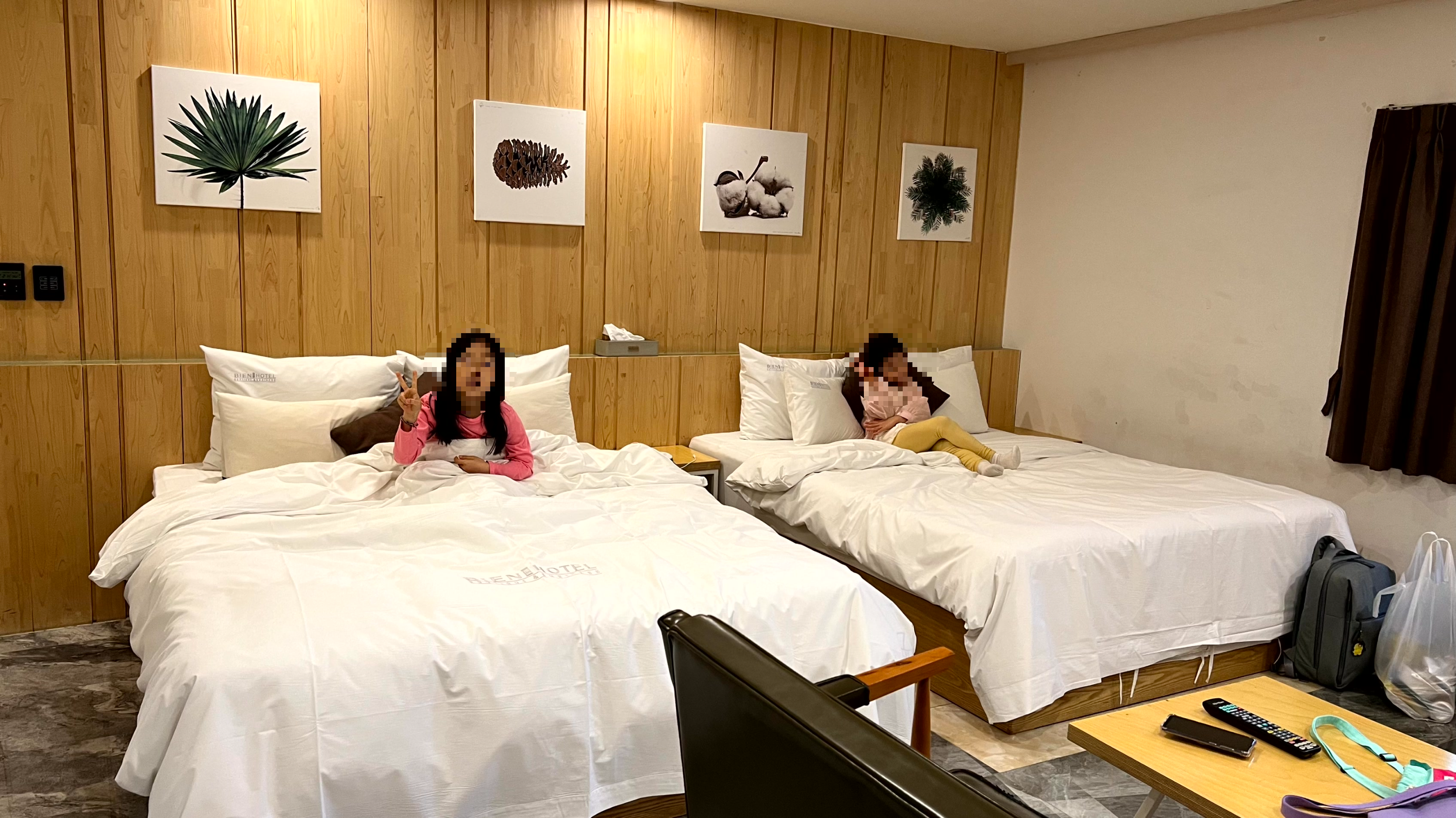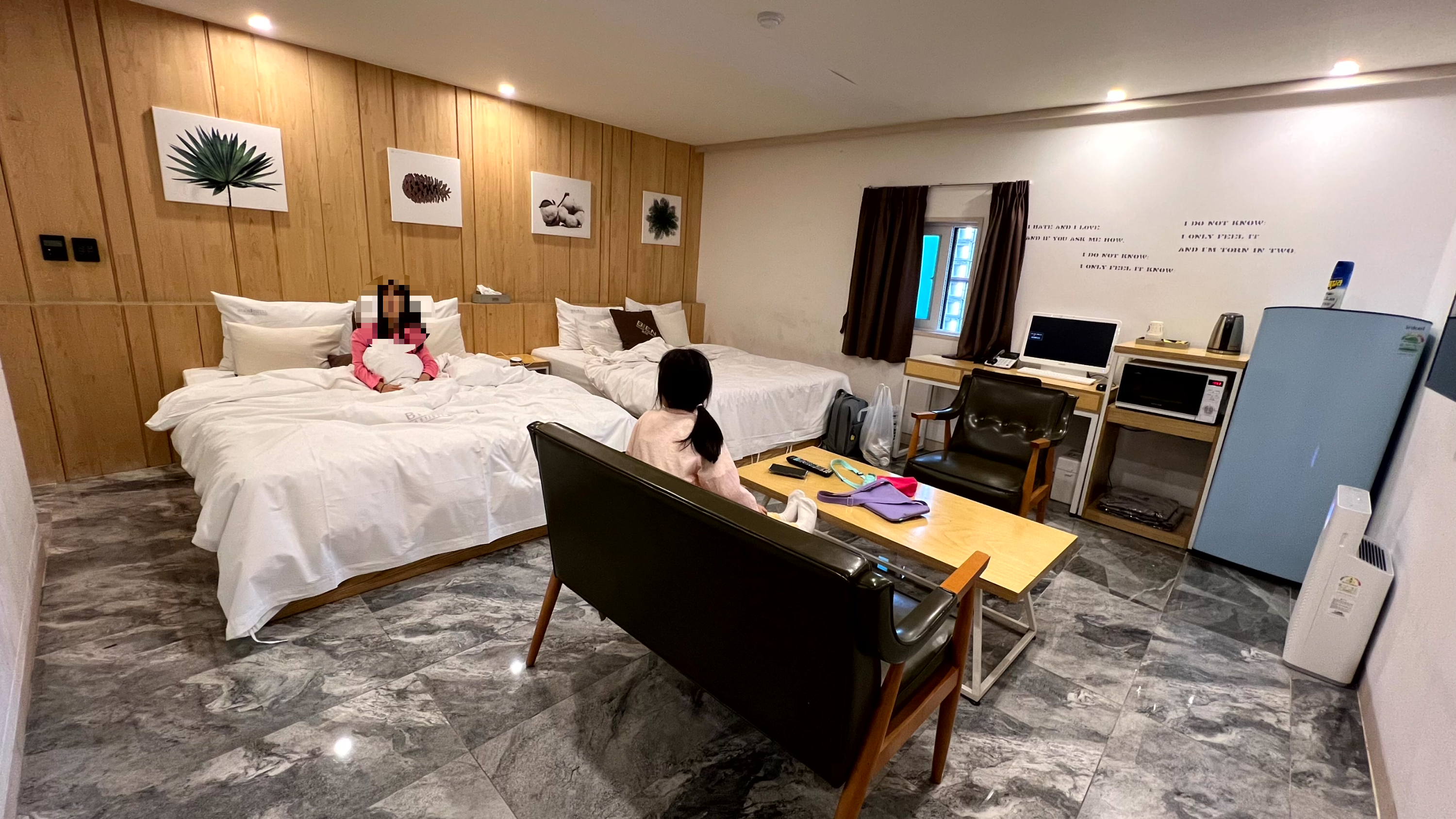 패밀리룸답게 객실 사이즈가 넓었다. 침대가 2개 준비되어 있었는데 아이들은 넓은 객실을 보고 신이 났다. PC도 한 대 있었고, 냉장고 사이즈도 넉넉하여 사온 음식을 넣어두기에도 충분했다. 전자렌지, 커피포트 등도 준비되어 있었다.