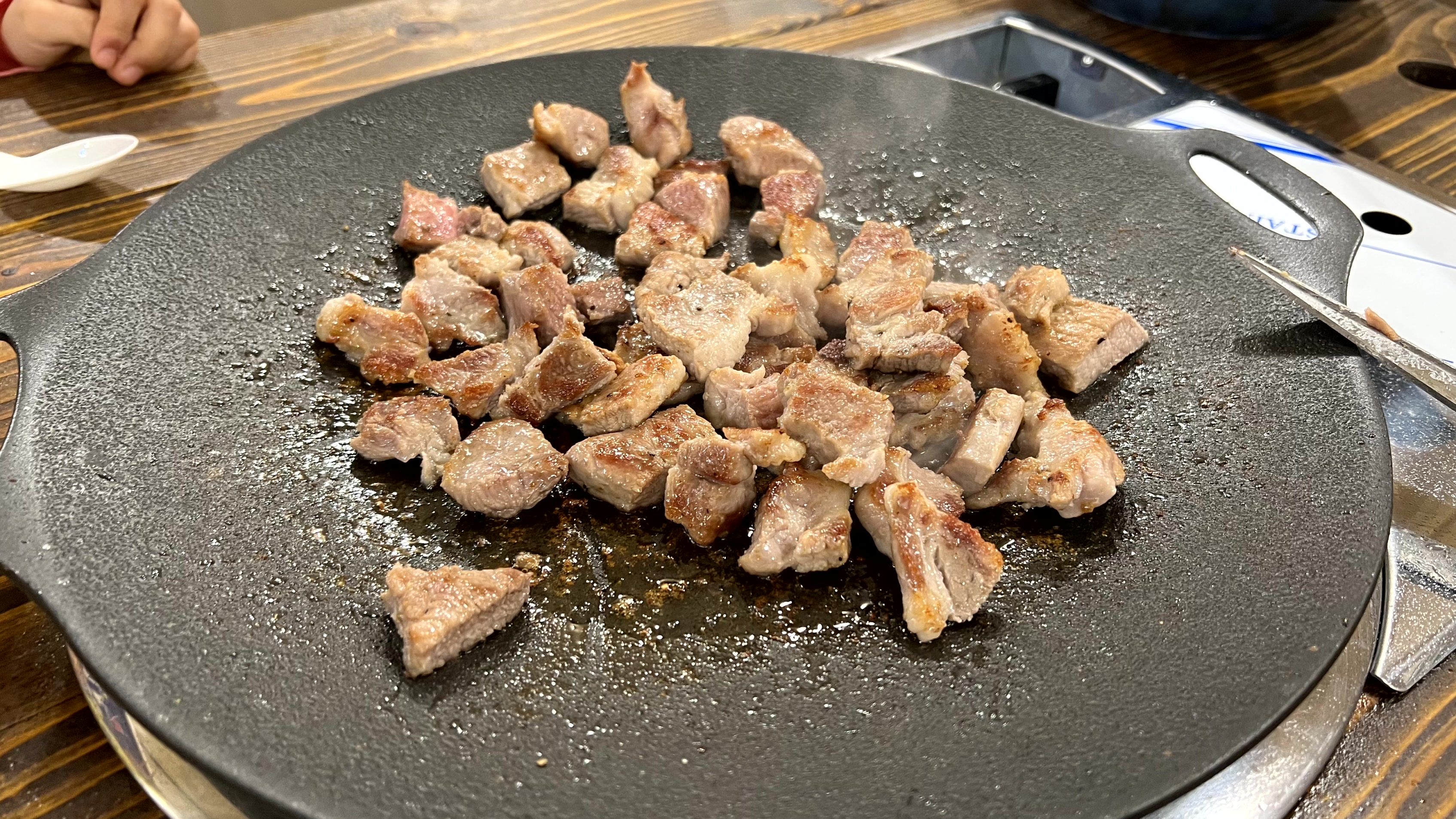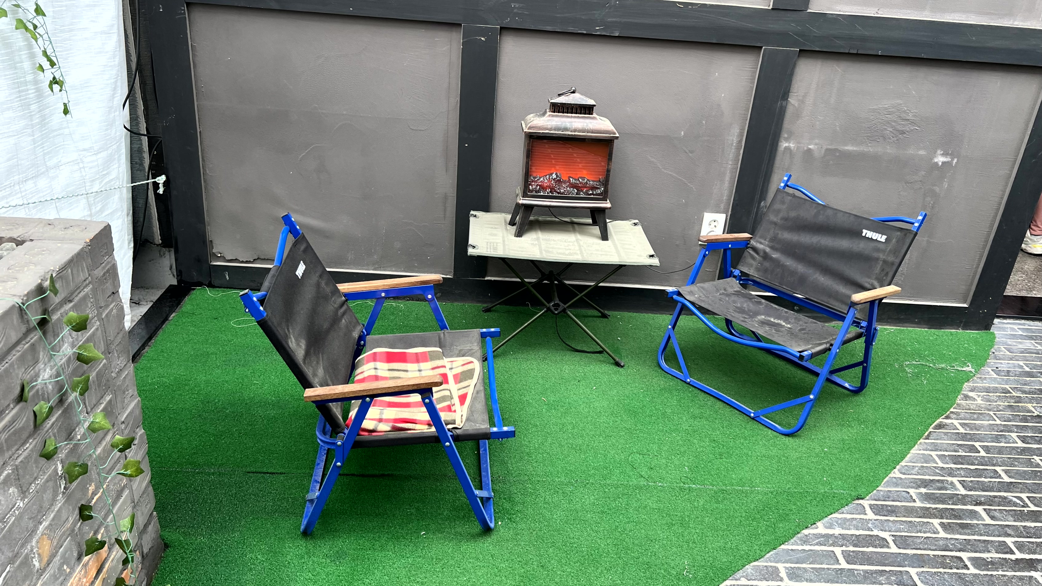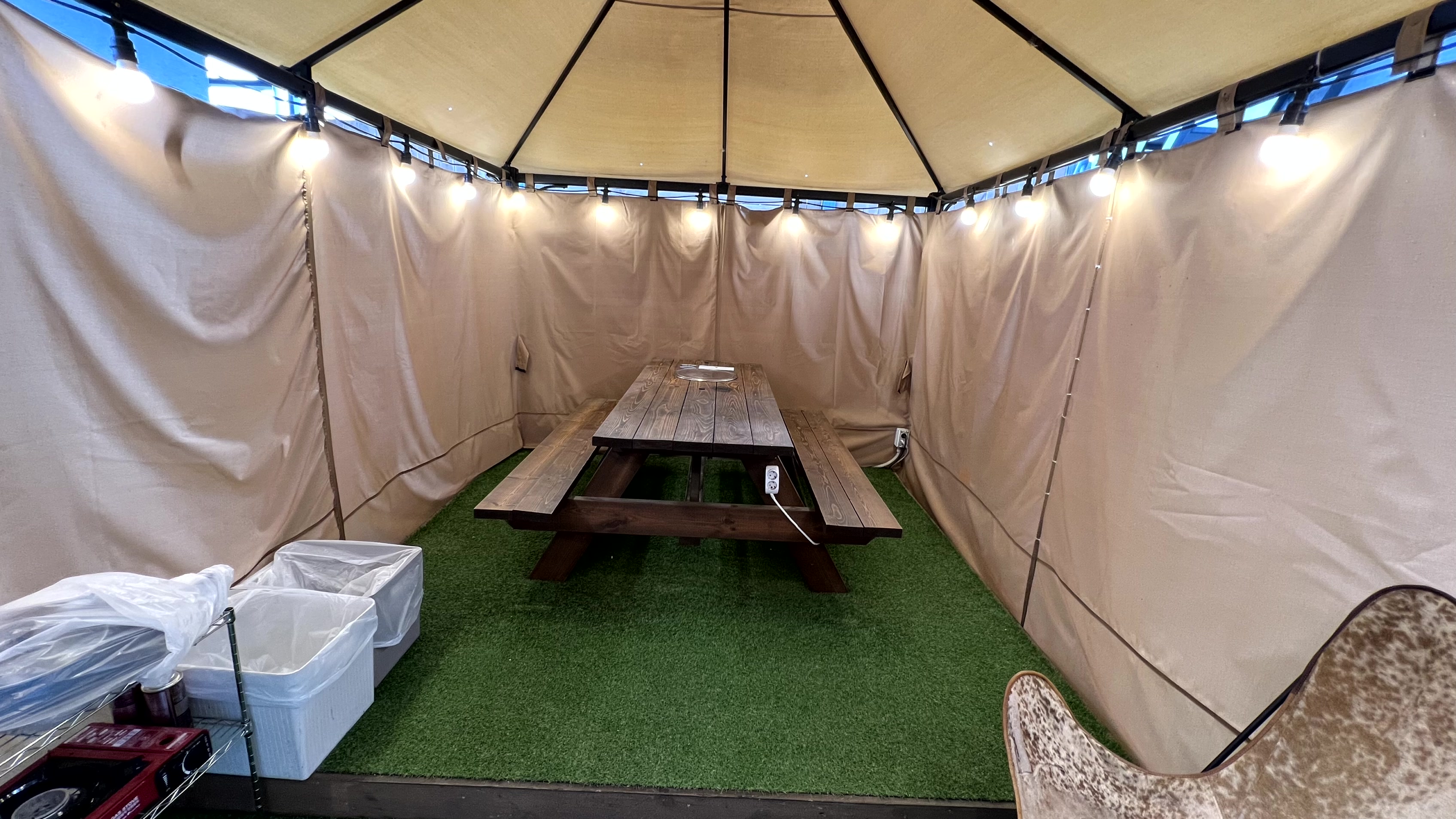 객실 구경을 마치고 배가 고파진 우리는 글램핑장에서 고기를 구워 먹기로 했다. 우리만 단독으로 쓸 수 있는 프라이빗 글램핑장이라니... 다른 사람들과 마주치지 않고, 시간 제약도 없어서, 정말 마음에 쏙 드는 공간이었다. 비도 오고 날이 추워서 걱정했는데 천막 문을 닫으니 바람도 들어오지 않고 나름 따뜻했다.