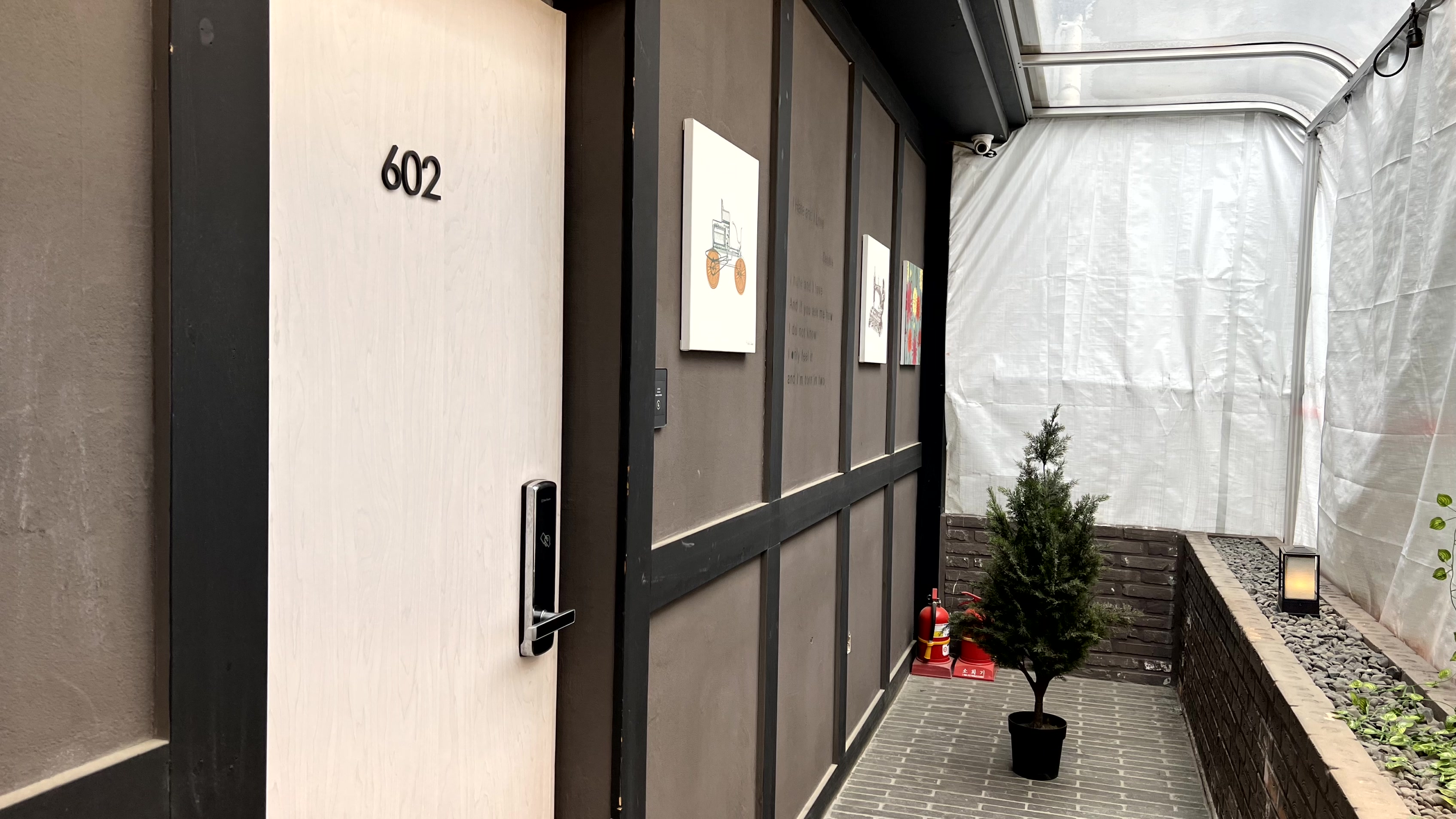 객실로 이동하는 복도가 넘나 예쁘게 꾸며져 있었다. 포토존으로 사용하면 좋을 듯 한데 의자가 너무 더러워서 실제로 앉는 데에는 무리가 있다. 천장이 막혀 있어서 비가 와도 젖지 않고 객실까지 이동할 수 있다. 카드키를 찍고 객실문을 열면 신발을 벗는 곳이 있고, 한 번 더 문을 열어야 객실로 들어갈 수 있다. 일반 가정집을 떠올렸을 때에 현관 앞에 중문이 있다고 생각하면 된다.