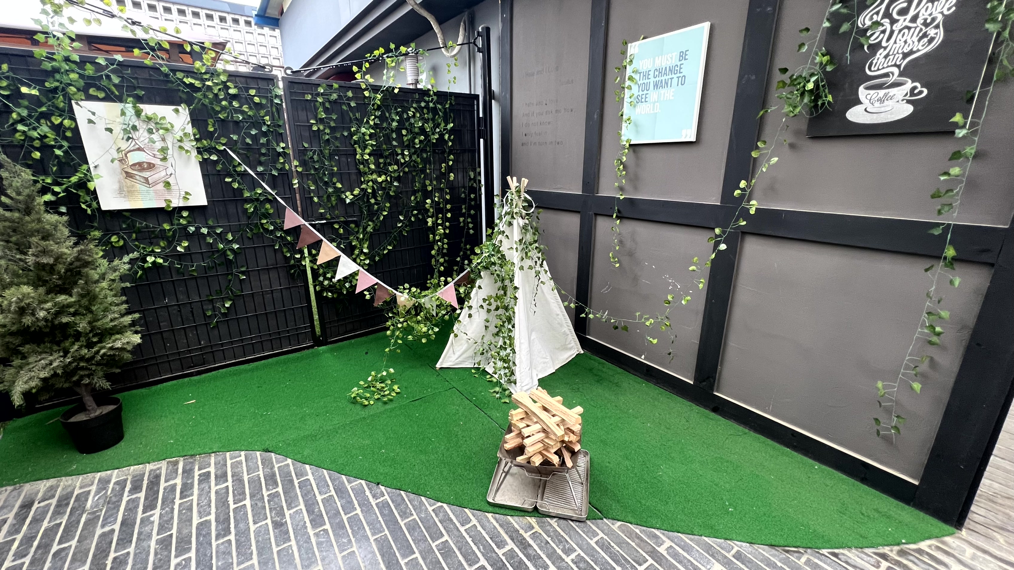 객실로 이동하는 복도가 넘나 예쁘게 꾸며져 있었다. 포토존으로 사용하면 좋을 듯 한데 의자가 너무 더러워서 실제로 앉는 데에는 무리가 있다. 천장이 막혀 있어서 비가 와도 젖지 않고 객실까지 이동할 수 있다. 카드키를 찍고 객실문을 열면 신발을 벗는 곳이 있고, 한 번 더 문을 열어야 객실로 들어갈 수 있다. 일반 가정집을 떠올렸을 때에 현관 앞에 중문이 있다고 생각하면 된다.