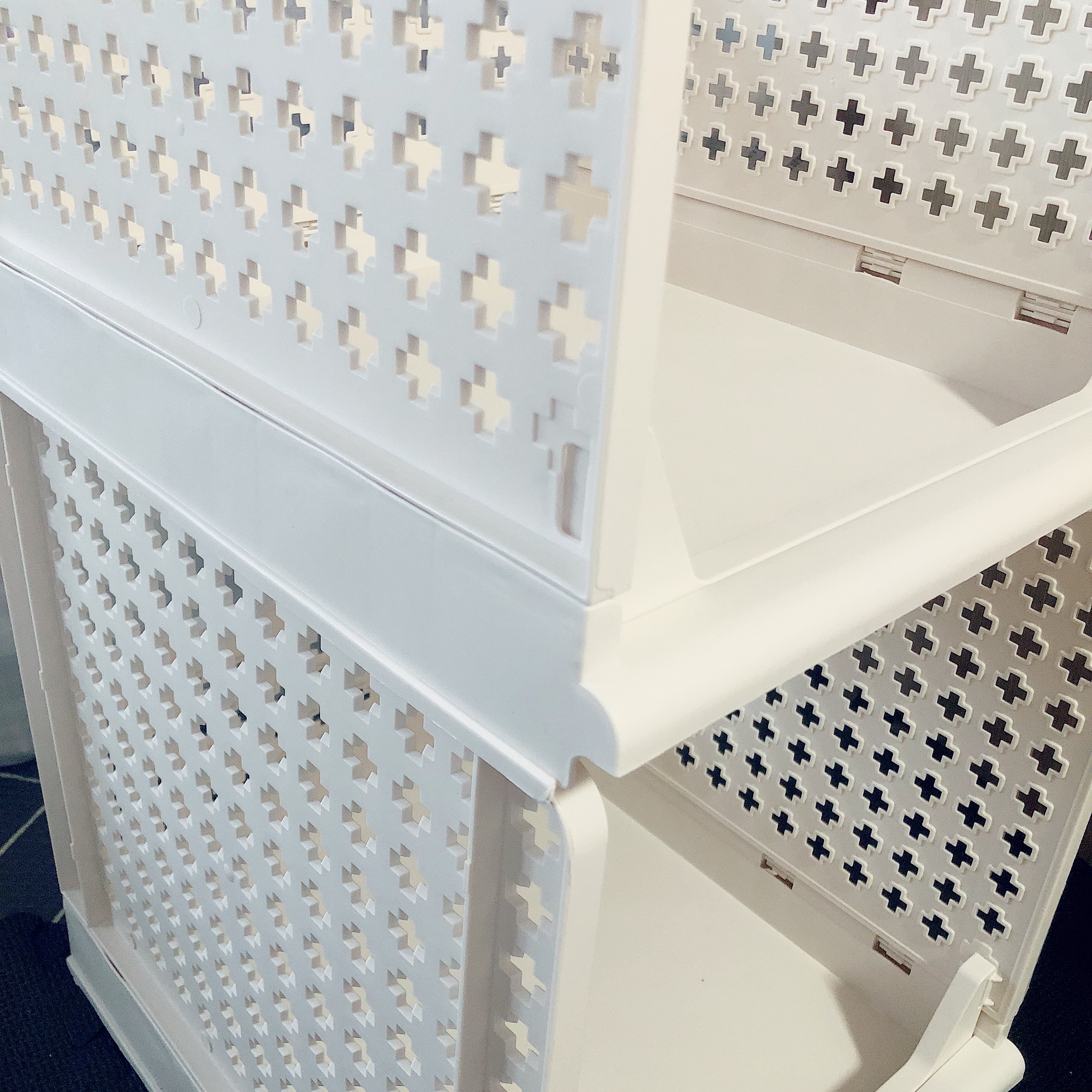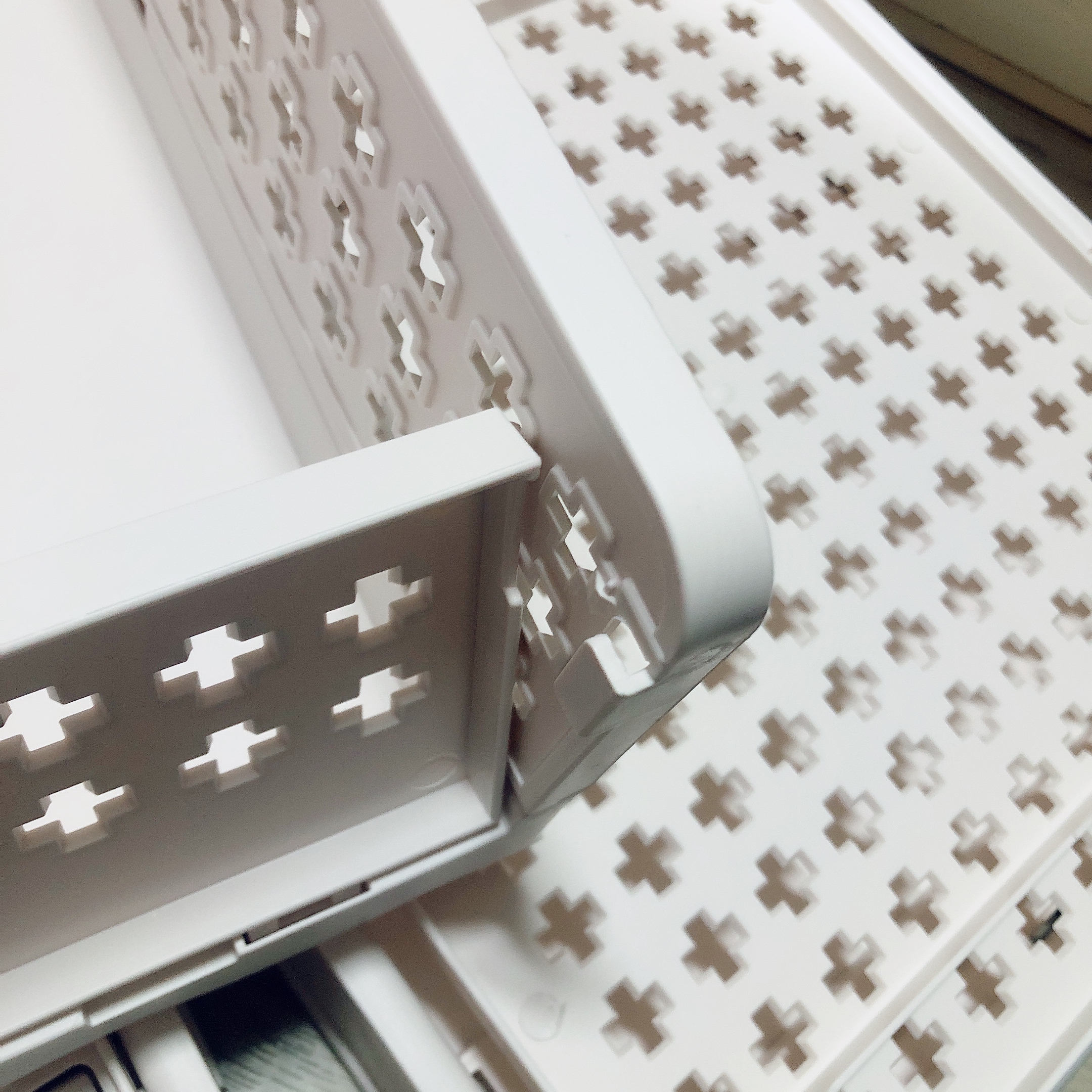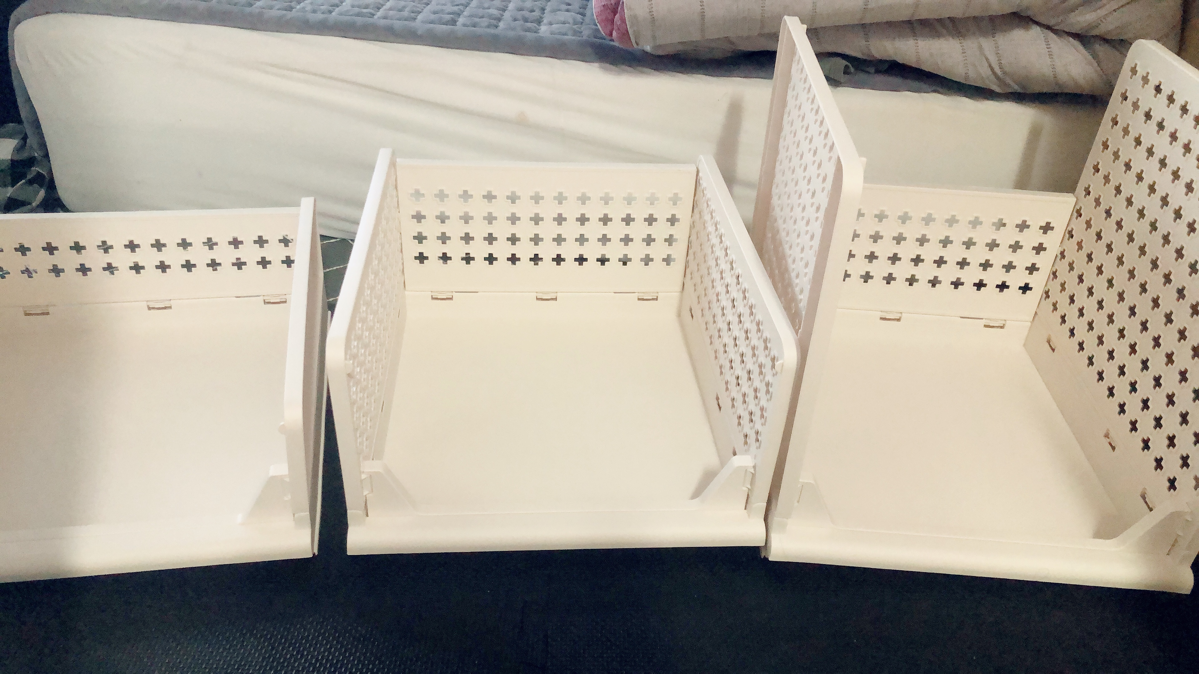 왼쪽부터 차례대로 중형, 대형, 특대형이다. 누구나 쉽게 조립을 하거나 해제할 수 있어서 공간활용도가 높다. 사용하지 않는 리빙박스는 다시 접어서 틈새에 쏙 넣어 보관하다가 다시 필요할 때 조립하면 된다.