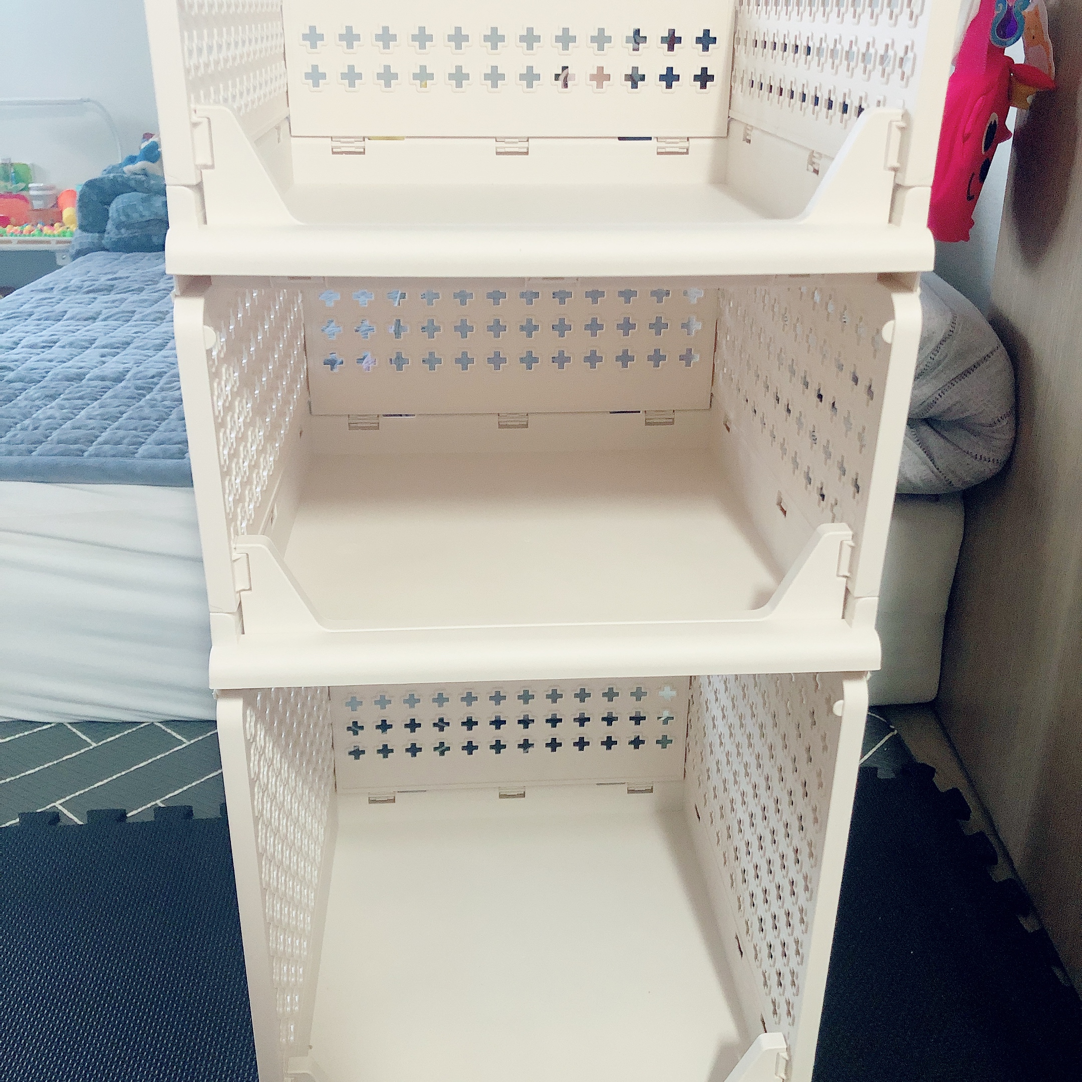바닥면 사이즈가 모두 같고 아랫부분에 홈이 있어서 차곡차곡 쌓아서 사용이 가능하다. 우리 집 옷장에는 중형, 대형, 특대형 각 1개씩 쌓은 3단 정리함이 딱 맞게 들어가는데, 필요에 따라 4단, 5단... 상관없이 계속 위에 얹어만 주면 된다. 상세페이지에는 서랍처럼 넣고 빼기가 편리한 슬라이딩 방식도 가능하다고 설명되어 있는데 실제로 해보니 음... 프레임이 별도로 있는 것이 아니라서 위, 아래 리빙박스가 함께 따라나오지 않도록 붙잡고 빼 주어야 한다. 결론적으로 불가능한 것은 아니지만 그렇게 편하지도 않음! 사용방법을 익혀 익숙해지면 편하게 사용할 수 있는 기능일수도 있기 때문에 계속 사용해보아야 할 듯 하다.