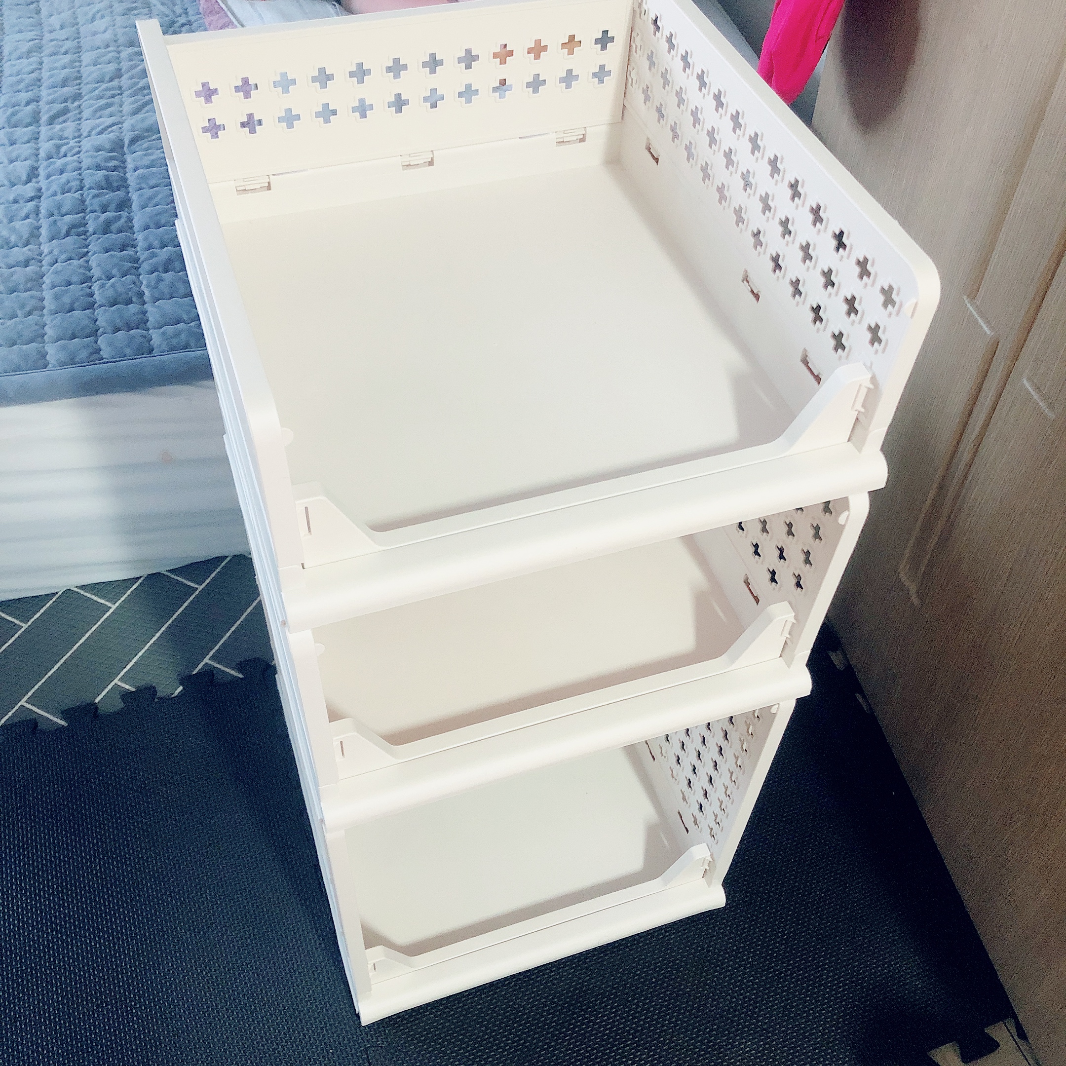 겨울이 지나 철 지난 옷들을 보관해야 하는데 너무 두서없이 여기저기 쌓여있는 기분이라... 옷장 정리 아이템을 검색하다가 접이식 슬라이딩 리빙박스를 발견하고 구입했다. 나는 옷걸이에 걸려있는 옷보다는 접어서 차곡차곡 쌓아두는 의류가 훨씬 많아서 옷장 안에 리빙박스를 넣어 공간 활용도를 높여보기로 했다.
