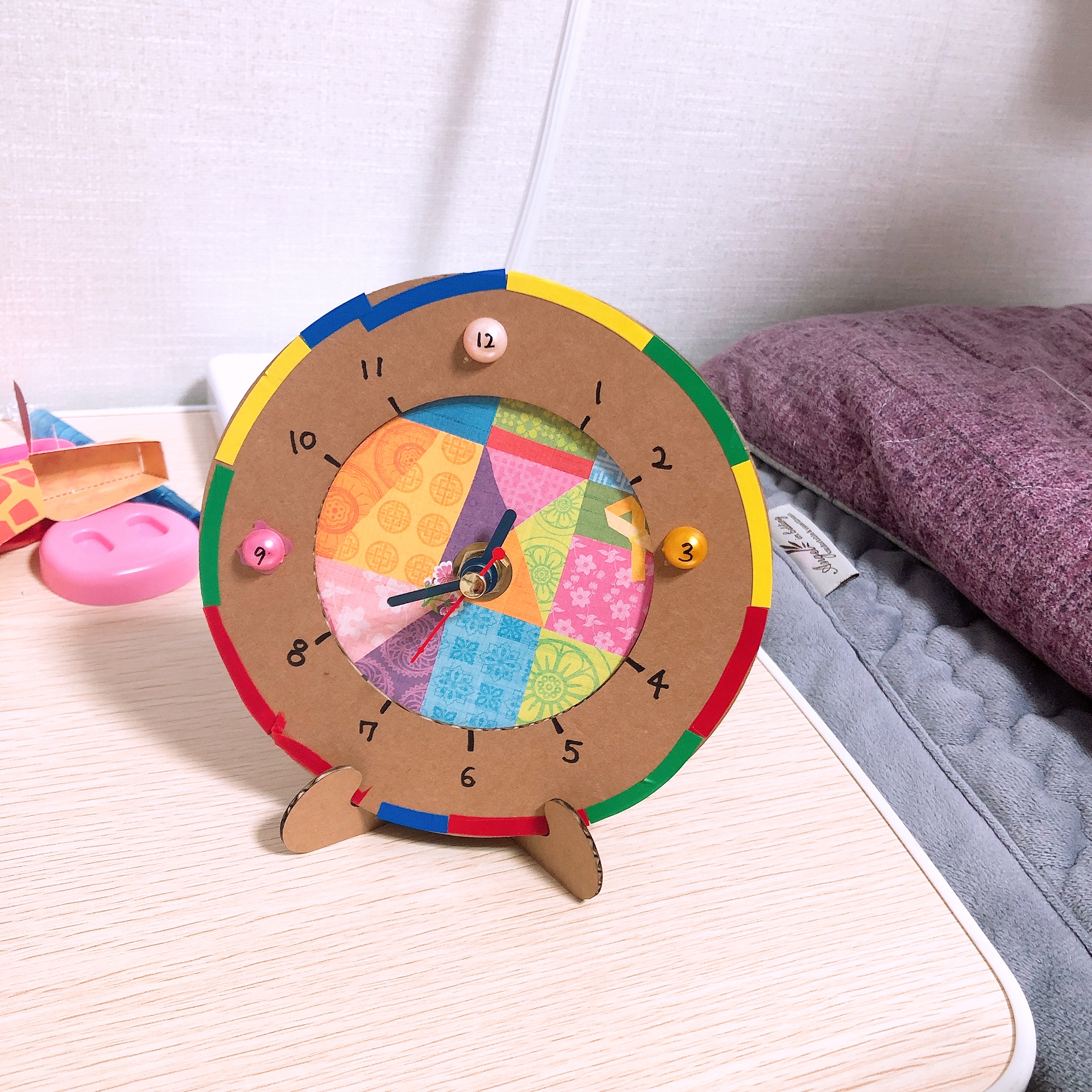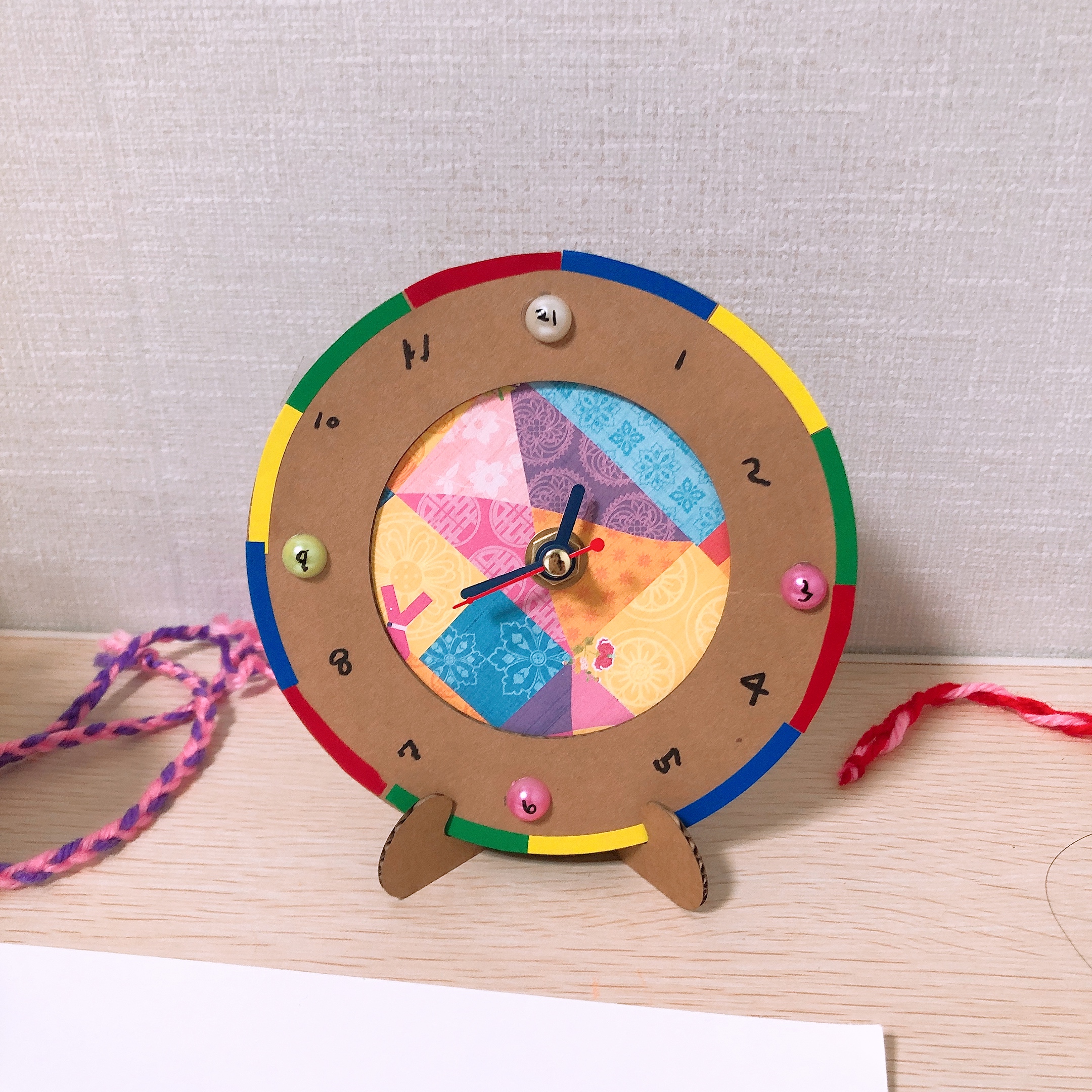 하요미표 시계, 소요미표 시계가 완성되었다. 드림캐쳐와 마찬가지로 벽에 걸려있는 큰 시계를 엄마 시계, 본인들이 만든 시계를 아가 시계라고 한다. (엄마놀이에 심취한 윤자매) 오늘도 만족스러운 엄마표 미술활동이었다. 시계 공부를 하고 있거나 실용적인 놀이키트 활동이 필요한 유아들에게 유니아트 전통탁상시계 만들기를 추천한다.