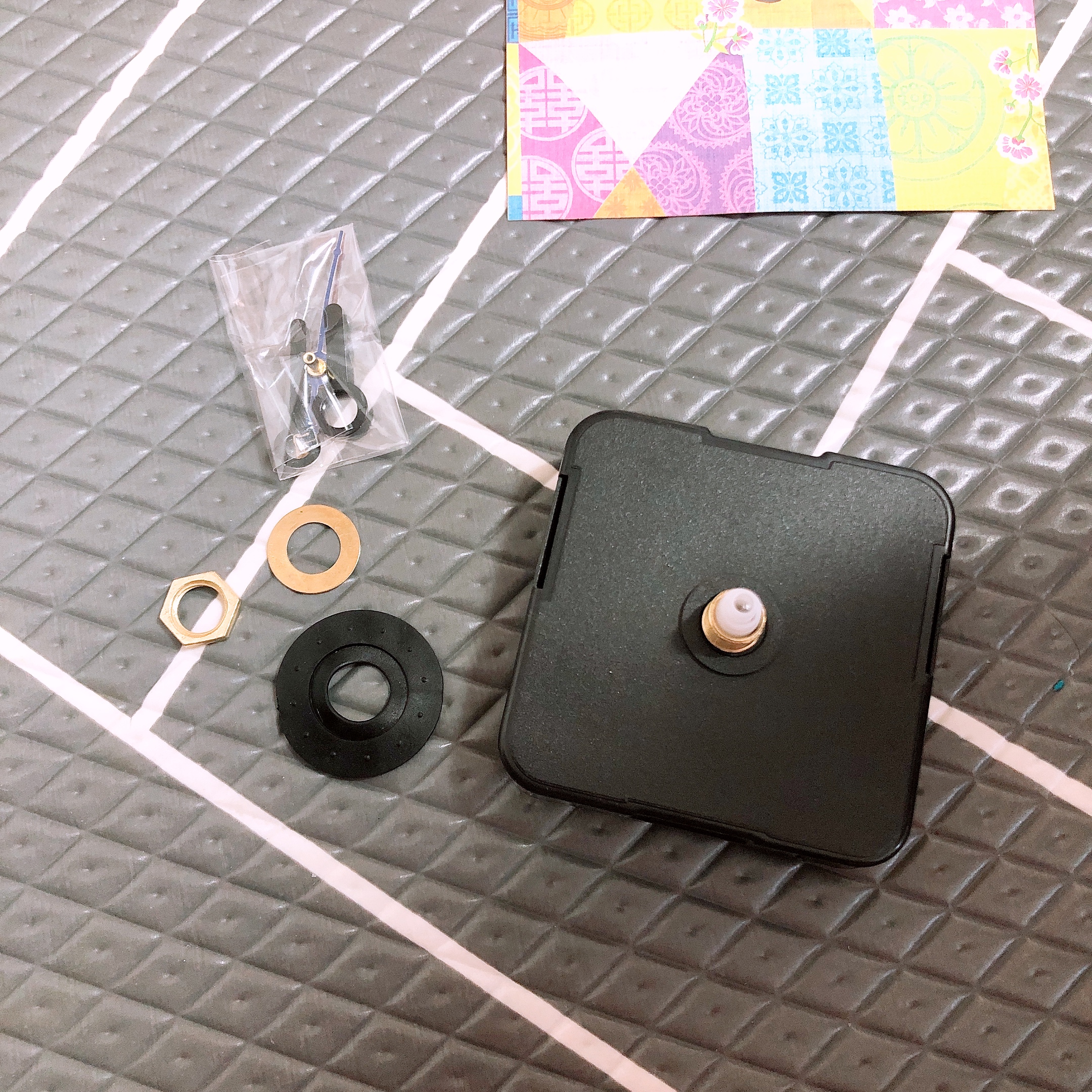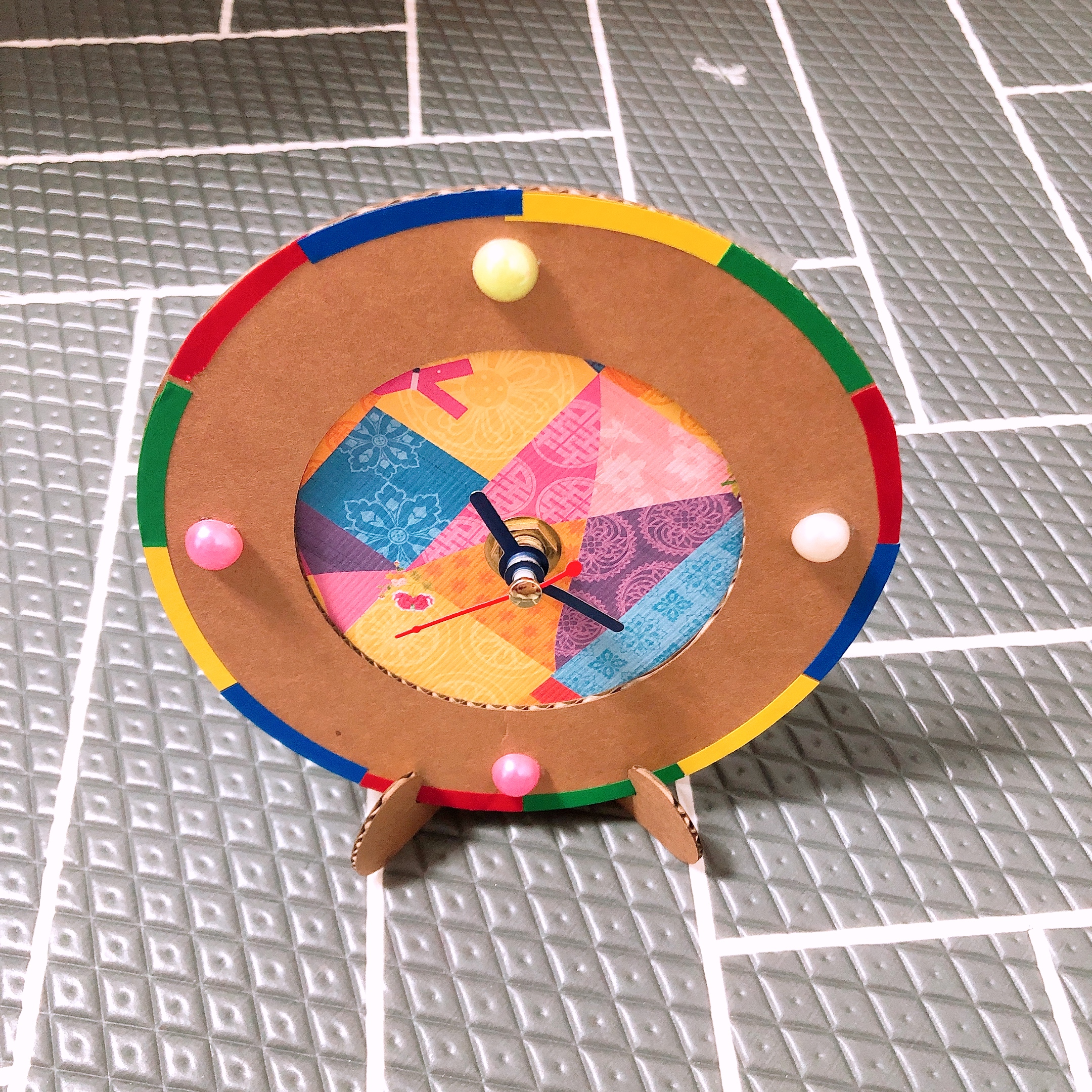 유니아트 전통탁상시계 만들기의 구성품은 양면골판지, 시트지, 레자크지, 비즈스티커, 무브먼트 세트이다. 시계를 만드는 설명서는 동봉되어 있지 않은데, 표지 이미지를 보면 어떻게 만드는지 딱 알수 있어 특별히 찾아보지는 않았다. 시계 무브먼트 조림방법은 들어있다고 쓰여 있었는데 없어서 좀 헤맸다. 설명서가 누락된 건지 (두 세트 모두?) 원래 없는건지는 잘 모르겠다.
