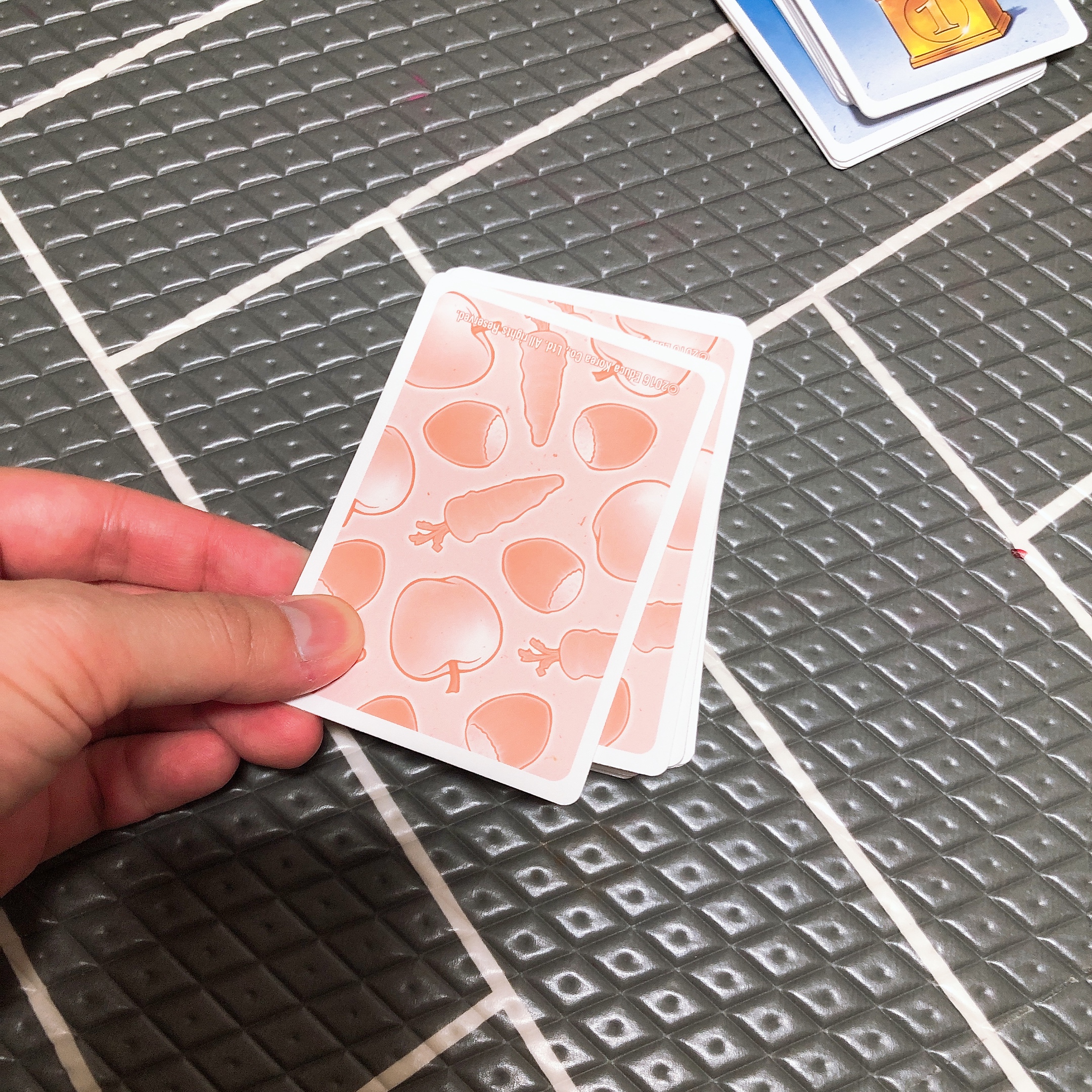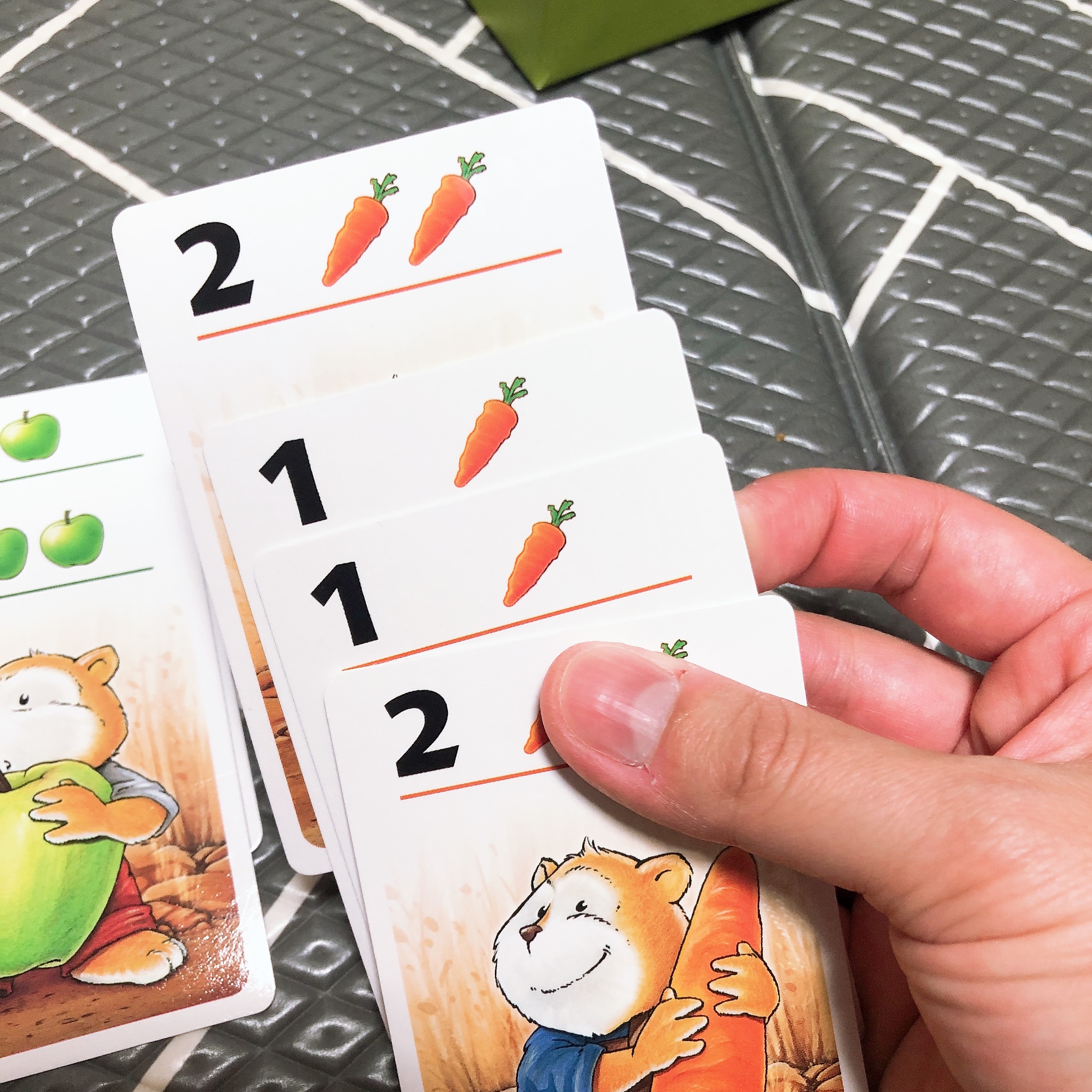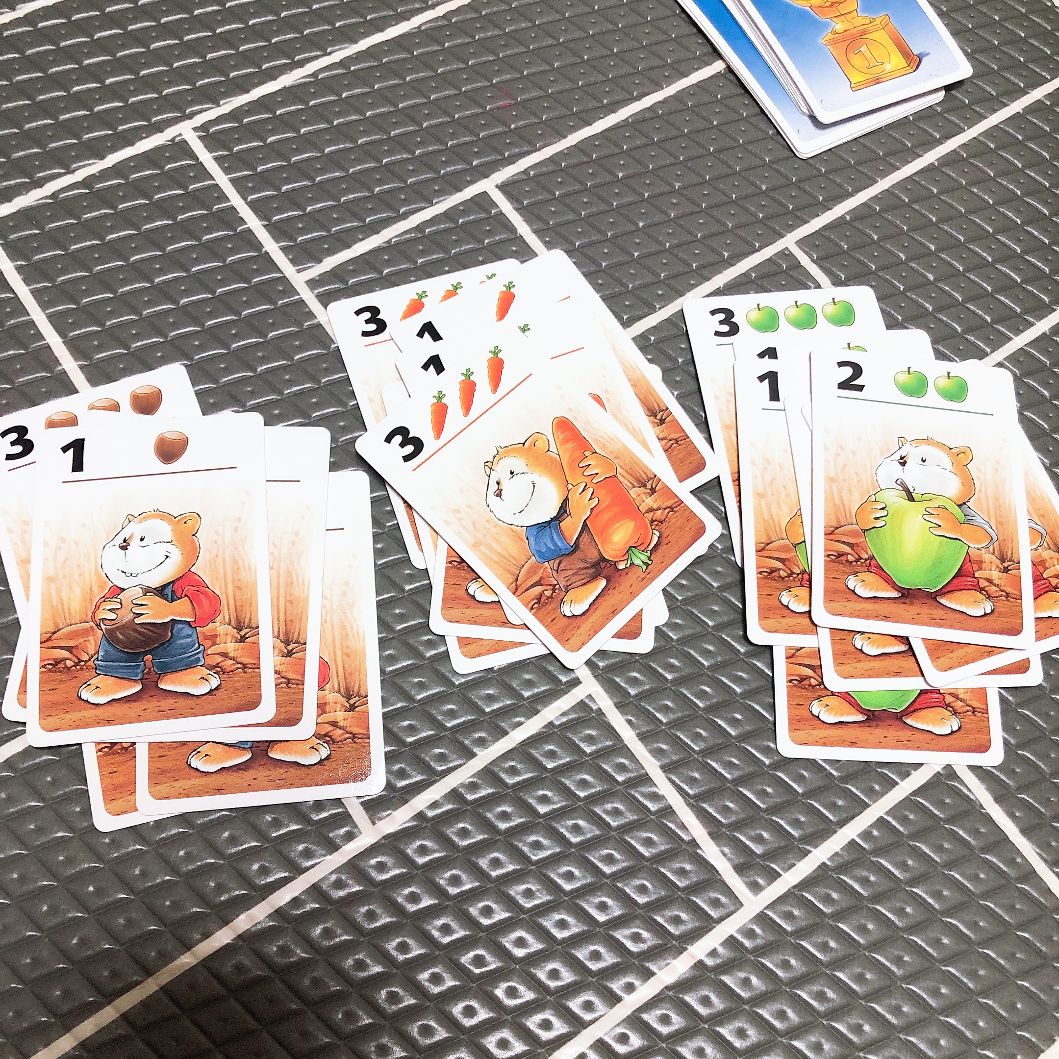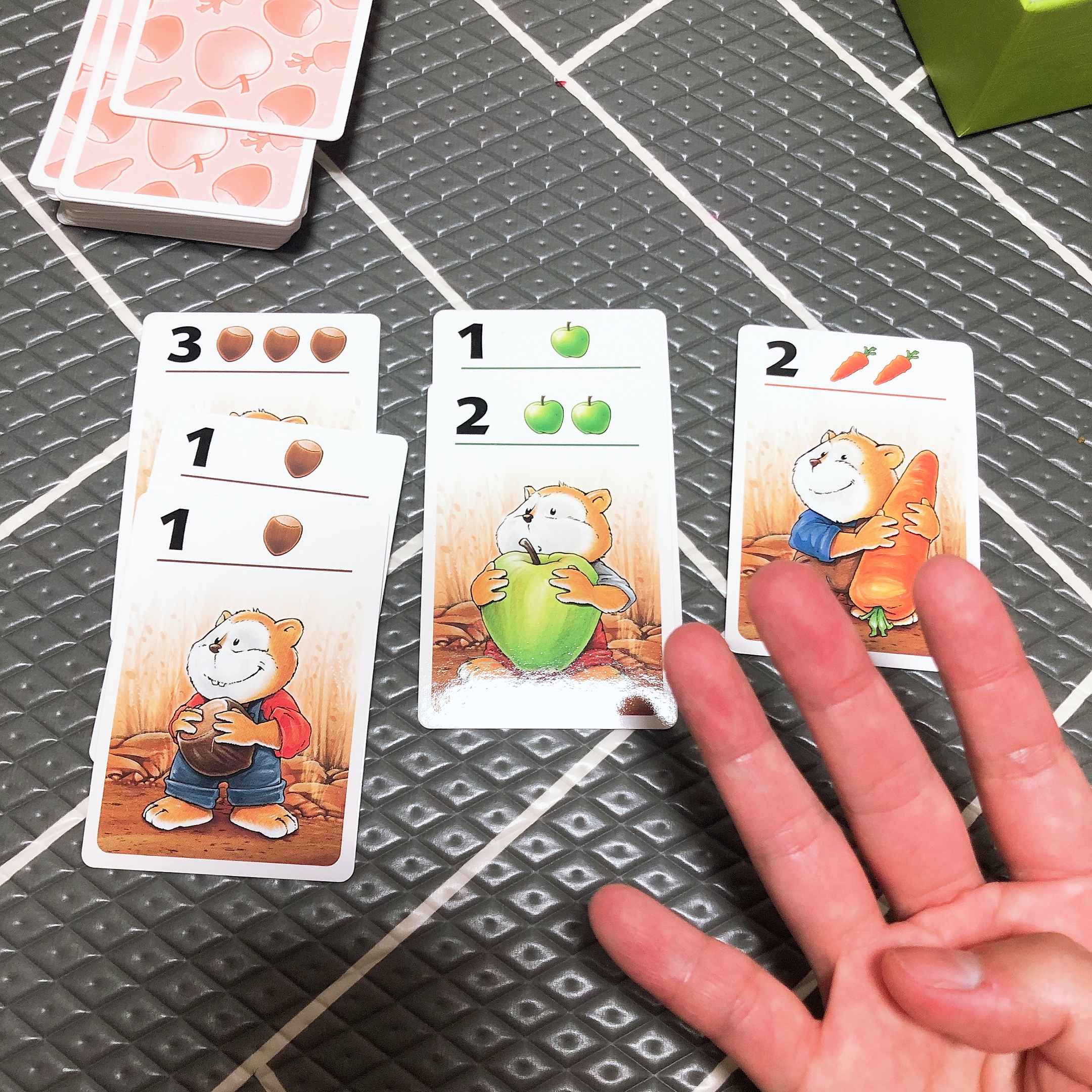 만약 계속 다른 카드가 나온다면 최대 4장까지 음식카드를 뒤집어서 가져올 수 있고, 4장을 모두 가져왔다면 다시 상대방의 순서가 된다. 도토리, 사과, 당근 - 동일한 음식으로 6개를 딱 맞게 모으면 트로피로 바꿀 수 있다.