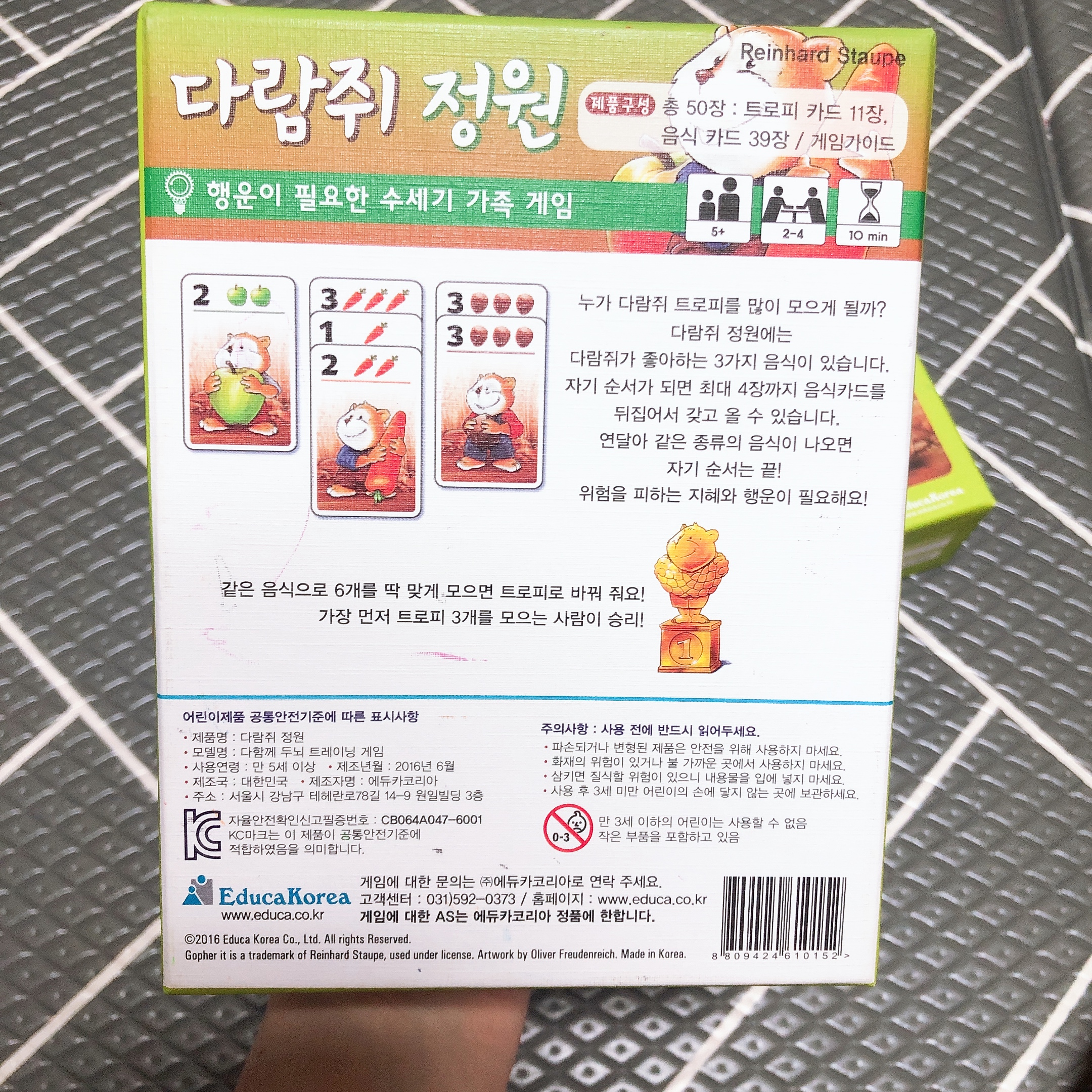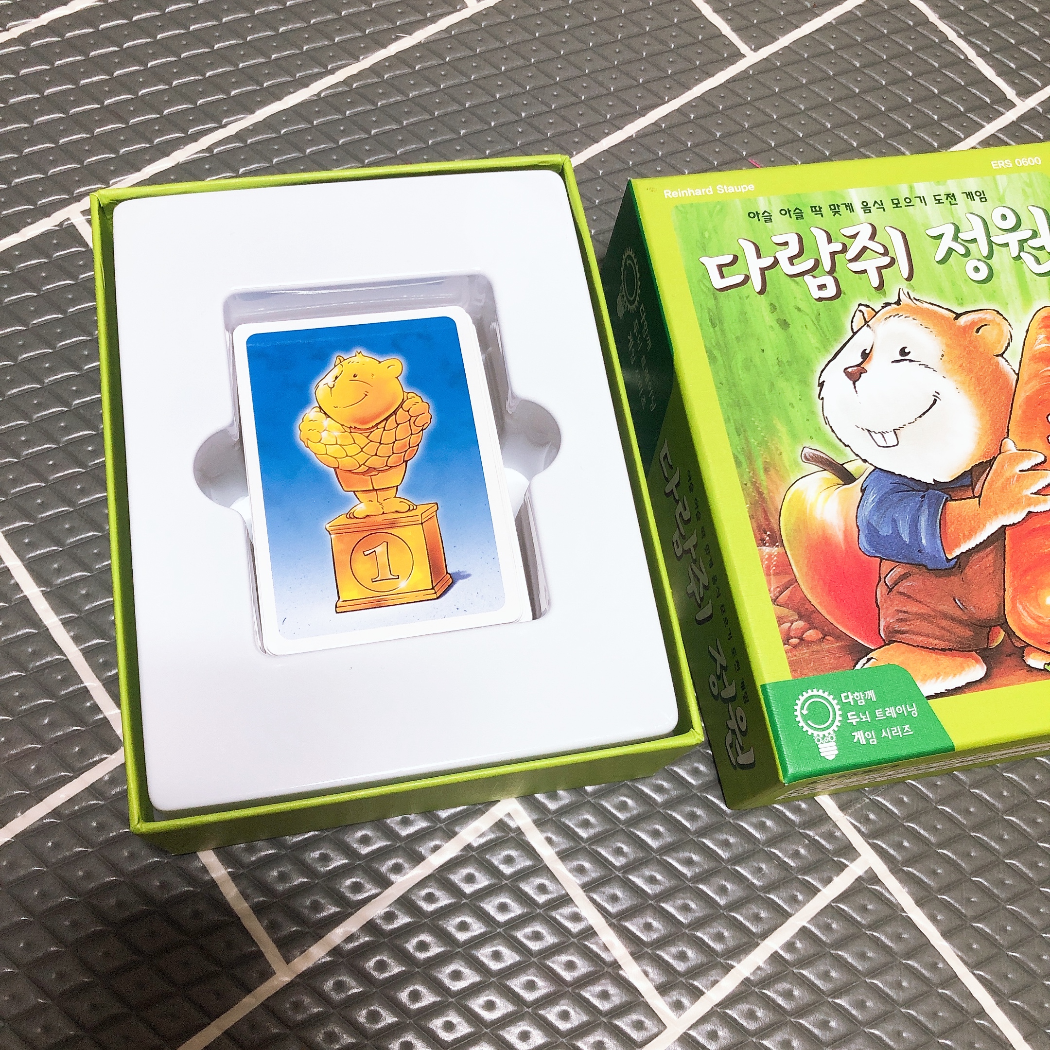 박스를 열면 가운데 카드가 가지런히 정리되어 있고, 박스 뒷면에 놀이방법이 적혀 있다. 누가 다람쥐 트로피를 많이 모으게 될까?