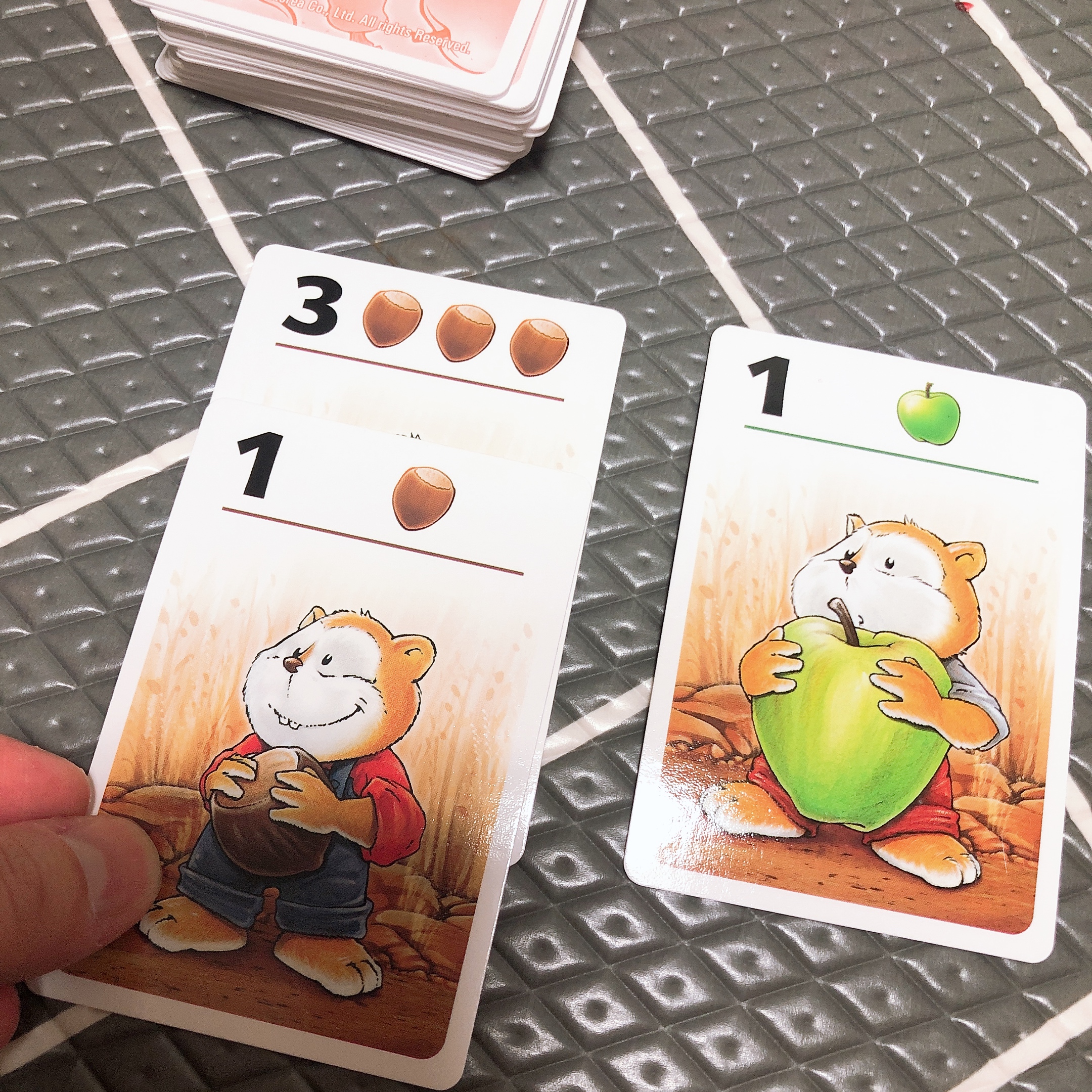 만약 계속 다른 카드가 나온다면 최대 4장까지 음식카드를 뒤집어서 가져올 수 있고, 4장을 모두 가져왔다면 다시 상대방의 순서가 된다. 도토리, 사과, 당근 - 동일한 음식으로 6개를 딱 맞게 모으면 트로피로 바꿀 수 있다.