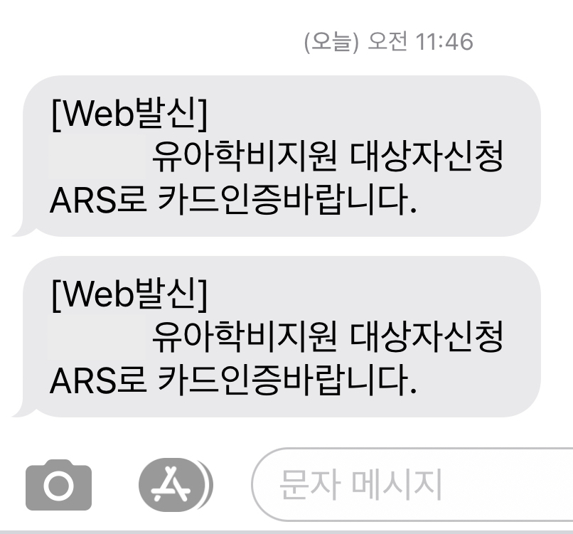 오전 업무를 하고 있는데 문자가 왔다. 두 아이들 유아학비지원 신청을 하라는 메세지였다. 2021학년도에는 학부모가 직접 휴대폰을 이용하여 유아학비지원 대상자 신청 ARS 카드 인증을 진행해야 한다고 한다. 어렵지 않지만 유아학비 지원대상자 카드인증 주의사항, 인증 절차를 소개하도록 하겠다.