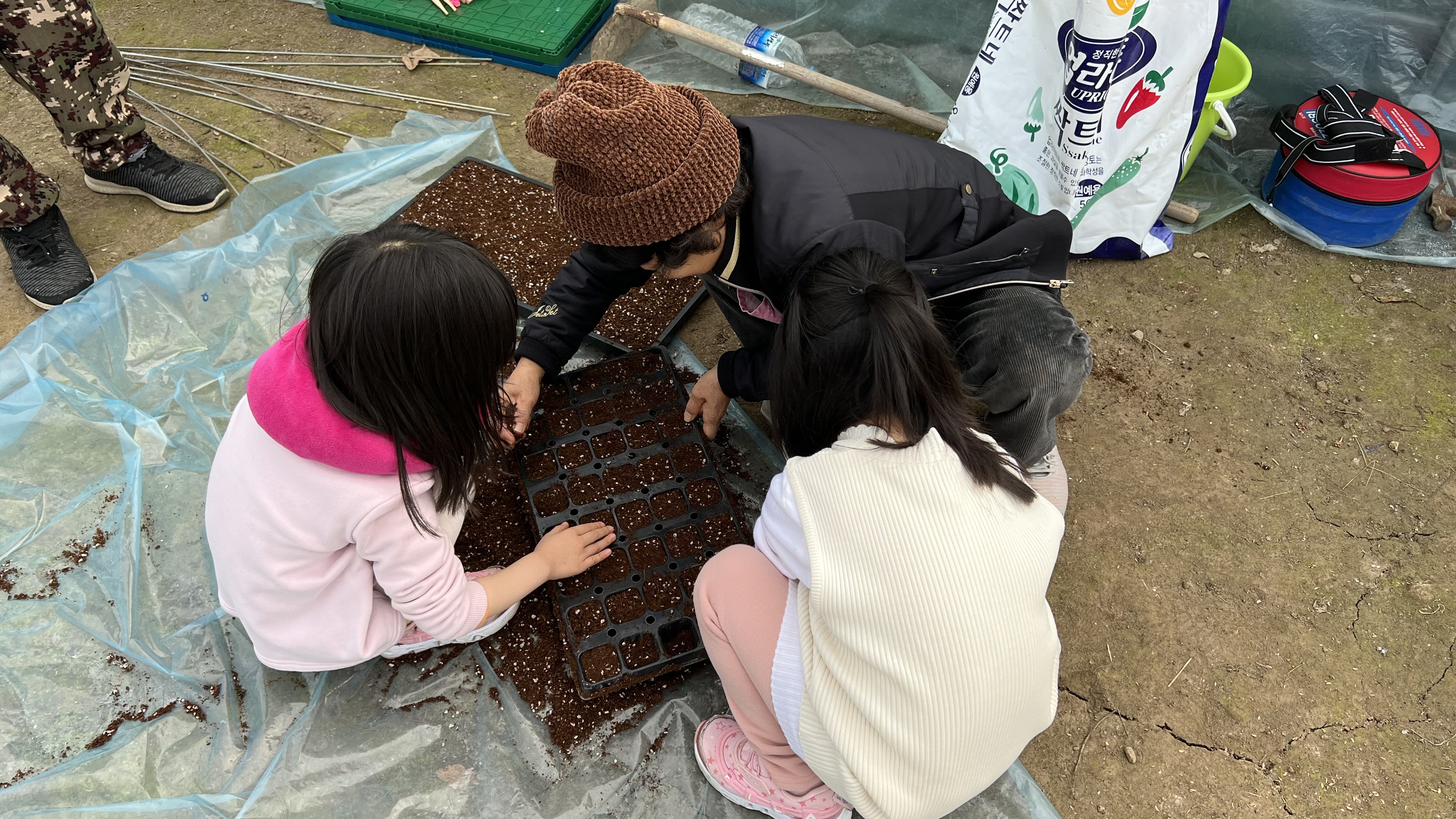 친정집 바로 옆에는 부모님이 농사 지으시는 비닐하우스가 있다. 둘째날 아침, 심심해하는 아이들을 위해 고추모종 심기 체험을 했다.