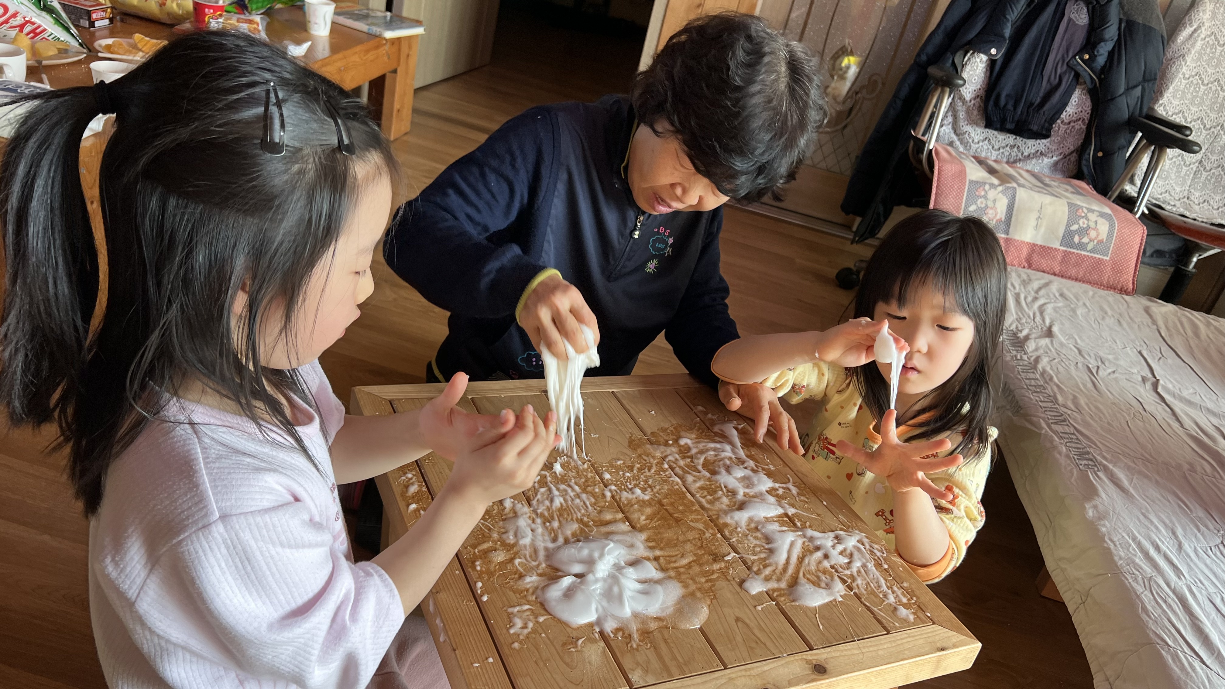 산책을 마치고 막간을 이용한 슬라임 놀이~ 아이들은 슬라임을 좋아한다. 슬라임은 촉감 자극에 도움이 될 것 같긴 하지만, 옷에 묻으면 처리하기도 어렵고, 끈적끈적해서 아직 우리 아이들이 능숙하게 다루기엔 어려운 재료이다. 그래서 개인적으로 내가 선호하는 놀이는 아니지만... 당연하게도(!) 아이들은 너무 좋아한다. 시골 외할머니댁에 온 기념으로 오랜만에 슬라임을 꺼내 주었다. 슬라임을 처음 보신 친정 엄마는 나무상에 붙은 슬라임을 보고 매우 놀랐으며, 안 떨어지면 어떡하냐고 걱정하셨다. (하지만 오히려 나무상이 예전보다 더 깨끗해 졌다는 후기)