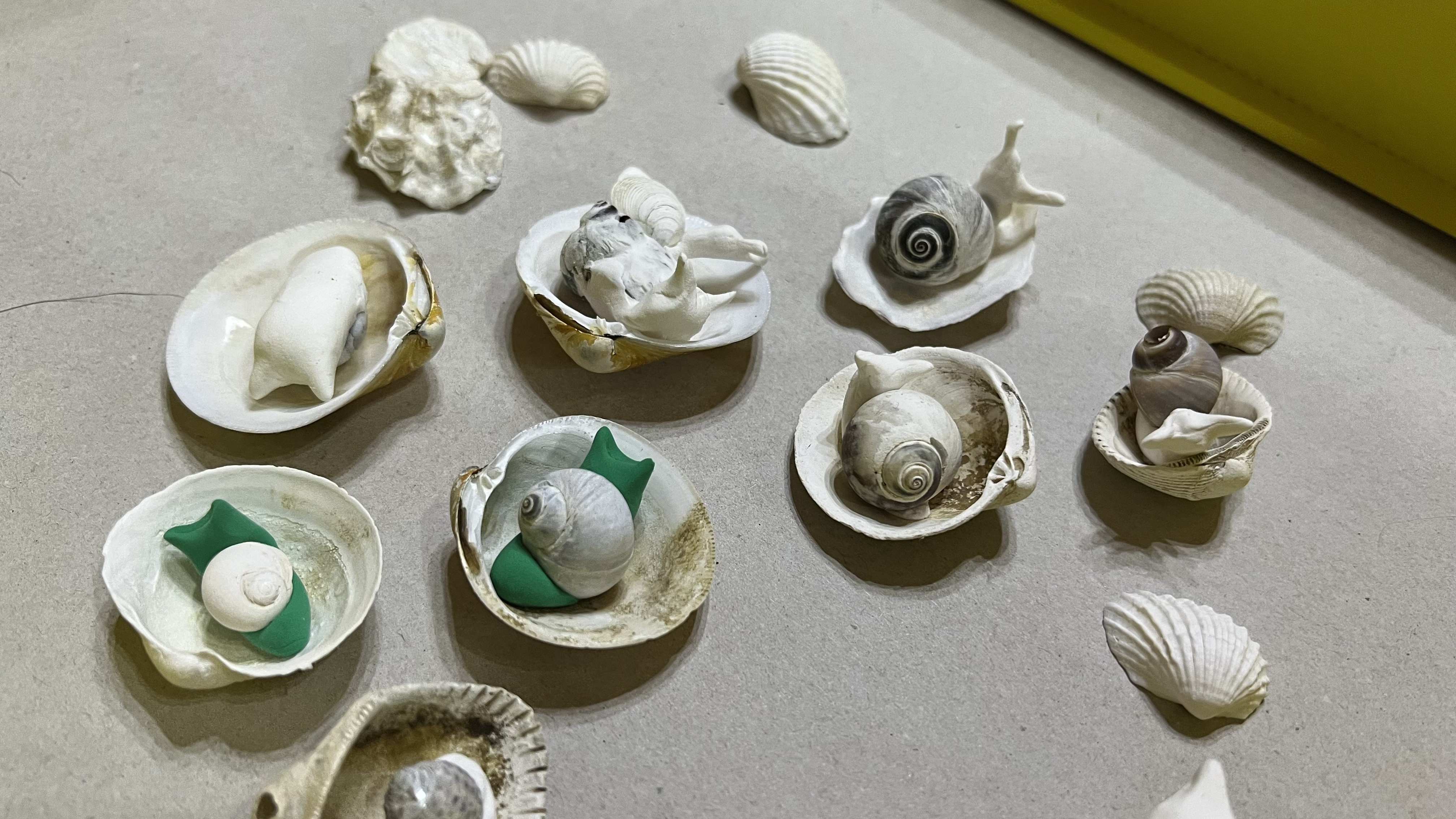 모래사장에 조개, 소라 껍데기들이 많이 있어서 모양이 예쁜 것들로 주워서 가져왔다. 그리고 그날 저녁에 소라 껍데기는 달팽이 집으로, 조개는 달팽이가 머무는 곳으로 새롭게 태어났다.