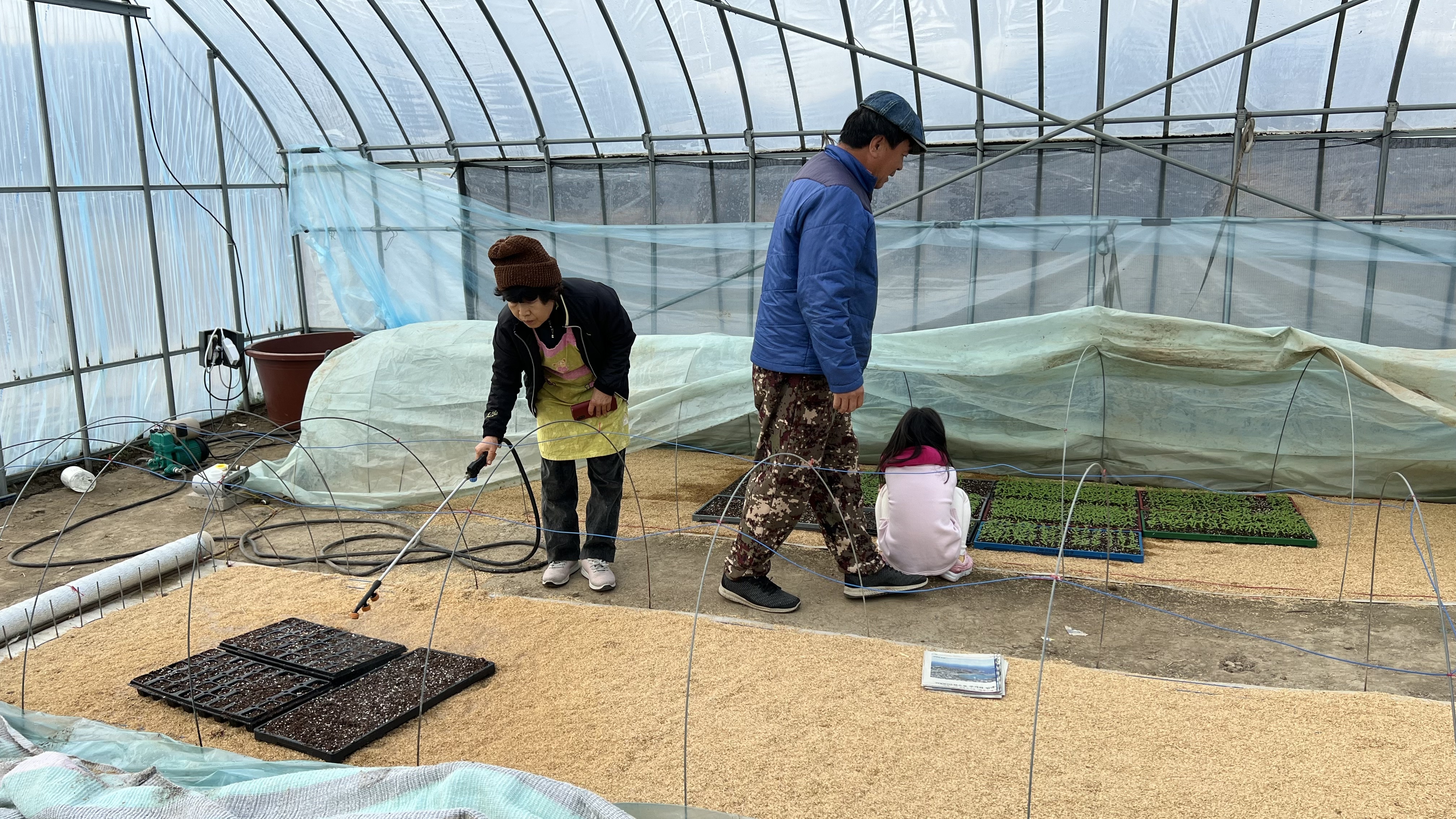 친정집 바로 옆에는 부모님이 농사 지으시는 비닐하우스가 있다. 둘째날 아침, 심심해하는 아이들을 위해 고추모종 심기 체험을 했다.