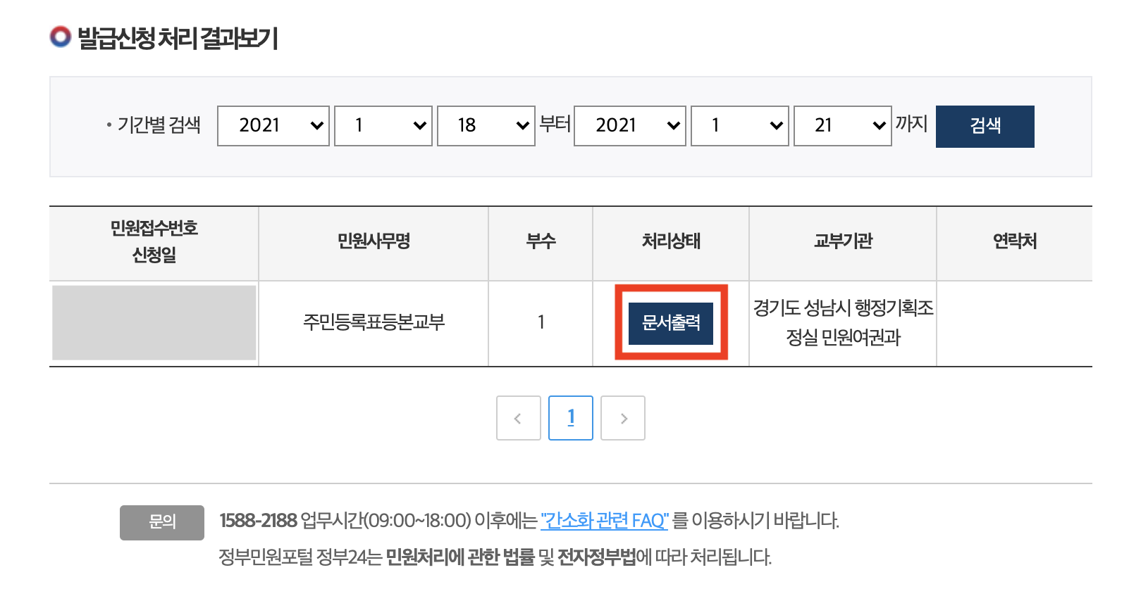 발급신청 처리 결과보기 페이지로 이동하면 민원접수번호, 신청일, 민원사무명, 처리상태, 교부기관을 확인할 수 있다. 처리상태 아래의 문서출력 버튼을 클릭하면 새 창으로 아래와 같은 인쇄화면이 뜬다.