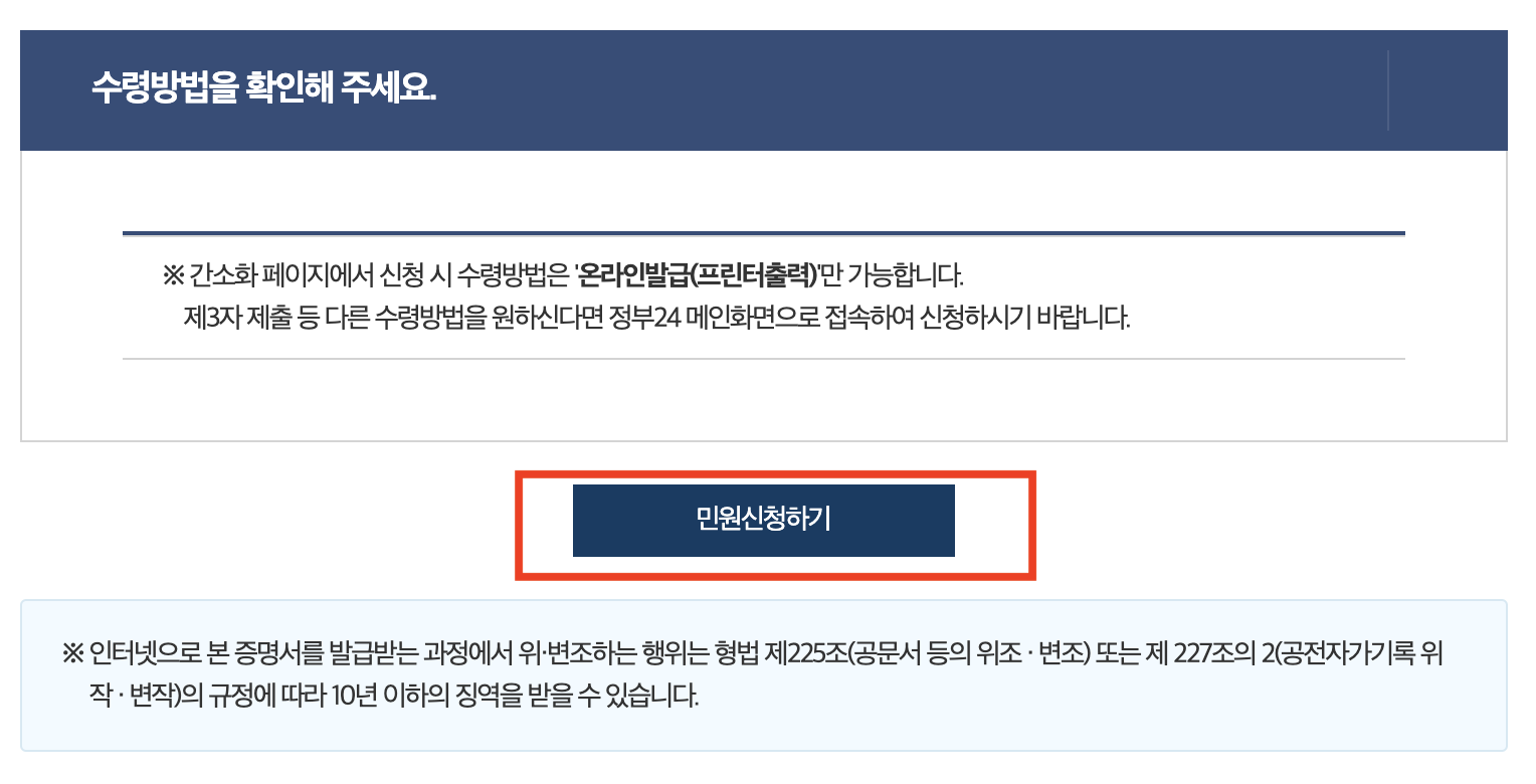 온라인 발급을 받을 것이기 때문에 수령방법은 선택할 수 없다. 민원신청하기 버튼 클릭!