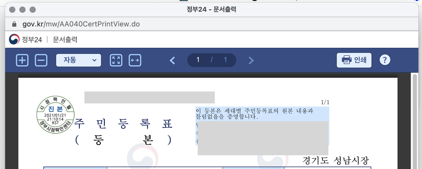 등본 내용을 확인하고 우측 상단의 인쇄 버튼을 클릭하면 미션 클리어! 프린트 지정도 잘 되어있는지 확인하자~