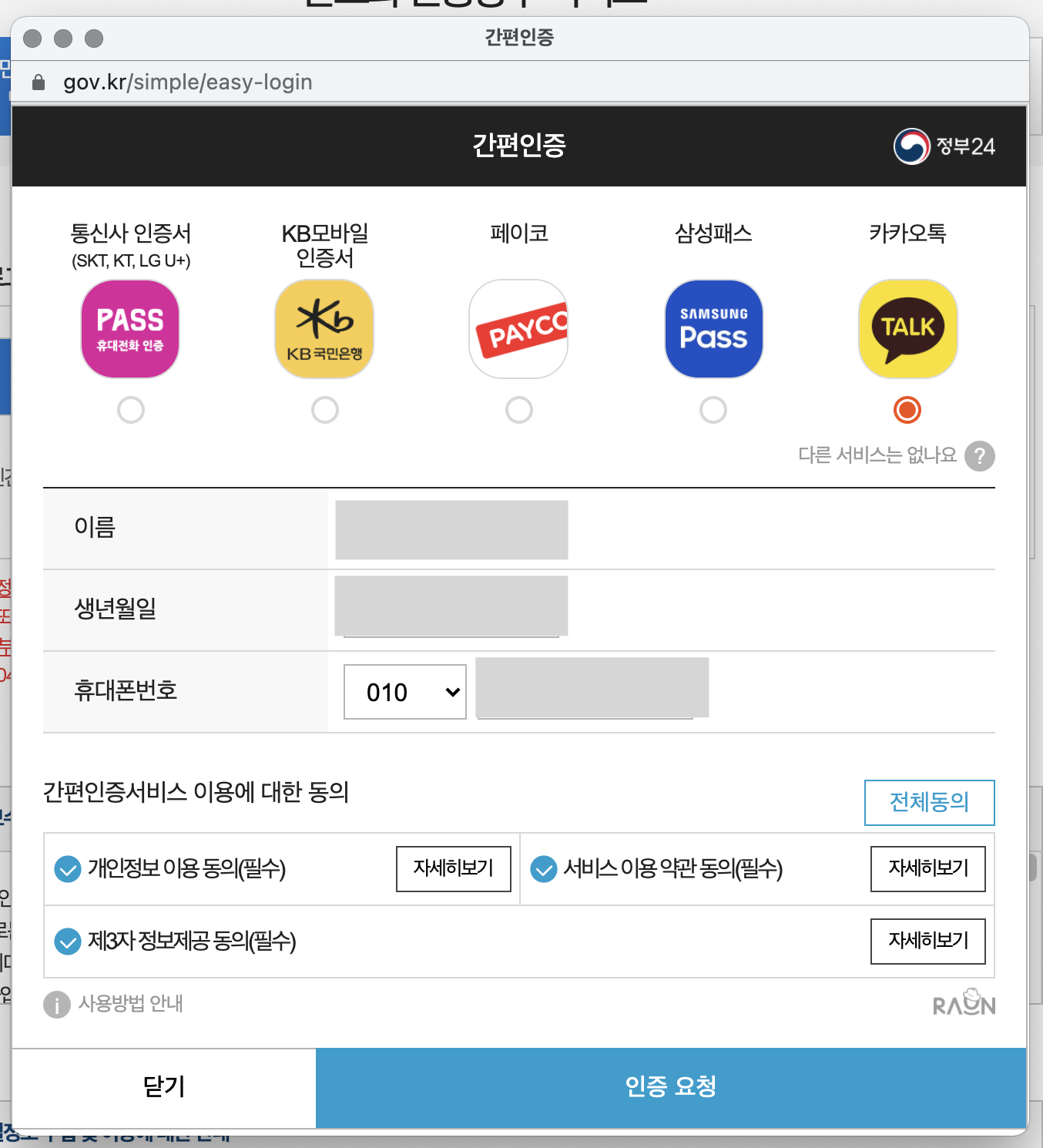 나는 자주 사용하는 카카오를 이용해 민간 전자서명을 진행했다. 카카오로 간편인증을 하기 위해서는 카카오톡에서 지갑을 만들어야 하는데, 왠지 앞으로 자주 사용할 것 같아서 카톡 지갑도 만들어 두었다.
