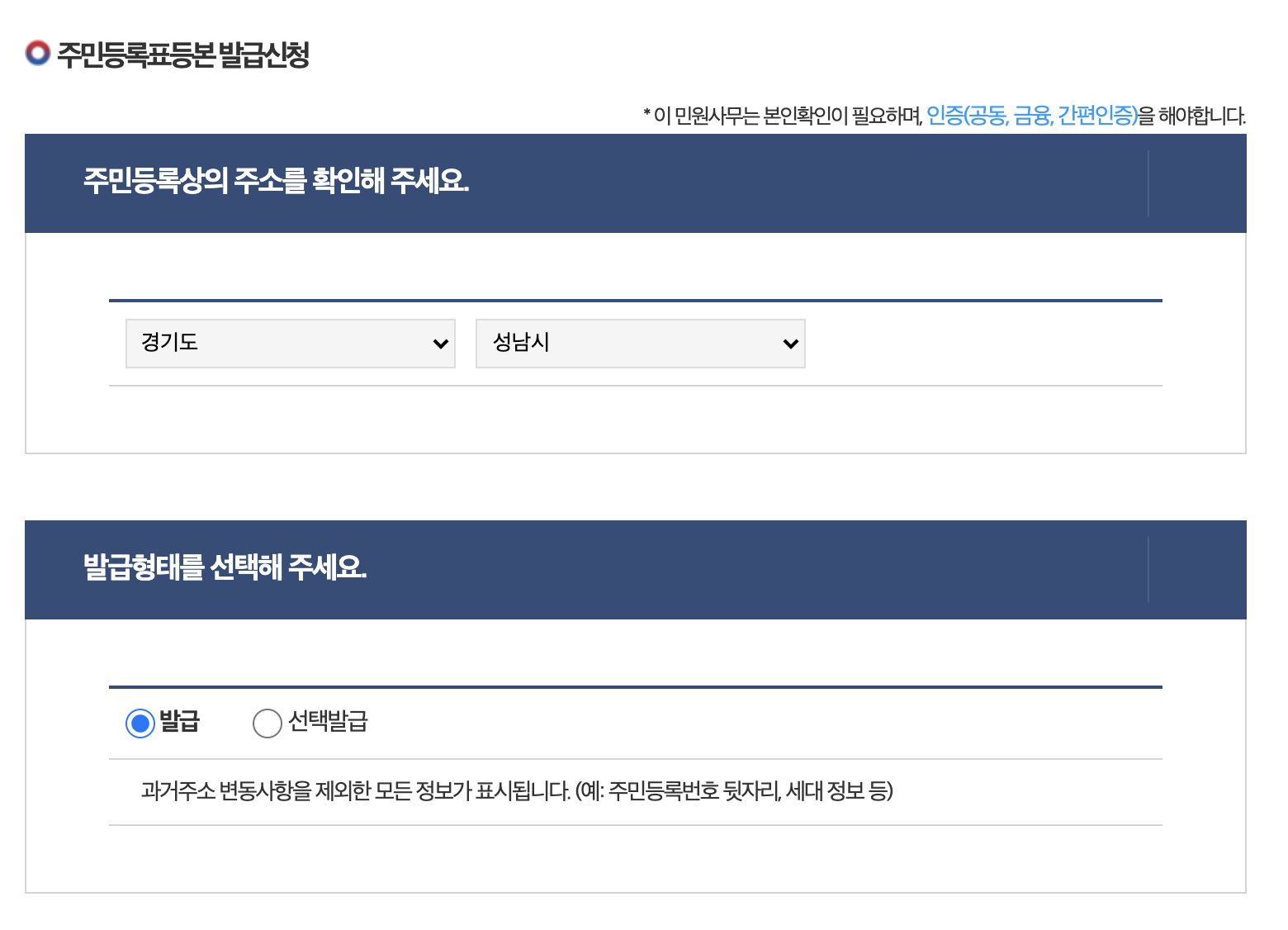 로그인을 마치고 주민등록표등본 발급신청 페이지로 이동하여 주민등록상의 주소지를 확인한다. 자동으로 주소지가 설정되어 있어서 제대로 되어 있는지만 확인하면 된다. 그리고 과거주소 변동사항을 제외한 모든 정보를 표시할 것인지도 선택이 가능하다.