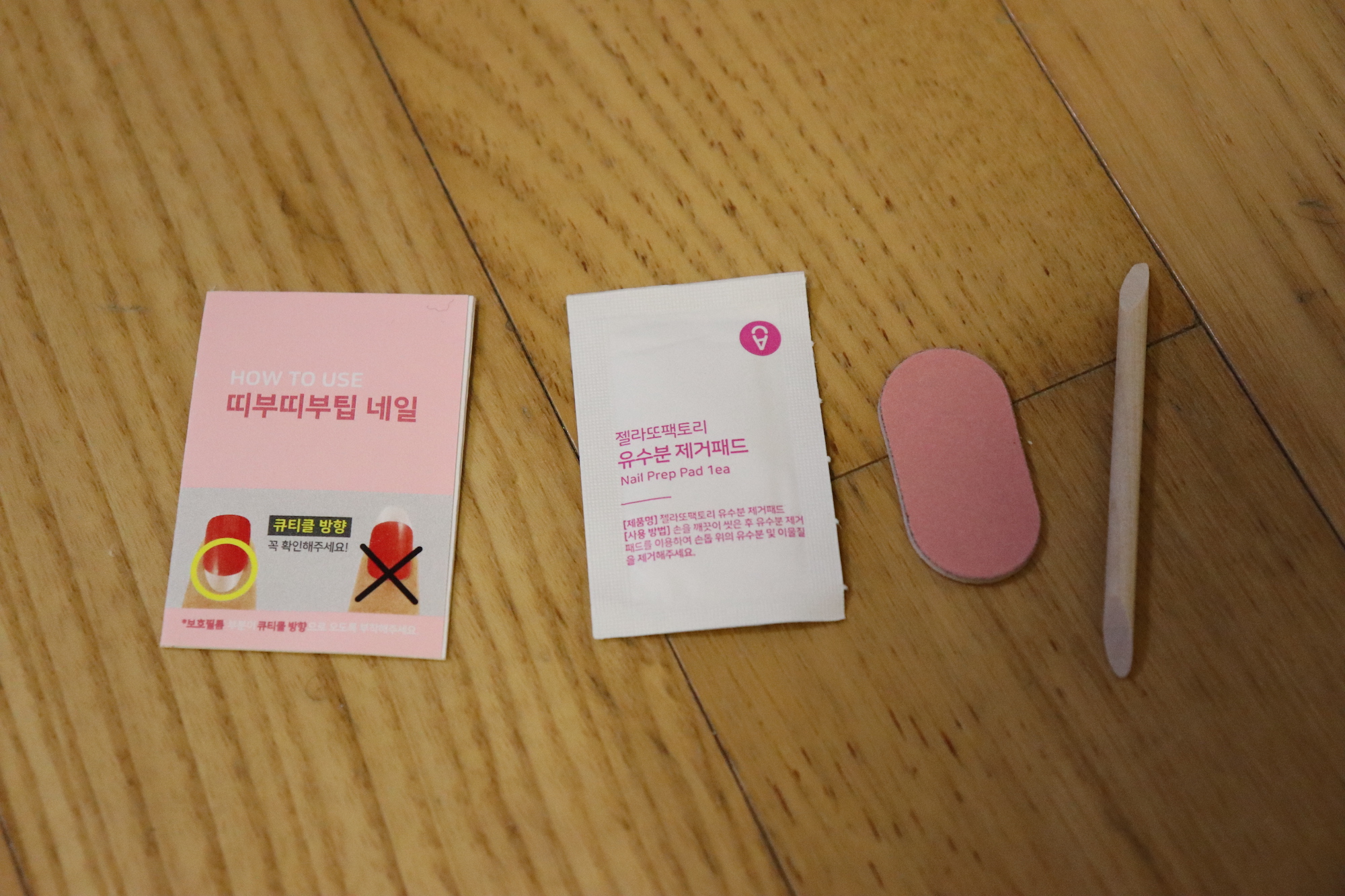 네일팁 36개, 띠부띠부팁 네일 설명서, 유수분 제거패드, 네일파일, 우드스틱으로 구성되어 있다. (데싱디바와 거의 비슷)
