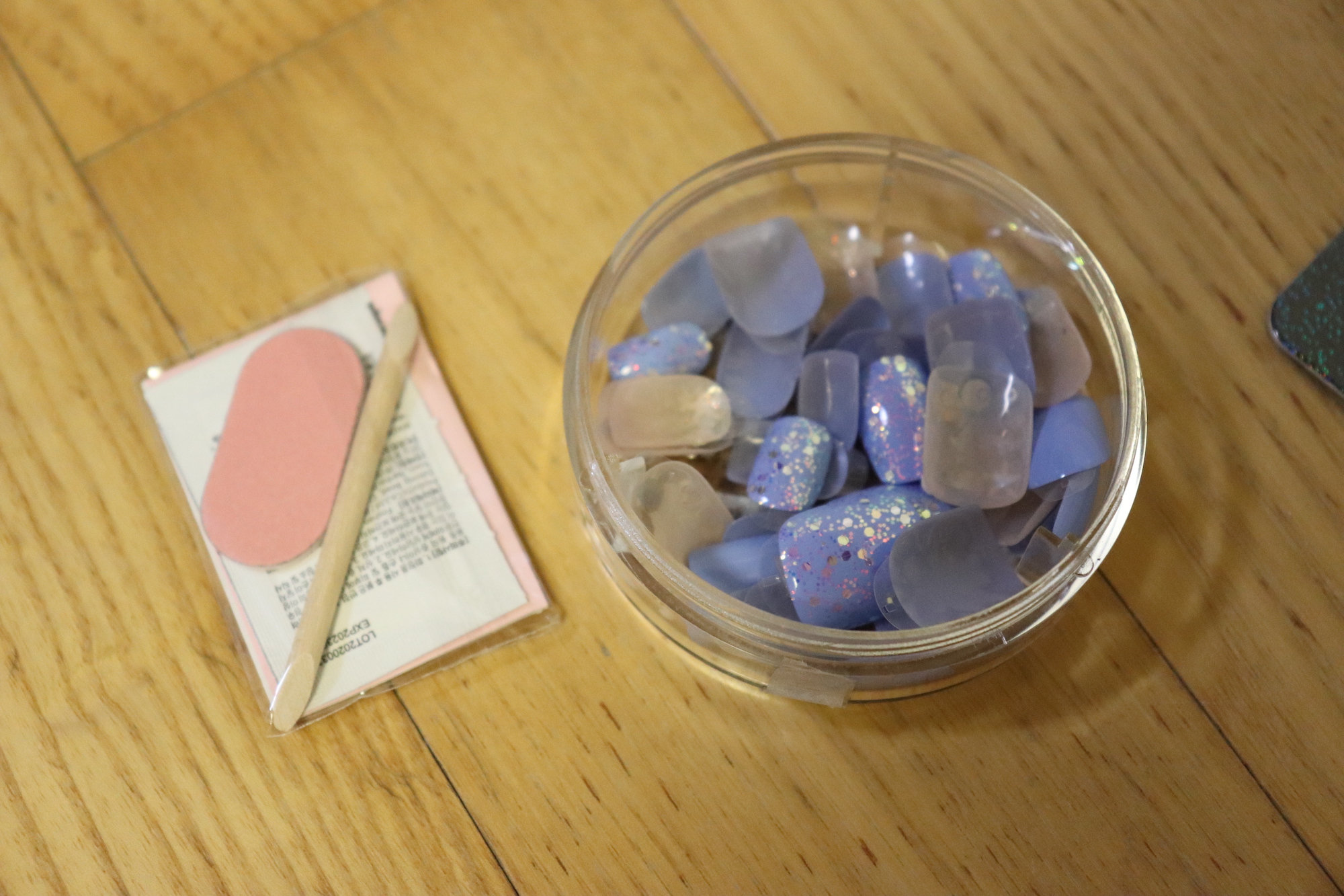 뒷면에는 부착방법과 제거방법, 주의사항들이 소개되어 있다. 뚜껑을 돌려서 여는 방식의 동그란 용기에 들어 있고, 주변의 종이 패키지만 제거하면 악세사리함으로 재활용할 수도 있다. 나는 쓰고 남은 네일팁을 보관하는 용도로 사용 중이다.