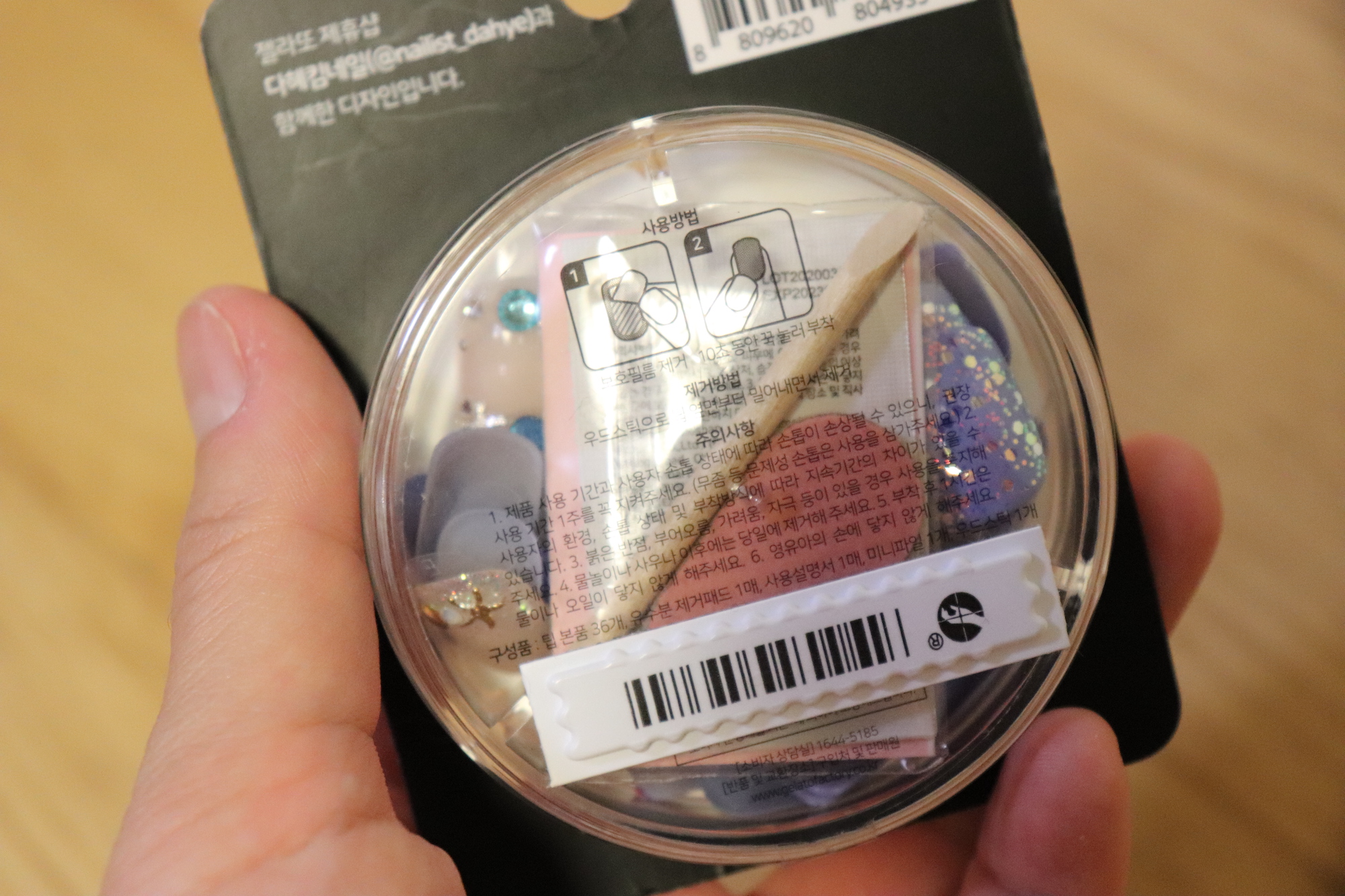 뒷면에는 부착방법과 제거방법, 주의사항들이 소개되어 있다. 뚜껑을 돌려서 여는 방식의 동그란 용기에 들어 있고, 주변의 종이 패키지만 제거하면 악세사리함으로 재활용할 수도 있다. 나는 쓰고 남은 네일팁을 보관하는 용도로 사용 중이다.