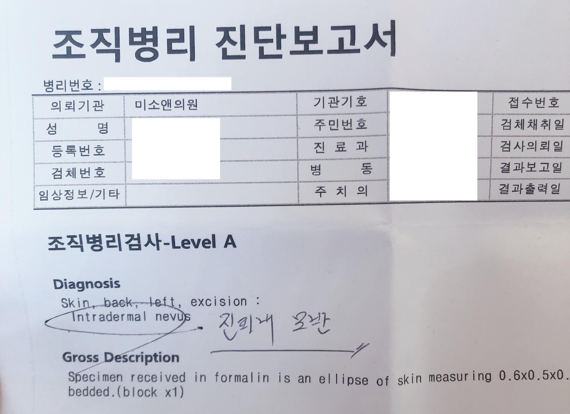 실밥 뽑기 전 선생님께 검사 결과를 들을 수 있었다. 예상했던대로 흑색종은 아니고 진피내 모반이라고 한다. 음, 그러니까 그냥 피부 깊숙하게 침투한 일반 점이라고 생각하면 될 듯 하다. 조직병리 진단보고서도 받았다.