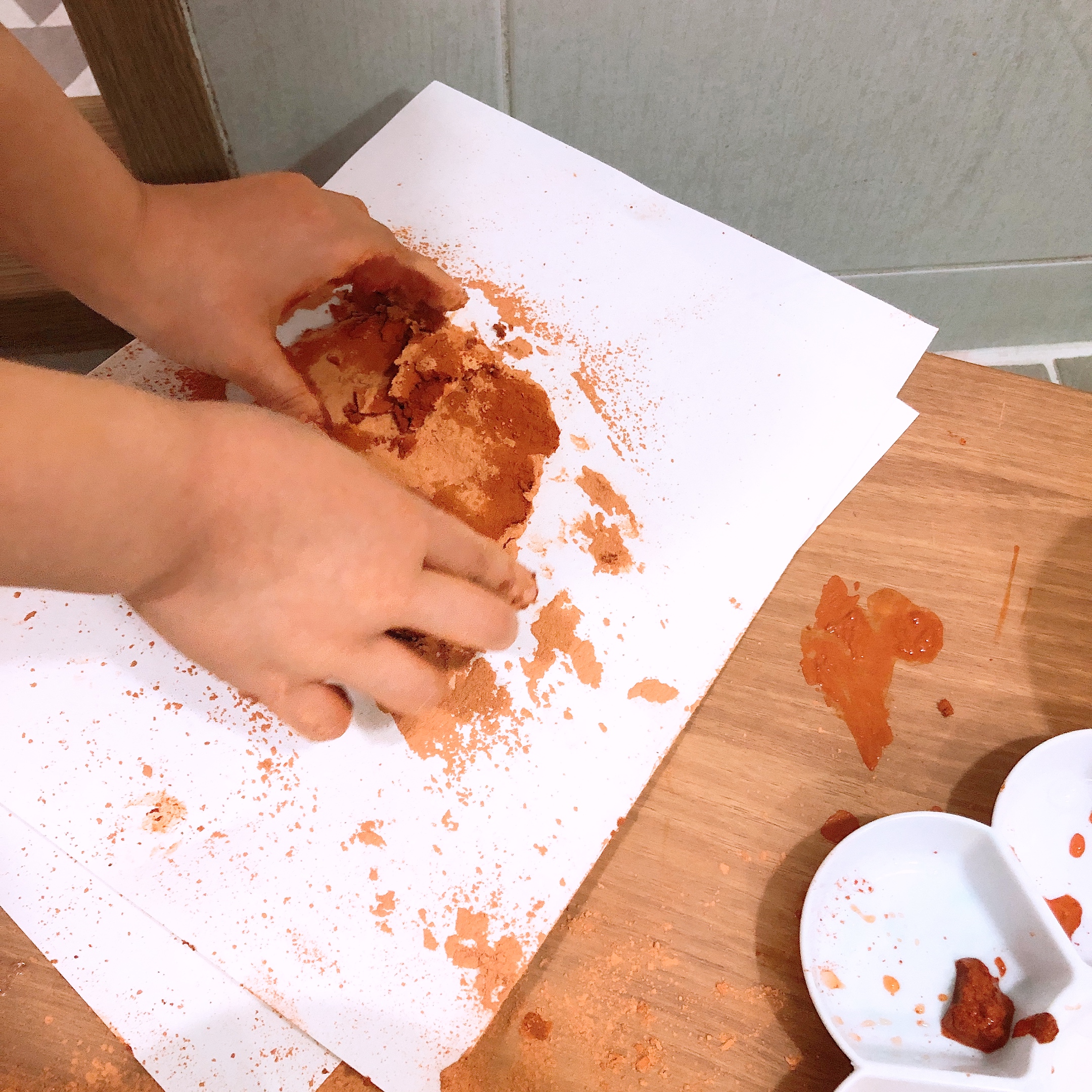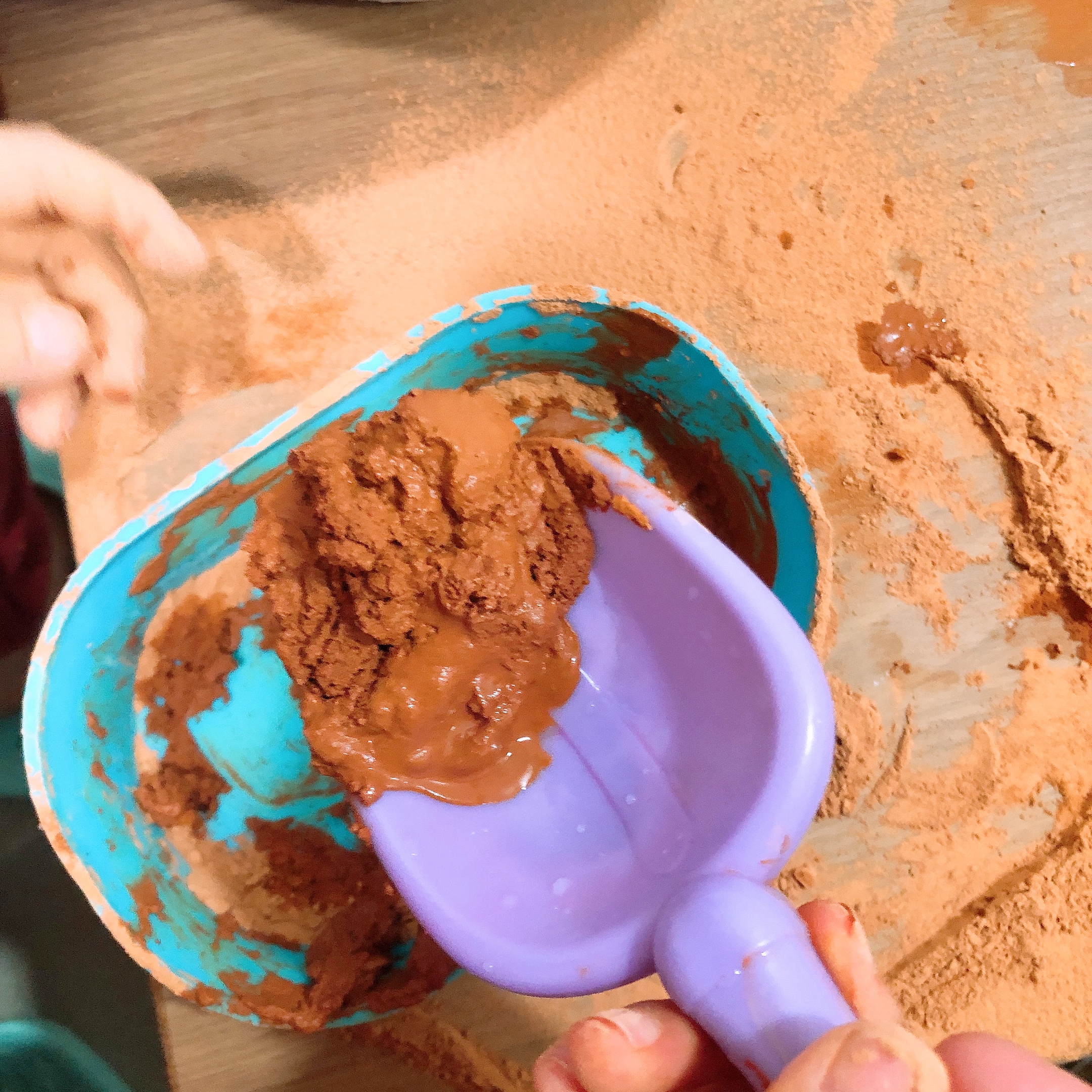 대야에 황토가루를 담고 본격 놀이 시작! 놀이 방법이 적혀있는 가이드를 함께 보내주지만 일단은 아이들이 하고 싶은대로 놀이를 하고, 그대로 따라주는 것이 가장 즐거운 시간을 보낼 수 있는 방법이다.