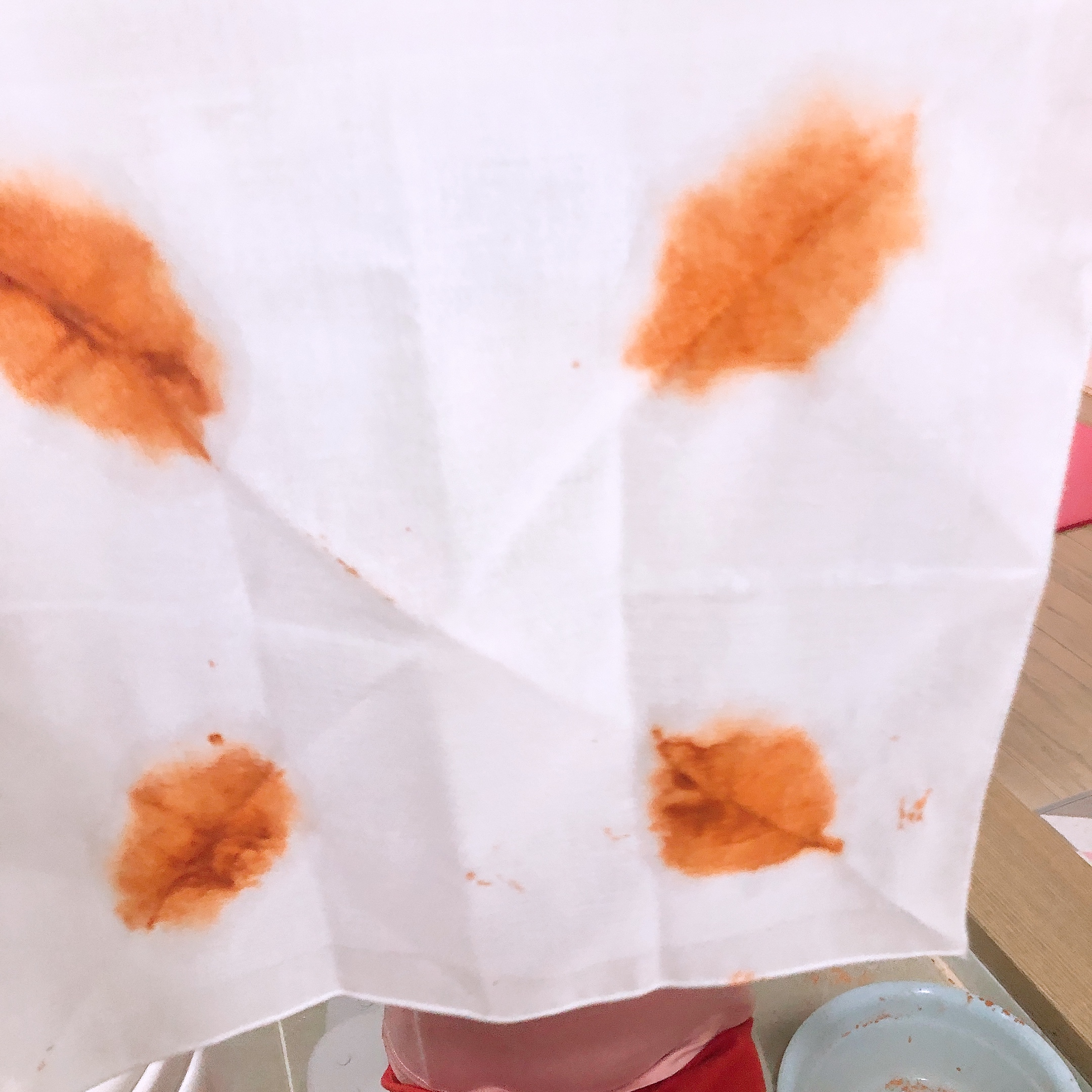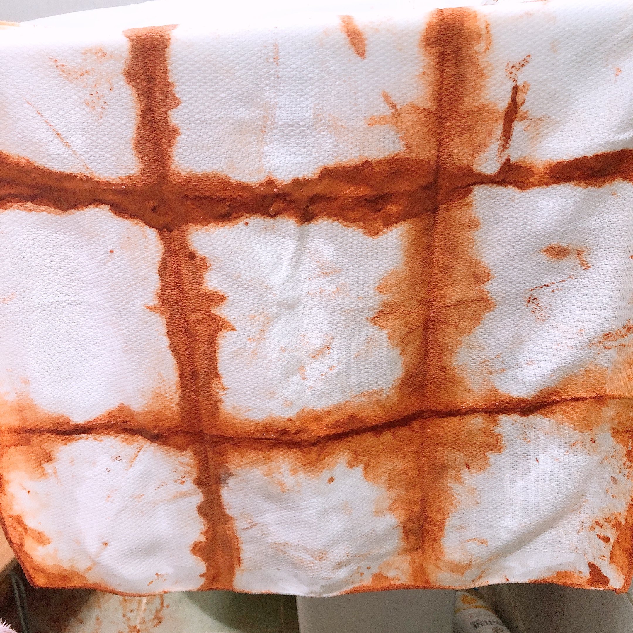 손수건을 접어서 (나는 세모, 하요미는 네모) 황토물에 가장자리를 담갔다 빼니 멋진 패턴을 가진 손수건이 되었다.