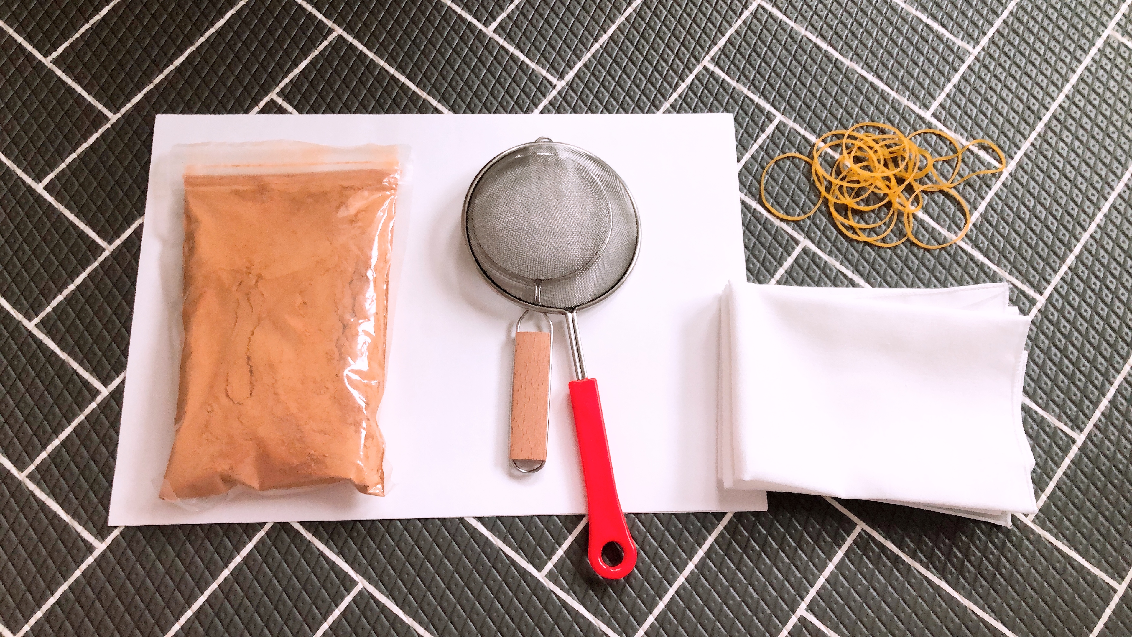 고무줄은 염색 패턴을 만들 때 사용하는 데 우리 아이들은 그냥 손수건을 접어서 황토물에 담그는 걸로 충분했다. 있으면 좋지만 없으면 굳이 구입할 필요는 없을 듯 하다. 오감매트는 나중에 바닥청소를 쉽게 하기 위한 것인데, 큰 비닐이나 돗자리 등으로 대체가 가능하고 우리집에는 매트가 없어서 그냥 화장실에서 놀이했다.