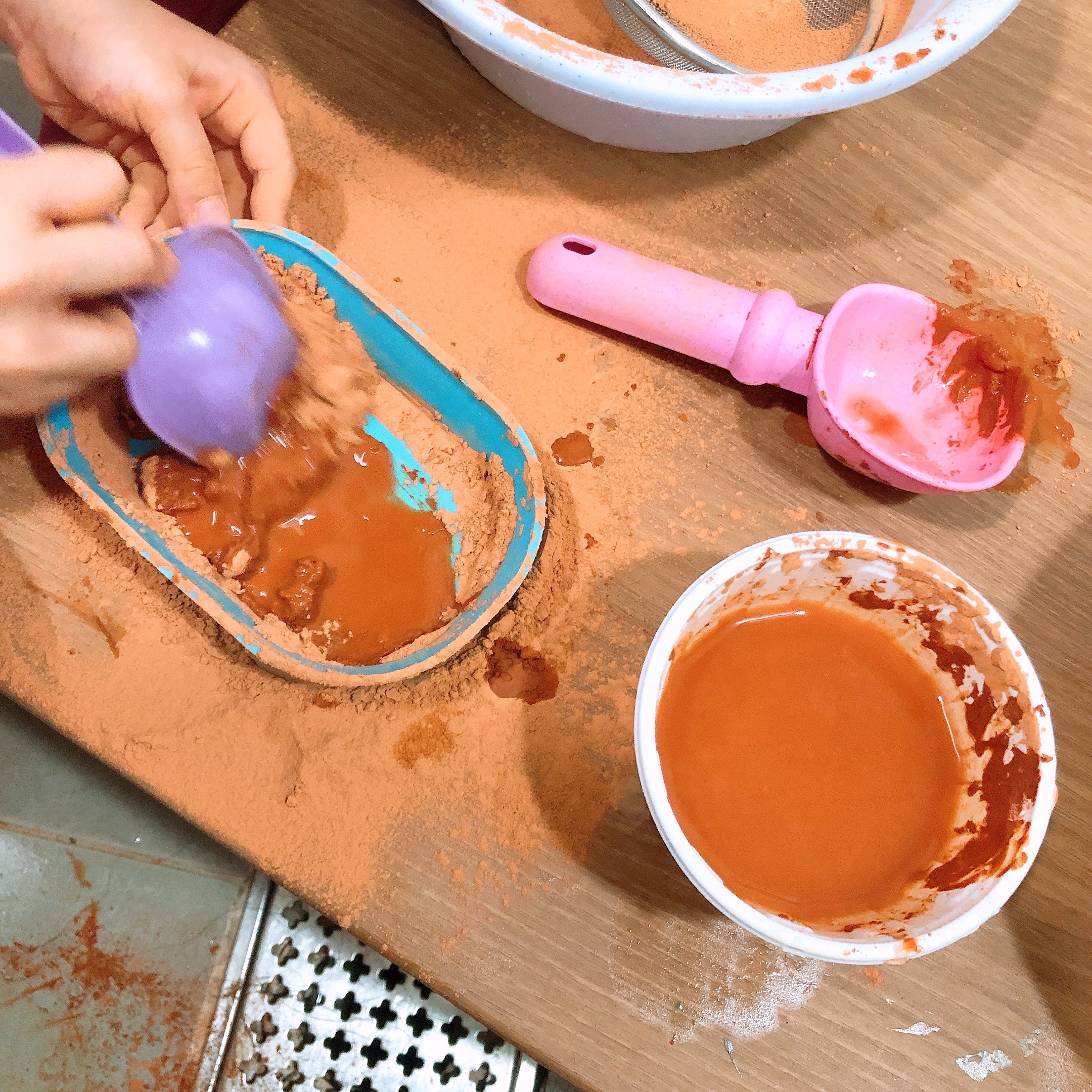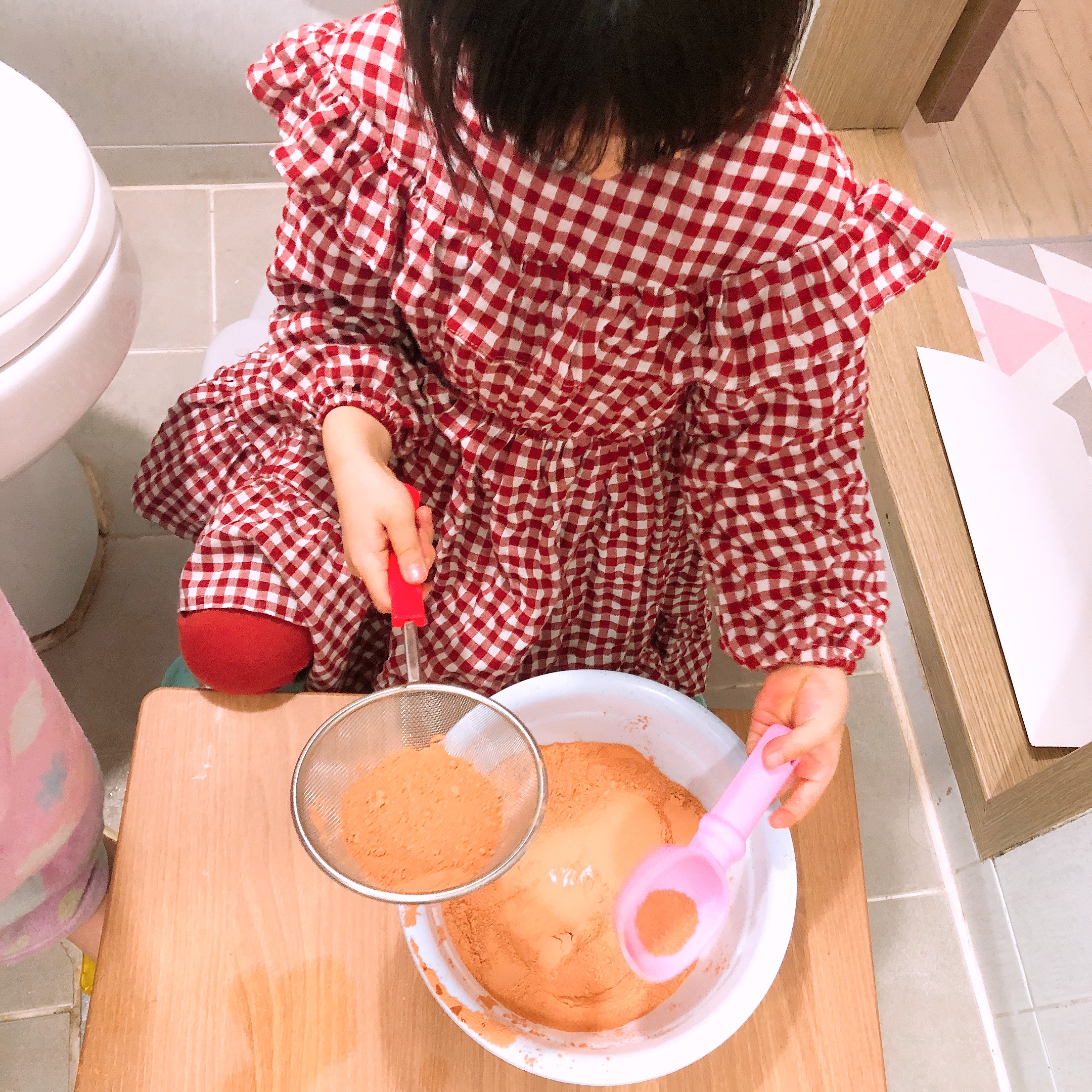 황토가루놀이는 처음 해보는 우리 아이들~ 뜰채와 모래놀이 도구를 이용하여 일단 가루를 탐색한다. 유치원 놀이터에서 뜰채로 고운 모래를 만들며 놀았다고 하는데 역시 황토가루도 뜰채로 내려 고운 가루를 만들어 촉감을 살펴본다. (가루가 손에 묻는 걸 싫어하는 아이의 경우 도구를 이용해 황토놀이를 시작하면 훨씬 수월하게 접근할 수 있다.)