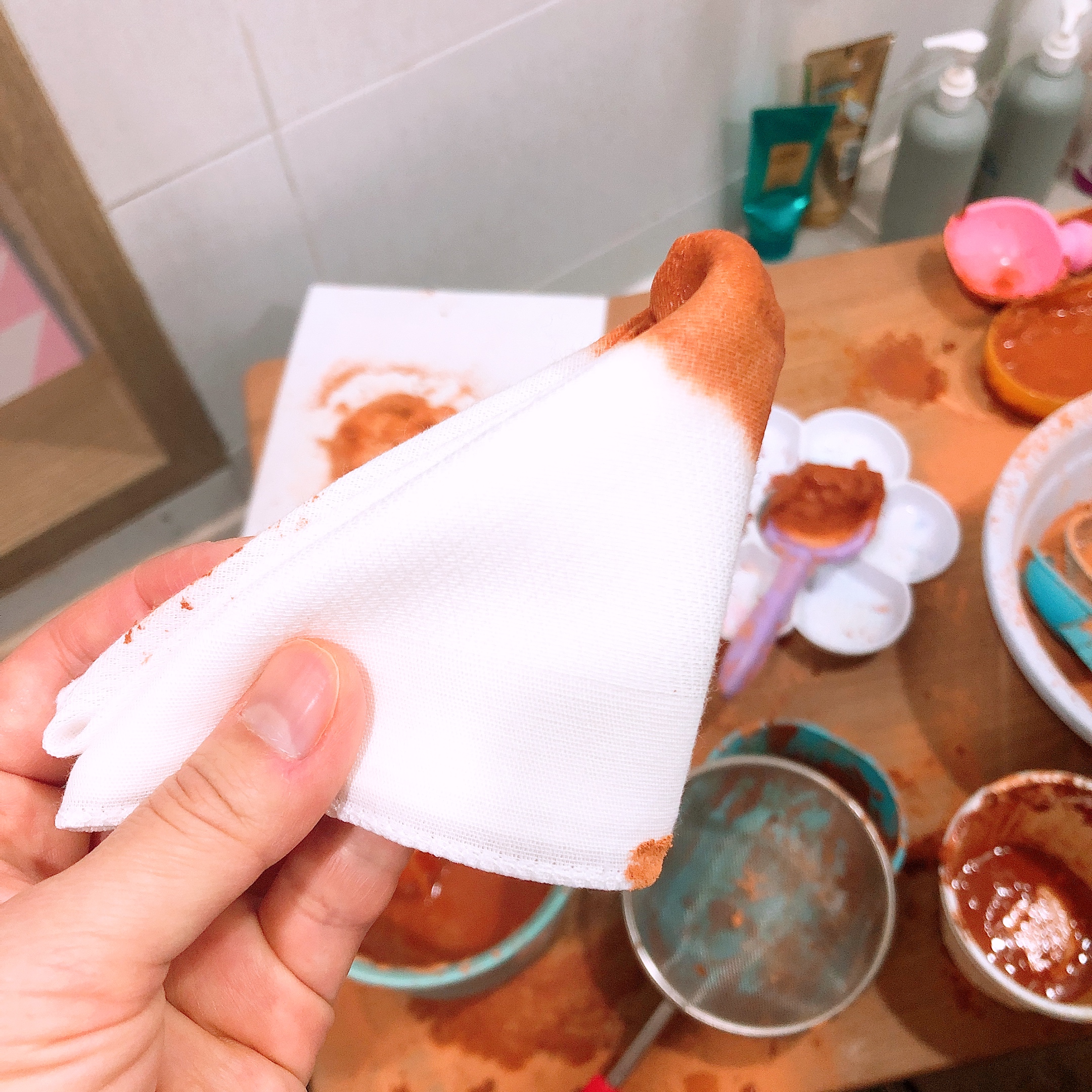 고무줄은 염색 패턴을 만들 때 사용하는 데 우리 아이들은 그냥 손수건을 접어서 황토물에 담그는 걸로 충분했다. 있으면 좋지만 없으면 굳이 구입할 필요는 없을 듯 하다. 오감매트는 나중에 바닥청소를 쉽게 하기 위한 것인데, 큰 비닐이나 돗자리 등으로 대체가 가능하고 우리집에는 매트가 없어서 그냥 화장실에서 놀이했다.