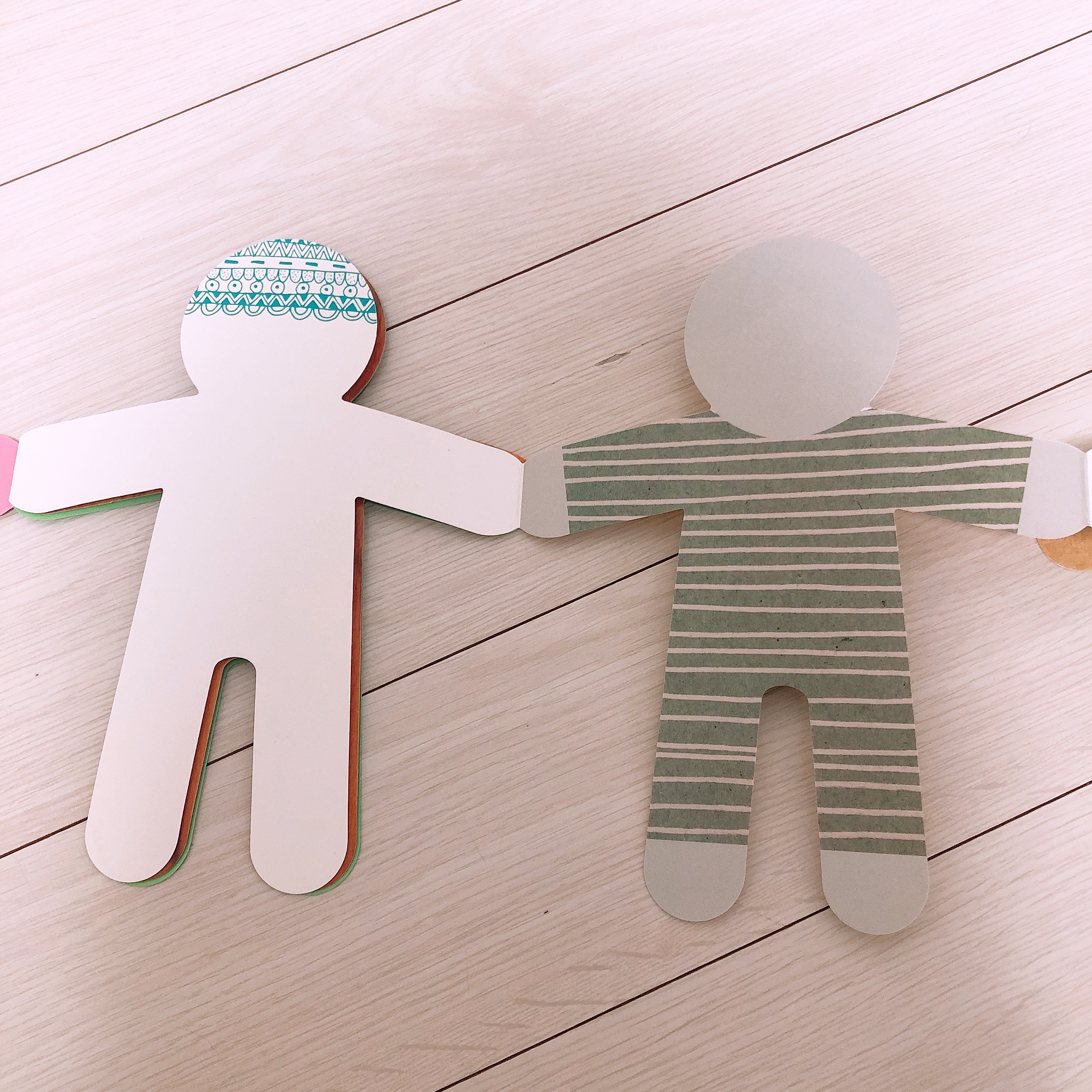 종이 인형은 색상이 정말 다양해서 초록색 얼굴, 노란색 얼굴, 검정색 얼굴도 꾸며볼 수 있었다. 보통 하얀 도화지에 사람을 그리게 되면 우리는 자연스럽게 얼굴을 '살색'으로 색칠하게 되는데 그런 고정관념에서 벗어나 자유롭게 상상할 수 있어서 좋았다. 아이들은 나무 무늬의 종이 인형을 "나무 사람" 이라고 부르기도 했다.