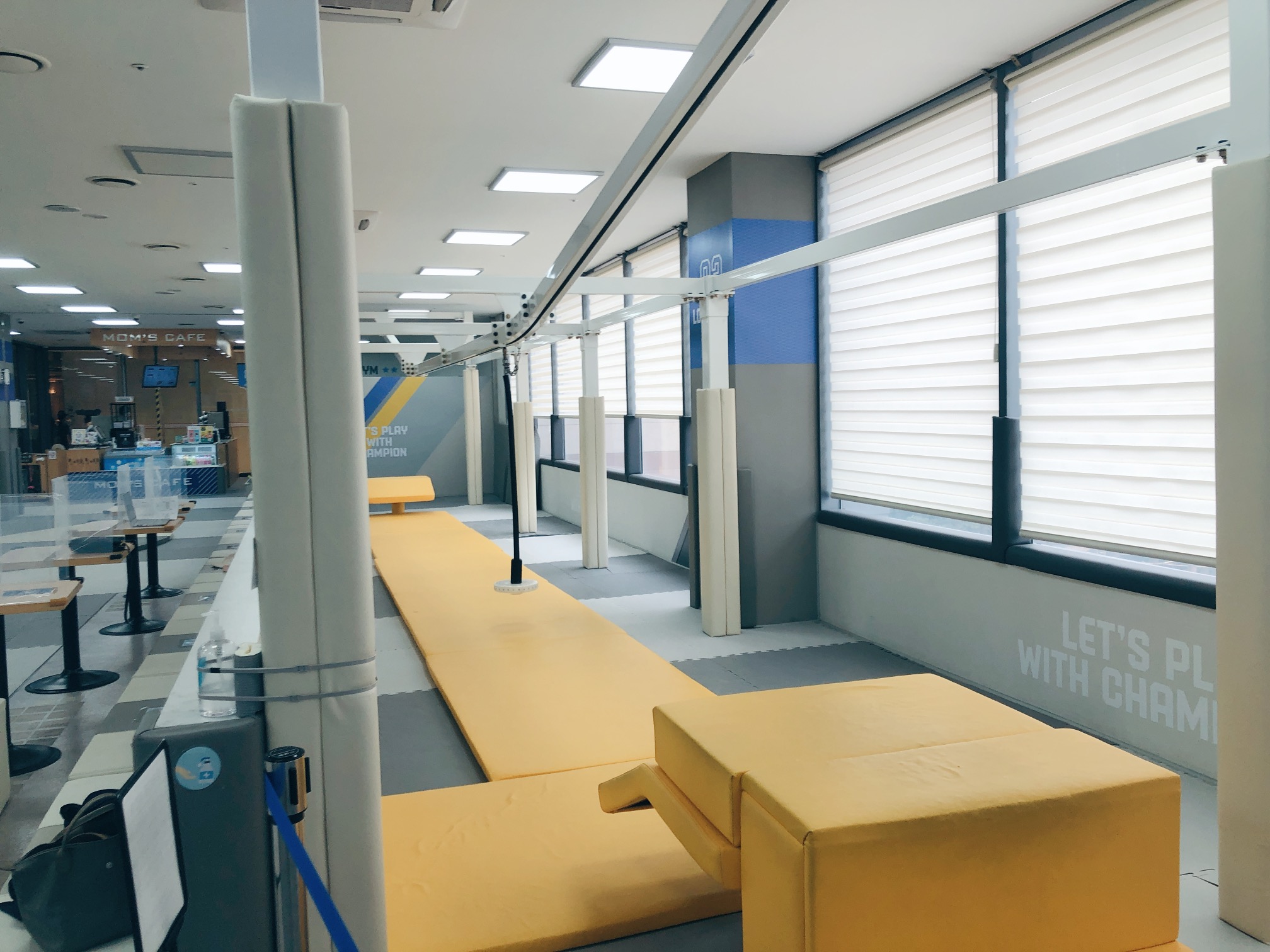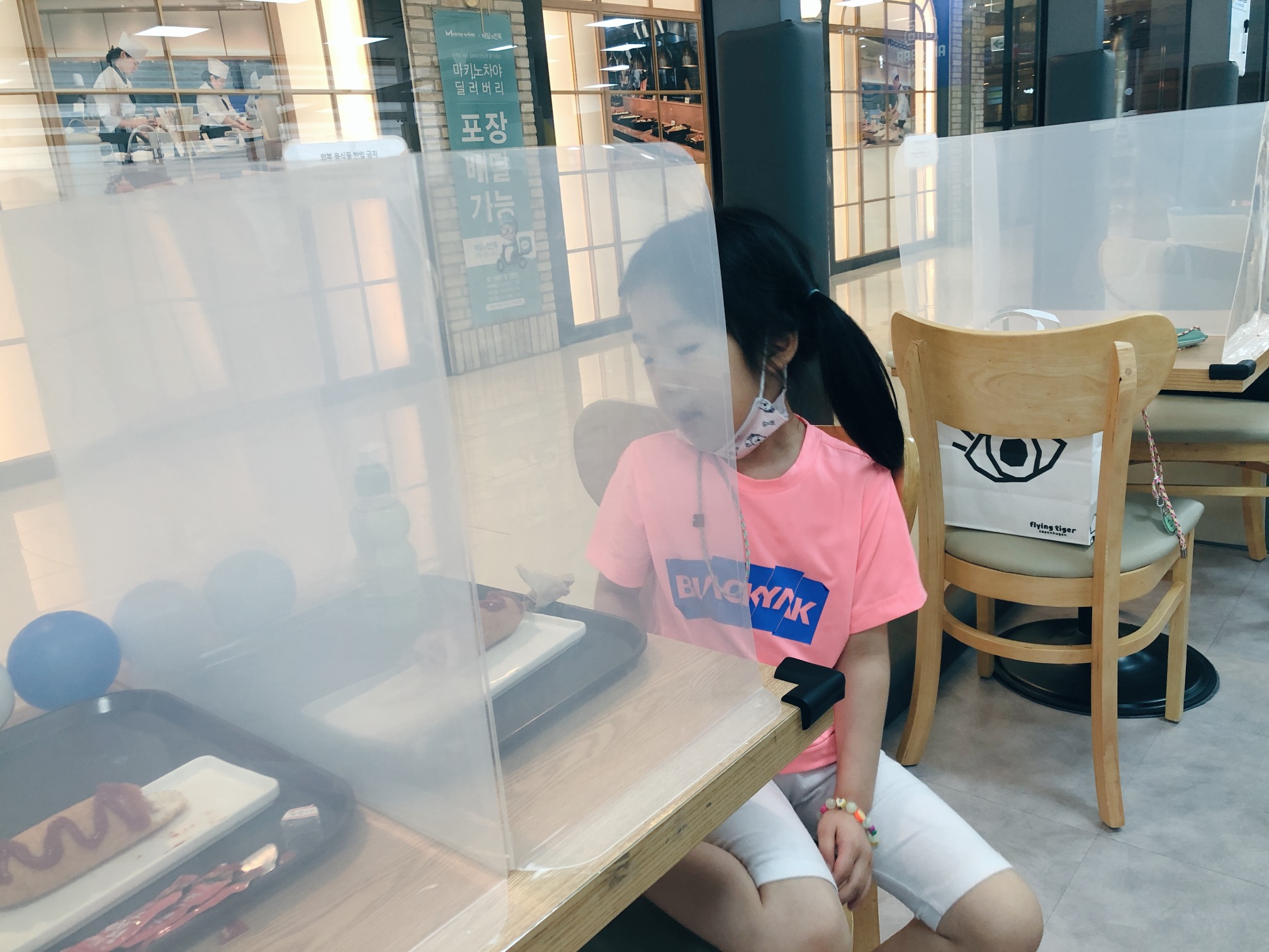 방문 전에 인터넷으로 검색해보니 점심 메뉴가 있었던 것 같은데, 들어와서 메뉴를 시키려고 보니까 식사 메뉴가 없었다. 직원분께 문의하니 자체적으로 카페를 운영하게 되었다고 한다. 우리는 키즈카페 안에서 점심을 먹을 생각으로 왔기 때문에 잠시 당황했지만, 간식 메뉴가 몇가지 있어서 아쉬운대로 핫도그로 배를 채우기로 했다. 챔피언 키즈카페는 코로나에 대비하여 칸막이가 정말 잘 설치되어 있다. 철저한 위생관리를 하고 있는 듯 하여 안심하고 음식과 음료를 먹을 수 있었다.