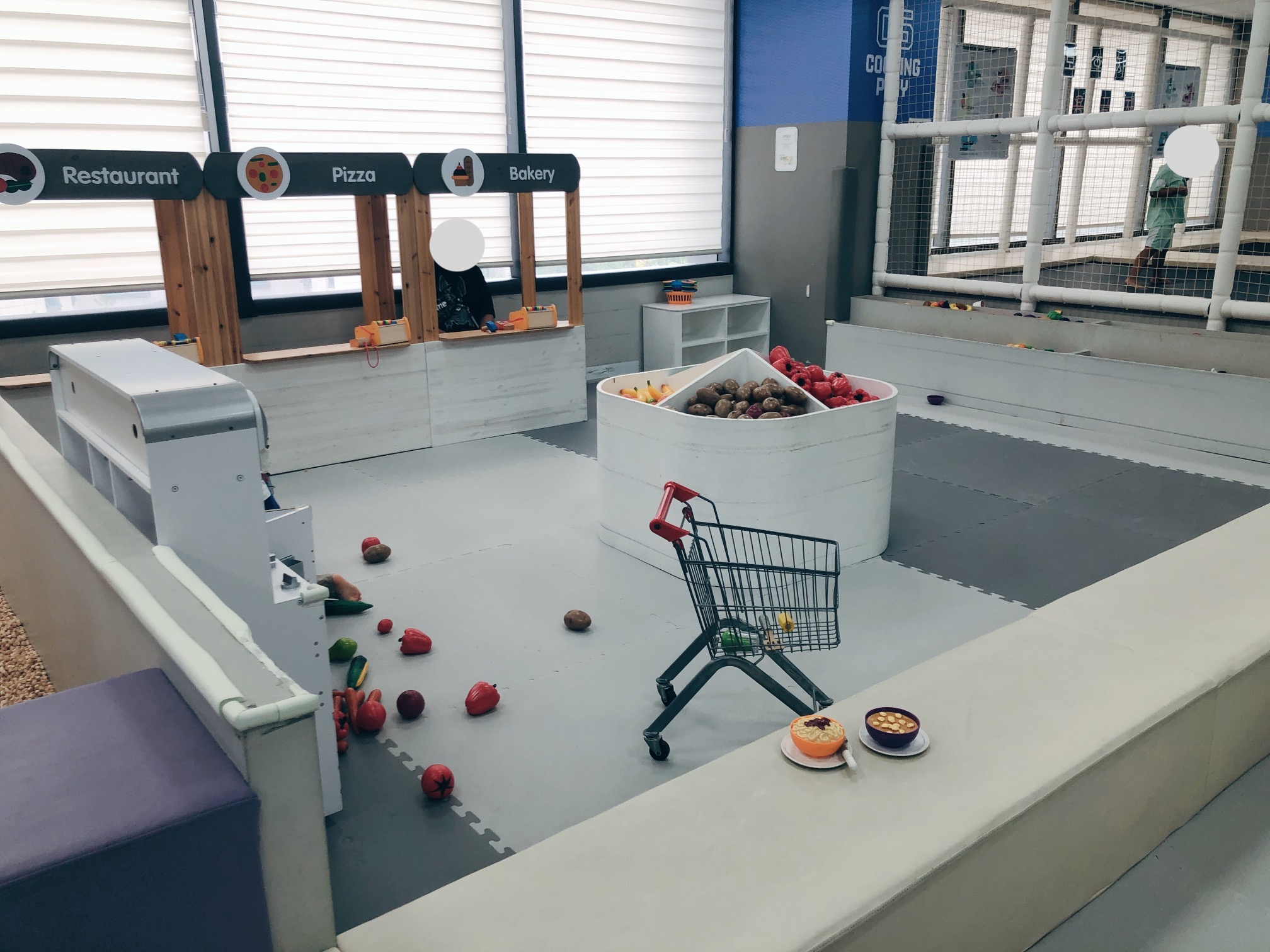 그 옆으로는 주방놀이를 할 수 있는 공간이 마련되어 있다. 챔피언 키즈카페에서 (그나마) 유일하게 정적으로 놀이하는 공간인 것 같다. 여섯살 둘째는 친구를 사귀어서 재미있게 마트 놀이를 했다. 친구와 같이 온 아버지께서 실제 카드를 주셔서 카드 결제도 했다...ㅋㅋㅋ