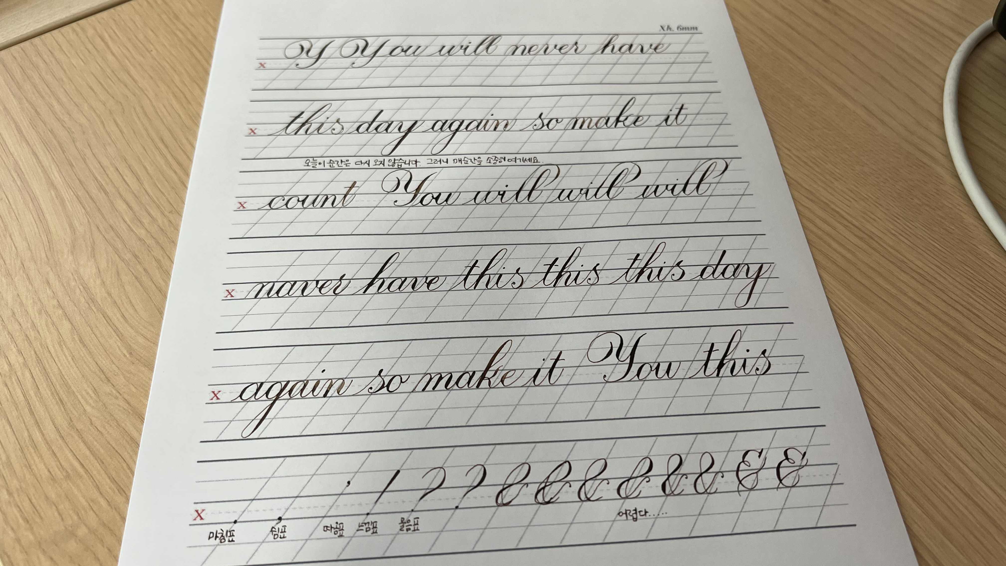 마침표(.)와 쉼표(,)를 어떻게 사용하는지 답변을 받아서 그것도 함께 연습해 보았다. 마침표, 쉼표, 따옴표, 느낌표, 물음표 까지는 어떻게 써보겠는데 그리고(&) 모양과 각도가 너무 어려워서 헤매고 있는 중이다. 이것도 다음 연습 때 익숙해질때까지 반복해보기로...!