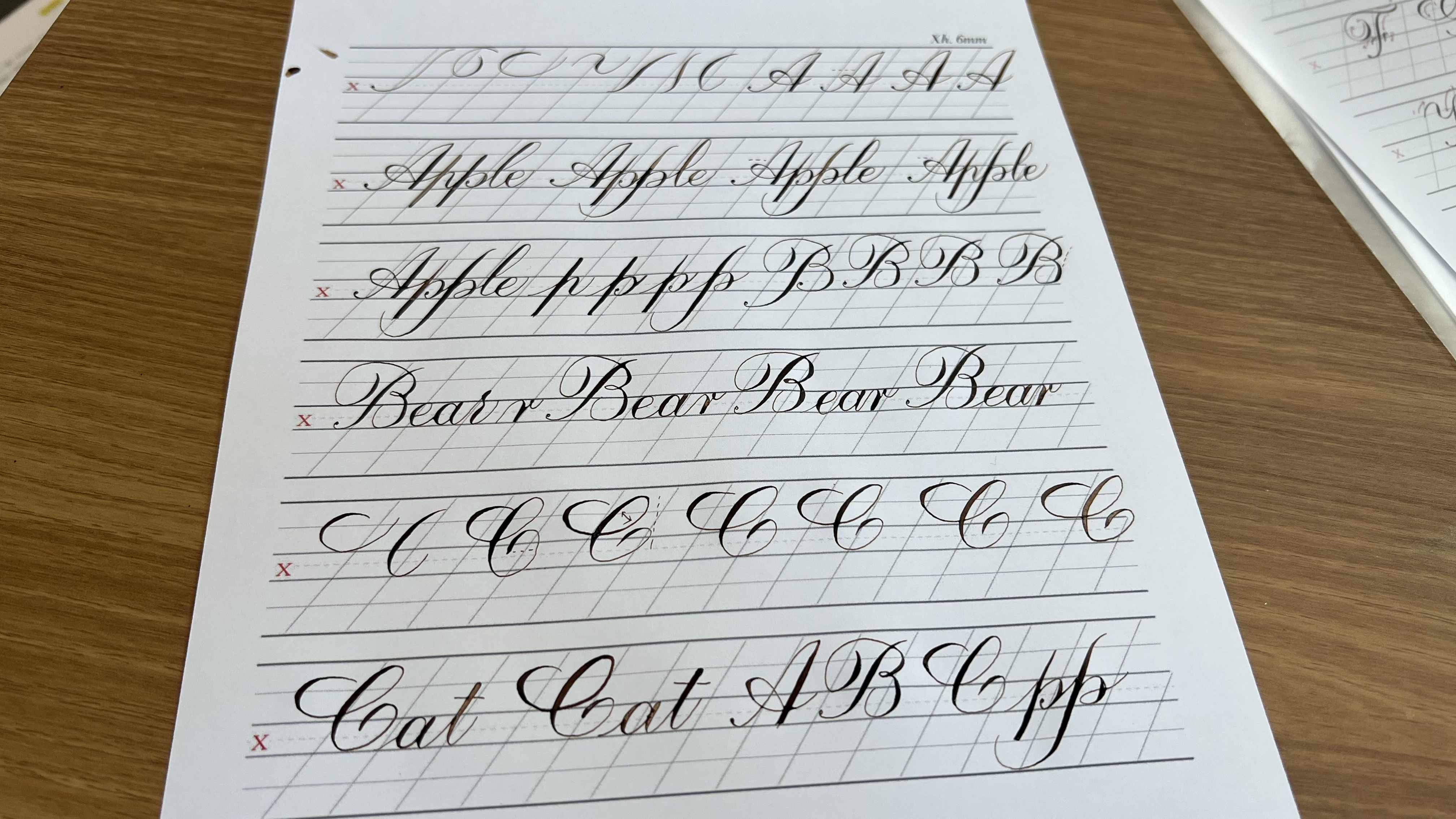 A로 시작하는 단어 Apple에 더블레터 pp가 있어서 그것도 함께 손에 익혔다. 더블레터를 연습하다보면 카퍼플레이트 다음 과정인 스펜서리언도 얼른 공부하고 싶다는 생각이 드는데... 카퍼플레이트보다 화려하고 곡선이 많은 스펜서리언의 특성상 지금 쓰는 글씨를 손에 제대로 익히지 않고 무작정 시작하면 제대로 된 모양이 나오지 않을 듯 하여 꾹 참고 있는 중이다.